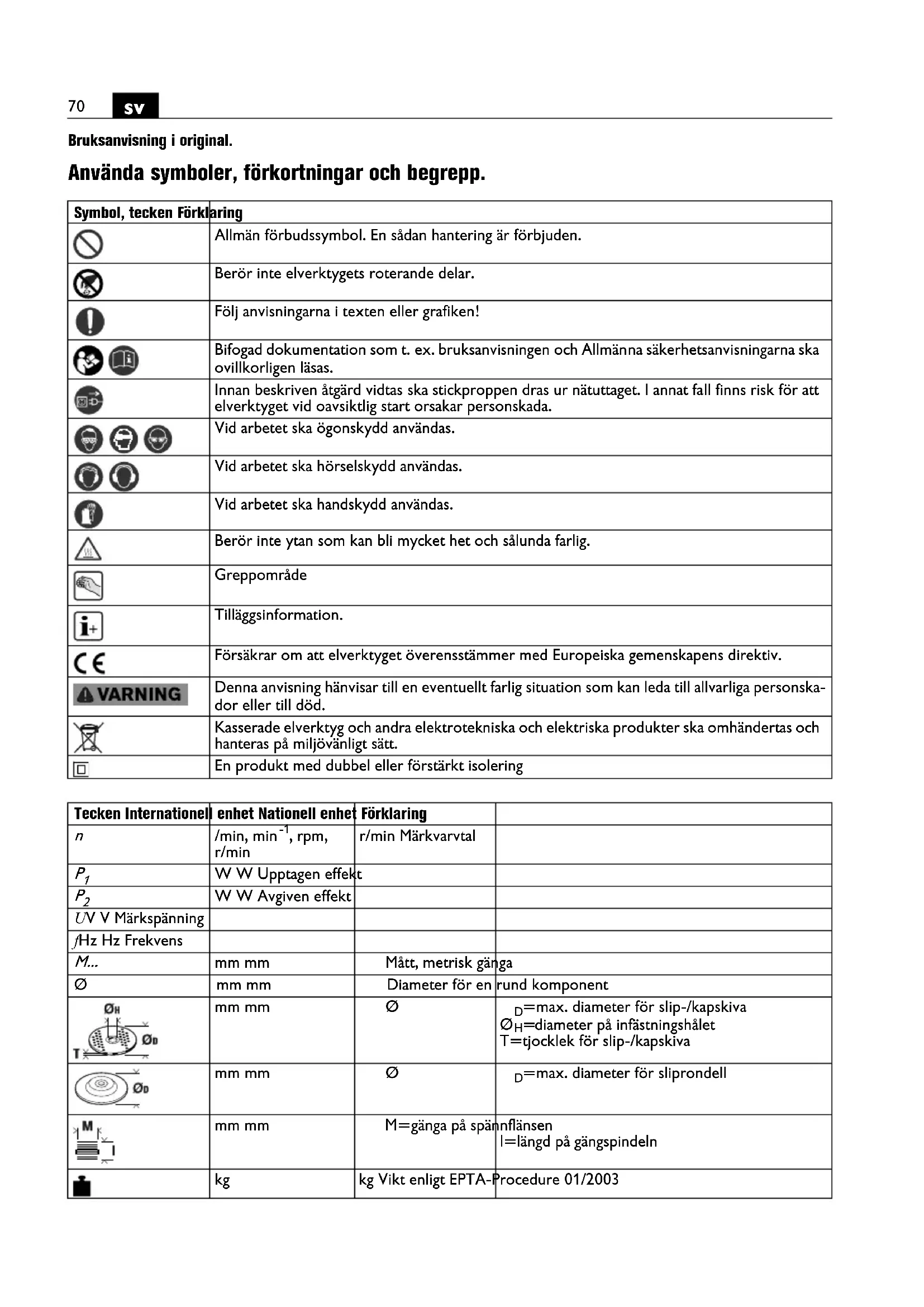 Bruksanvisning i original. Använda symboler, förkortningar och begrepp. Symbol, tecken Förklaring Allmän förbudssymbol. En sådan hantering är förbjuden. Berör inte elverktygets roterande delar. Följ anvisningarna i texten eller grafiken! Bifogad dokumentation som t. ex. bruksanvisningen och Allmänna säkerhetsanvisningarna ska ovillkorligen läsas. Innan beskriven åtgärd vidtas ska stickproppen dras ur nätuttaget. I annat fall finns risk för att elverktyget vid oavsiktlig start orsakar personskada. Vid arbetet ska ögonskydd användas. Vid arbetet ska hörselskydd användas. Vid arbetet ska handskydd användas. Berör inte ytan som kan bli mycket het och sålunda farlig. Greppområde Tilläggsinformation. Försäkrar om att elverktyget överensstämmer med Europeiska gemenskapens direktiv. Denna anvisning hänvisar till en eventuellt farlig situation som kan leda till allvarliga personska- dor eller till död. Kasserade elverktyg och andra elektrotekniska och elektriska produkter ska omhändertas och hanteras på miljövänligt sätt. En produkt med dubbel eller förstärkt isolering Tecken Internationell enhet Nationell enhet Förklaring