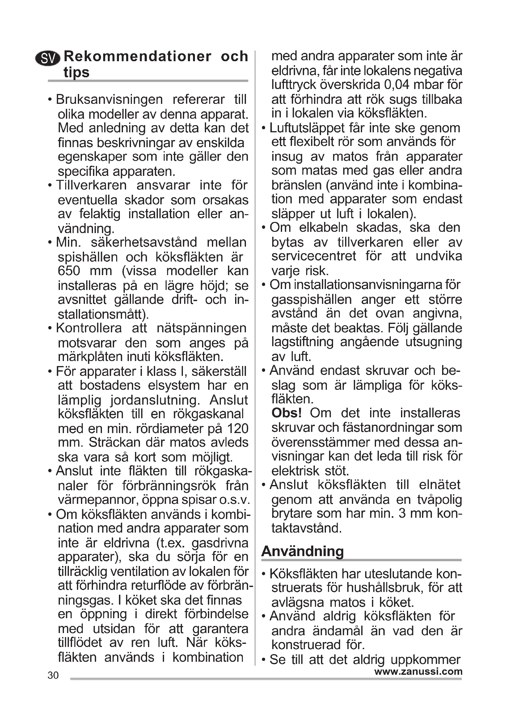 - Se till att det aldrig uppkommer SV31 www.zanussi.com höga lågor under köksäkten när den är igång.