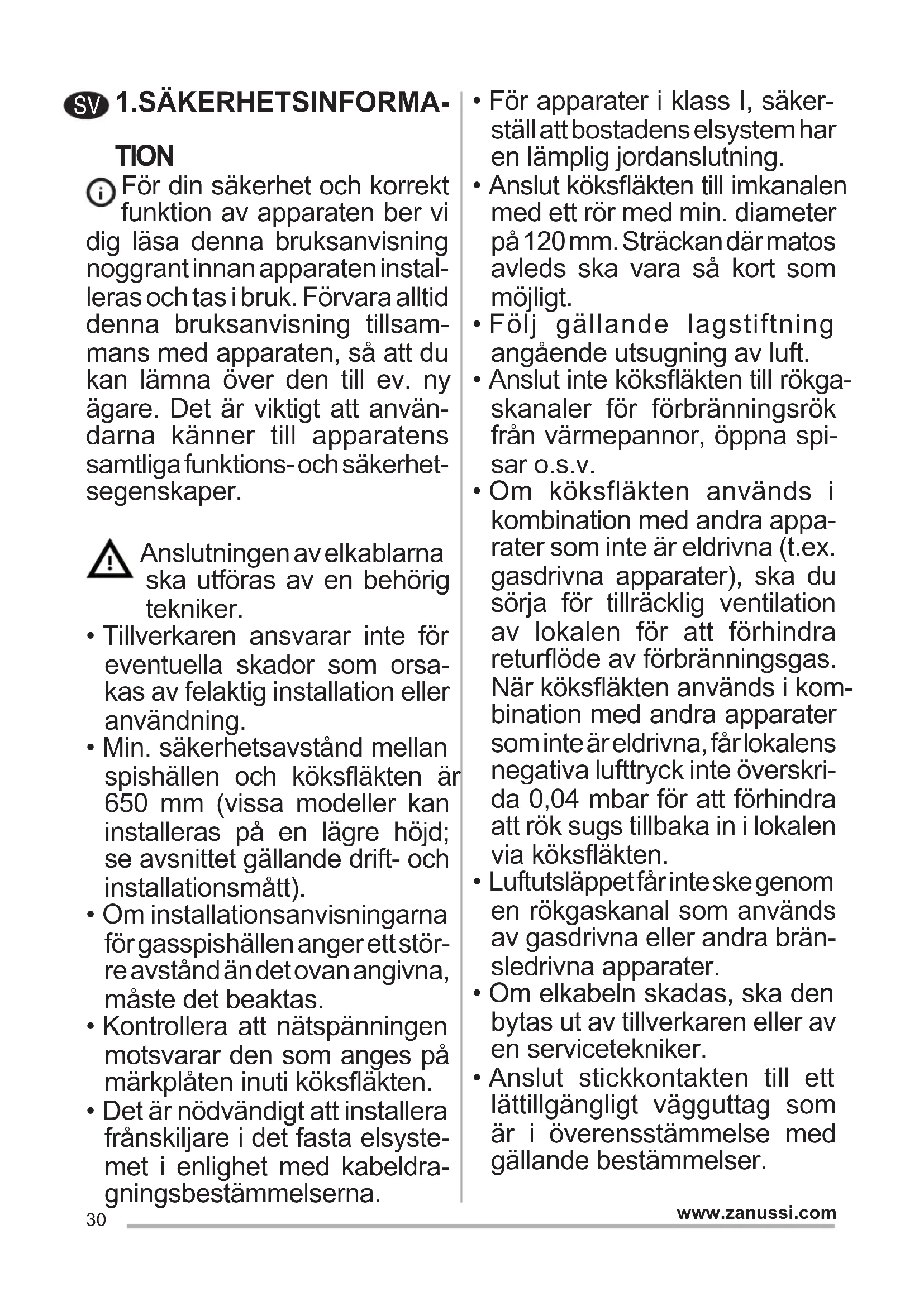 Lampada Assorbimento (W) Attacco Voltaggio (V) Dimensione (mm) Codice ILCOS 4 E14 220-240 107 x 37 DRBB/F-4-220-240-E14-35/10030 www.zanussi.com 1.SÄKERHETSINFORMA- TION För din säkerhet och korrekt funktion av apparaten ber vi dig läsa denna bruksanvisning noggrant innan apparaten instal- leras och tas i bruk. Förvara alltid denna bruksanvisning tillsam- mans med apparaten, så att du kan lämna över den till ev. ny ägare. Det är viktigt att använ- darna känner till apparatens samtliga funktions- och säkerhet- segenskaper. Anslutningen av elkablarna ska utföras av en behörig tekniker.