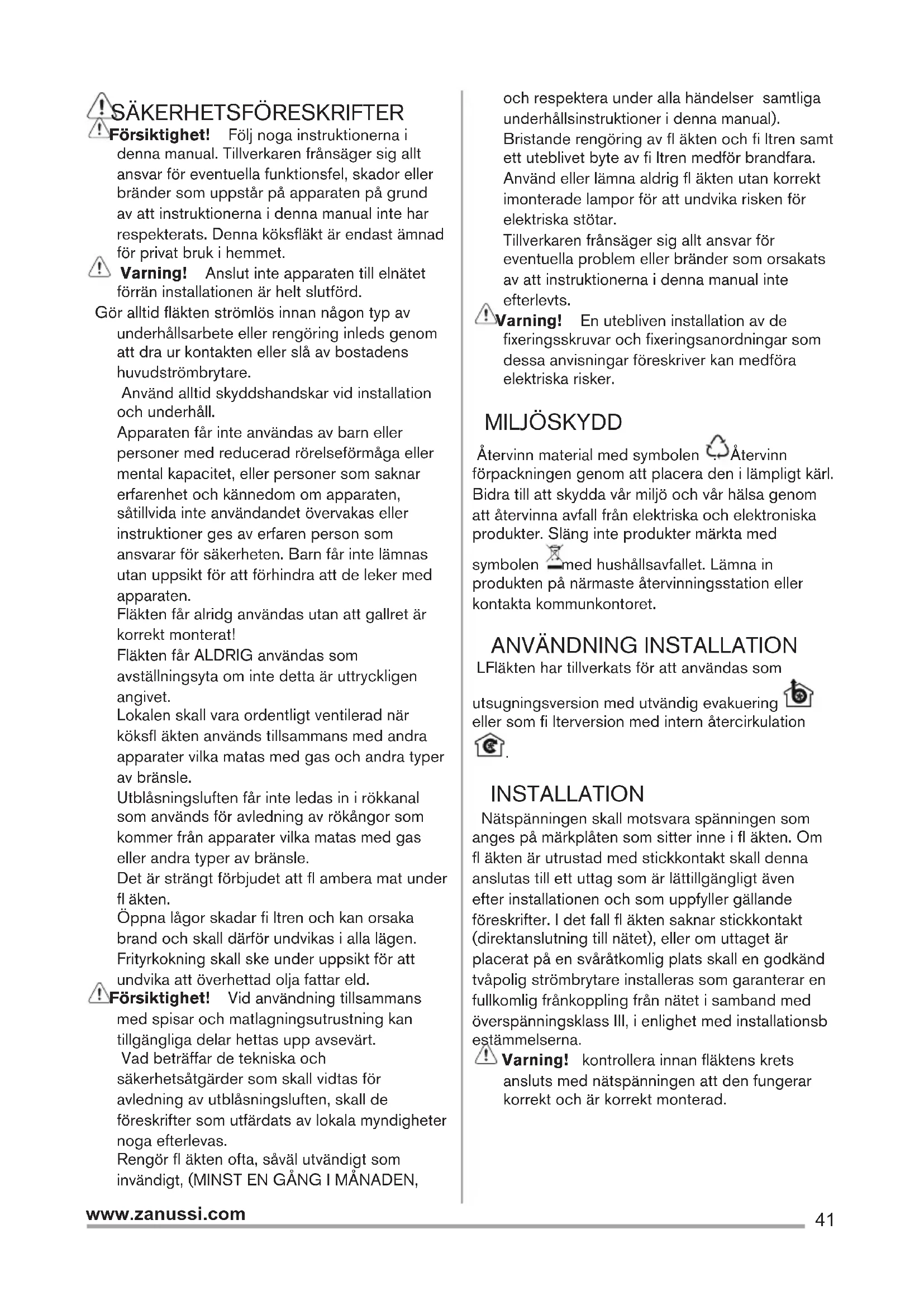 Försiktighet! Följ noga instruktionerna i denna manual. Tillverkaren frånsäger sig allt ansvar för eventuella funktionsfel, skador eller bränder som uppstår på apparaten på grund av att instruktionerna i denna manual inte har respekterats. Denna köksfläkt är endast ämnad för privat bruk i hemmet. Varning! Anslut inte apparaten till elnätet förrän installationen är helt slutförd. Gör alltid fläkten strömlös innan någon typ av underhållsarbete eller rengöring inleds genom att dra ur kontakten eller slå av bostadens huvudströmbrytare. Använd alltid skyddshandskar vid installation och underhåll. Apparaten får inte användas av barn eller personer med reducerad rörelseförmåga eller mental kapacitet, eller personer som saknar erfarenhet och kännedom om apparaten, såtillvida inte användandet övervakas eller instruktioner ges av erfaren person som ansvarar för säkerheten. Barn får inte lämnas utan uppsikt för att förhindra att de leker med apparaten. Fläkten får alridg användas utan att gallret är korrekt monterat! Fläkten får ALDRIG användas som avställningsyta om inte detta är uttryckligen angivet. Lokalen skall vara ordentligt ventilerad när köksfl äkten används tillsammans med andra apparater vilka matas med gas och andra typer av bränsle. Utblåsningsluften får inte ledas in i rökkanal som används för avledning av rökångor som kommer från apparater vilka matas med gas eller andra typer av bränsle. Det är strängt förbjudet att fl ambera mat under fl äkten. Öppna lågor skadar fi ltren och kan orsaka brand och skall därför undvikas i alla lägen. Frityrkokning skall ske under uppsikt för att undvika att överhettad olja fattar eld. Försiktighet! Vid användning tillsammans med spisar och matlagningsutrustning kan tillgängliga delar hettas upp avsevärt. Vad beträffar de tekniska och säkerhetsåtgärder som skall vidtas för avledning av utblåsningsluften, skall de föreskrifter som utfärdats av lokala myndigheter noga efterlevas. Rengör fl äkten ofta, såväl utvändigt som invändigt, (MINST EN GÅNG I MÅNADEN, och respektera under alla händelser samtliga underhållsinstruktioner i denna manual). Bristande rengöring av fl äkten och fi ltren samt ett uteblivet byte av fi ltren medför brandfara. Använd eller lämna aldrig fl äkten utan korrekt imonterade lampor för att undvika risken för elektriska stötar. Tillverkaren frånsäger sig allt ansvar för eventuella problem eller bränder som orsakats av att instruktionerna i denna manual inte efterlevts. Varning! En utebliven installation av de fixeringsskruvar och fixeringsanordningar som dessa anvisningar föreskriver kan medföra elektriska risker. MILJÖSKYDD Återvinn material med symbolen . Återvinn förpackningen genom att placera den i lämpligt kärl. Bidra till att skydda vår miljö och vår hälsa genom att återvinna avfall från elektriska och elektroniska produkter. Släng inte produkter märkta med symbolen med hushållsavfallet. Lämna in produkten på närmaste återvinningsstation eller kontakta kommunkontoret.