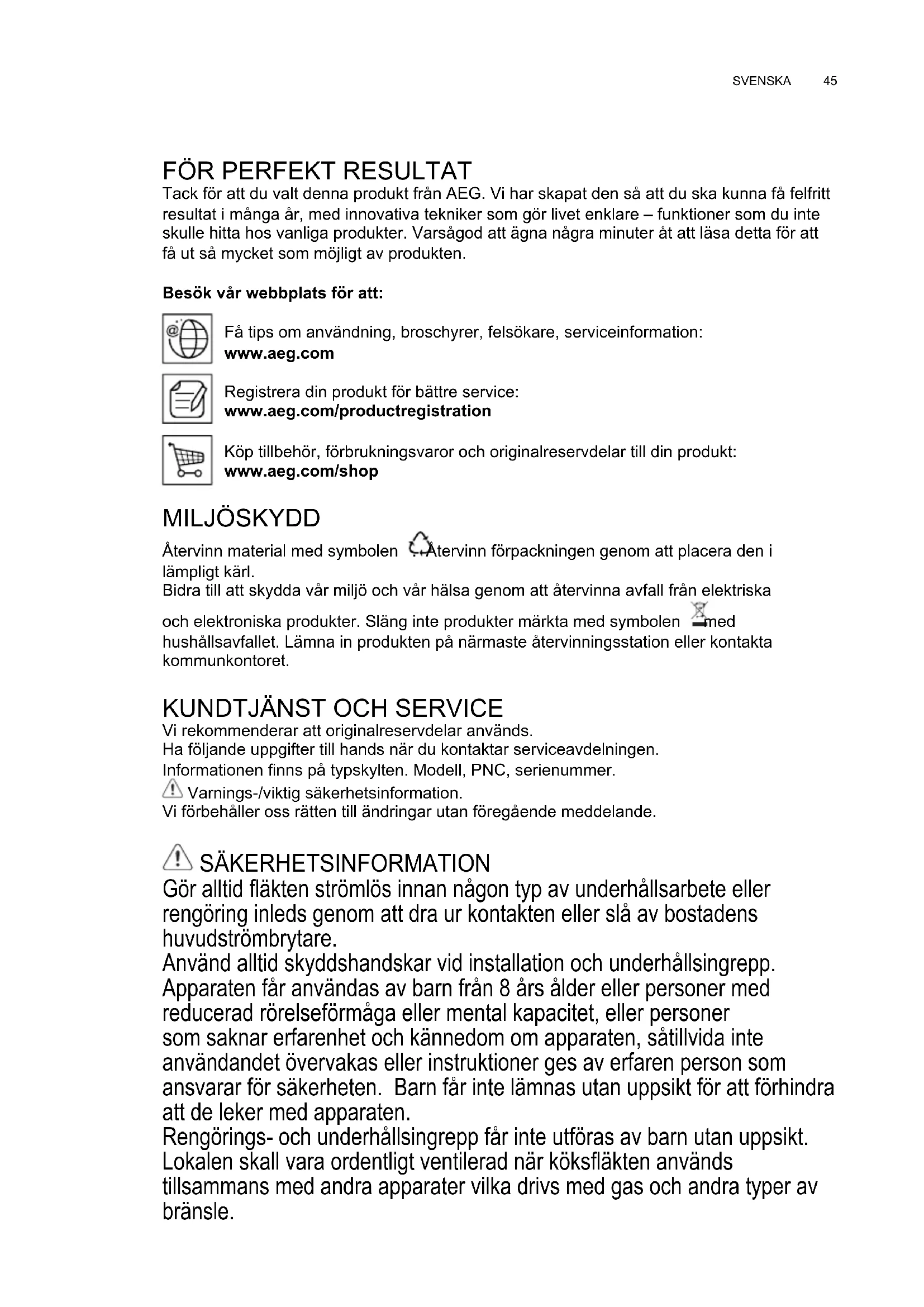 Tack för att du valt denna produkt från AEG. Vi har skapat den så att du ska kunna få felfritt resultat i många år, med innovativa tekniker som gör livet enklare – funktioner som du inte skulle hitta hos vanliga produkter. Varsågod att ägna några minuter åt att läsa detta för att få ut så mycket som möjligt av produkten. Besök vår webbplats för att: Få tips om användning, broschyrer, felsökare, serviceinformation: www.aeg.com Registrera din produkt för bättre service: www.aeg.com/productregistration Köp tillbehör, förbrukningsvaror och originalreservdelar till din produkt: www.aeg.com/shop MILJÖSKYDD Återvinn material med symbolen . Återvinn förpackningen genom att placera den i lämpligt kärl. Bidra till att skydda vår miljö och vår hälsa genom att återvinna avfall från elektriska och elektroniska produkter. Släng inte produkter märkta med symbolen med hushållsavfallet. Lämna in produkten på närmaste återvinningsstation eller kontakta kommunkontoret.
