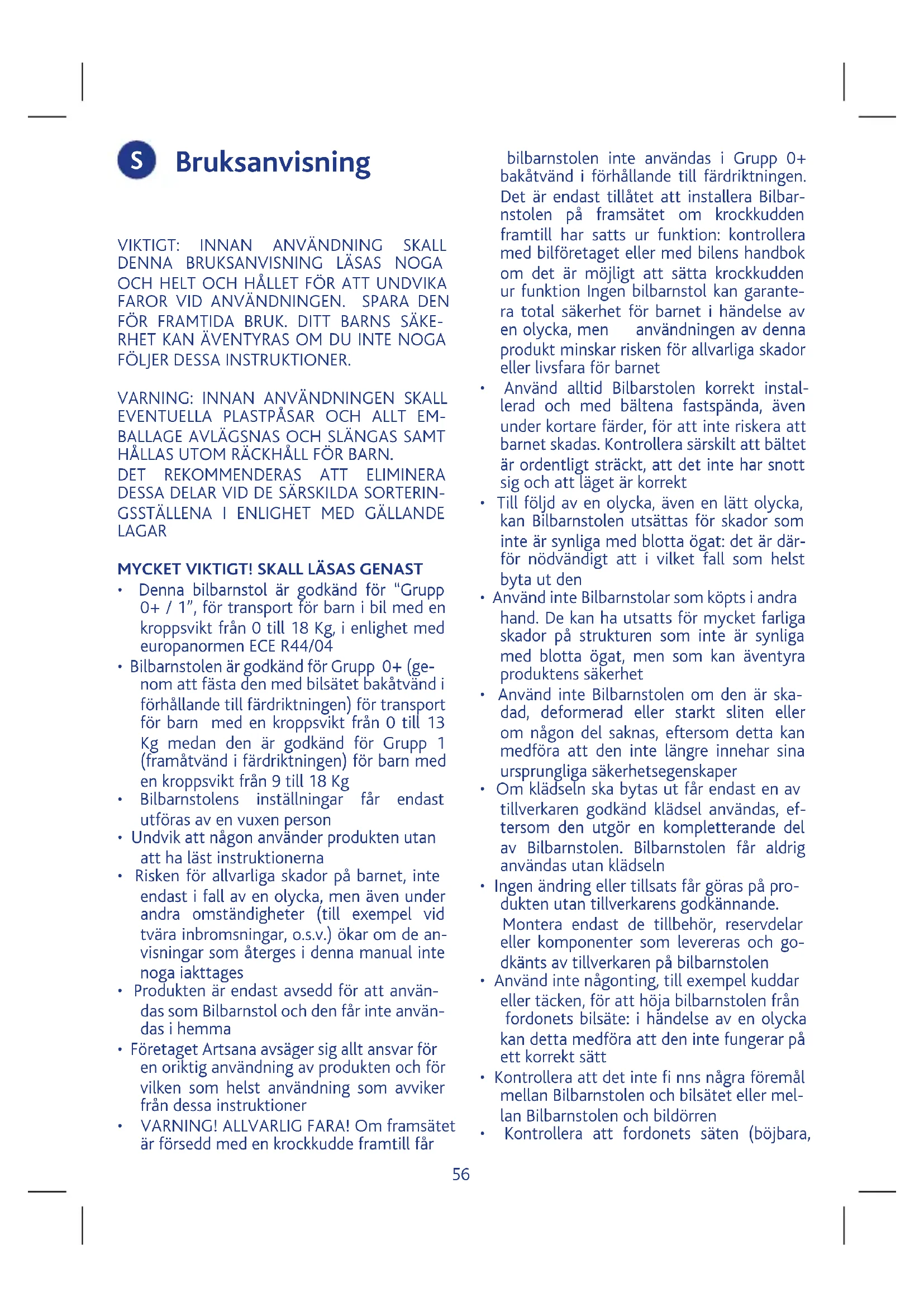 - Gör ofta uppehåll vid längre resor. Barnet blir mycket lätt trött inne i Bilbarnstolen. Ta inte ut barnet från Bilbarstolen av nå- got som helst skäl medan bilen är i rörelse. Om barnet behöver uppmärksamhet är det nödvändigt att hitta en säker plats och stanna bilen. Ta inte bort etiketter och märken från kläd- seln eftersom detta skulle kunna skada själ- va klädseln