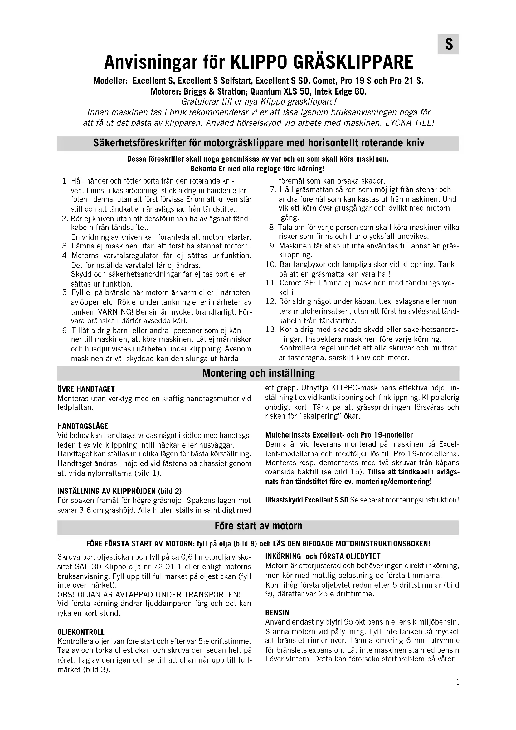Anvisningar för KLIPPO GRÄSKLIPPARE Modeller: Excellent S, Excellent S Selfstart, Excellent S SD, Comet, Pro 19 S och Pro 21 S. Motorer: Briggs & Stratton; Quantum XLS 50, Intek Edge 60. Gratulerar till er nya Klippo gräsklippare! Innan maskinen tas i bruk rekommenderar vi er att läsa igenom bruksanvisningen noga för att få ut det bästa av klipparen. Använd hörselskydd vid arbete med maskinen. LYCKA TILL!