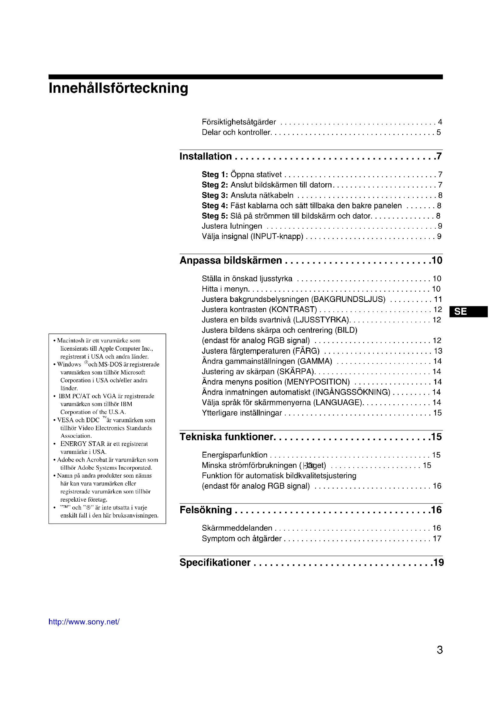 - Интервал между сигналами вертикальной развертки должен быть больше 450 мкс. Конструкция и характеристики могут изменяться без предварительного уведомления.2-651-717-12(1) © 2005 Sony Corporation TFT LCD Color Computer Display SDM-HS75D SDM-HS95D Bruksanvisning SE2 Owner’s Record The model and serial numbers are located at the rear of the unit. Record these numbers in the spaces provided below. Refer to them whenever you call upon your dealer regarding this product. Model No. Serial No. To reduce the risk of fire or electric shock, do not expose this apparatus to rain or moisture. Dangerously high voltages are present inside the unit. Do not open the cabinet. Refer servicing to qualified personnel only. FCC Notice This equipment has been tested and found to comply with the limits for a Class B digital device, pursuant to Part 15 of the FCC Rules. These limits are designed to provide reasonable protection against harmful interference in a residential installation. This equipment generates, uses, and can radiate radio frequency energy and, if not installed and used in accordance with the instructions, may cause harmful interference to radio communications. However, there is no guarantee that interference will not occur in a particular installation. If this equipment does cause harmful interference to radio or television reception, which can be determined by turning the equipment off and on, the user is encouraged to try to correct the interference by one or more of the following measures: – Reorient or relocate the receiving antenna. – Increase the separation between the equipment and receiver. – Connect the equipment into an outlet on a circuit different from that to which the receiver is connected. – Consult the dealer or an experienced radio/TV technician for help. You are cautioned that any changes or modifications not expressly approved in this manual could void your authority to operate this equipment. WARNING IMPORTANTE Para prevenir cualquier mal funcionamiento y evitar daños, por favor, lea detalladamente este manual de instrucciones antes de conectar y operar este equipo. If you have any questions about this product, you may call; Sony Customer Information Services Center 1-800-222-7669 or http://www.sony.com/ Declaration of Conformity Trade Name: SONY Model: SDM-HS75D SDM-HS95D Responsible Party: Sony Electronics Inc. Address: 16530 Via Esprillo, San Diego, CA 92127 U.S.A. Telephone Number: 858-942-2230 This device complies with part 15 of the FCC rules. Operation is subject to the following two conditions: (1) This device may not cause harmful interference, and (2) this device must accept any interference received, including interference that may cause undesired operation. NOTICE This notice is applicable for USA/Canada only. If shipped to USA/Canada, install only a UL LISTED/CSA LABELLED power supply cord meeting the following specifications: SPECIFICATIONS Plug Type Nema-Plug 5-15p Cord Type SVT or SJT, minimum 3 × 18 AWG Length Maximum 15 feet Rating Minimum 7 A, 125 V NOTICE Cette notice s’applique aux Etats-Unis et au Canada uniquement. Si cet appareil est exporté aux Etats-Unis ou au Canada, utiliser le cordon d’alimentation portant la mention UL LISTED/CSA LABELLED et remplissant les conditions suivantes: SPECIFICATIONS Type de fiche Fiche Nema 5-15 broches Cordon Type SVT ou SJT, minimum 3 × 18 AWG Longueur Maximum 15 pieds Tension Minimum 7 A, 125 V As an ENERGY STAR Partner, Sony Corporation has determined that this product meets the ENERGY STAR guidelines for energy efficiency.Innehållsförteckning