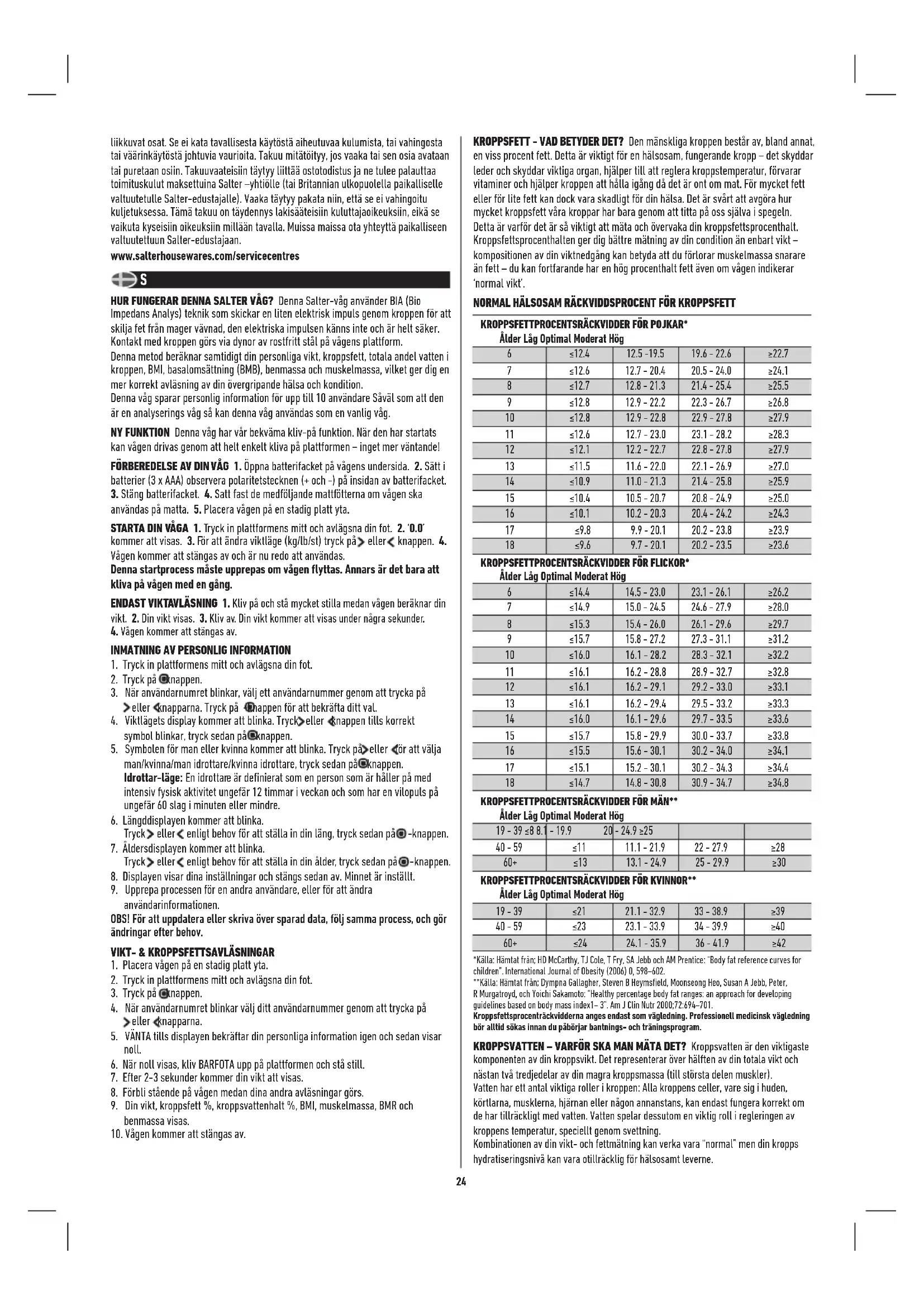 Hur exakt mäts min kropps fett- och vattenhalt? Denna Salter-våg använder en mätningsmetod känd som Bioelektrisk Impedans Analys (BIA) En liten ström skickas genom din kropp, via dina fötter och ben. Denna ström flödar enkelt genom mager muskulär vävnad, vilken har ett hög vätskeinnehåll, men inte enkelt genom fett. Därför, genom att mäta din kropps impedans (dvs. dess motstånd mot strömmen), kan kvantiteten av muskler avgöras. Från detta kan kvantiteten av fett och vatten beräknas. Vad är värdet av strömmen som går genom mig när mätningen görs? Är det säkert? Strömmen är mindre än 1mA, vilket är mycket lågt och helt säkert. Du kommer inte att känna något. Observera dock att denna enhet inte bör användas av någon med en intern medicinsk elektrisk enhet, såsom en pacemaker, som extra försiktighetsåtgärd mot störningar av denna enhet. Om jag mäter min kroppsfett och vatten vid olika tidpunkter på dagen kan det variera ganska mycket. Vilket värde är korrekt? Din kroppsfettsprocentavläsning varierar med kroppsvatteninnehållet, och det senare ändras under dagens gång. Det finns ingen rätt eller fel tidpunkt under dagen att göra en avläsning, men försök att göra avläsningar på en regelbunden tid när du anser att din kropp är väl hydrerad. Undvik att göra avläsningar efter att du har badat eller suttit i bastun, efter intensiv träning, eller inom 1-2 timmar från att du har druckit rejält eller intagit en måltid. Min kompis har en kroppsfettsanalyserare av ett annat märke. När jag använder den så får jag en annan avläsning. Varför då? Olika kroppsfettsanalyserare tar mått runt olika delar av kroppen och använder matematiska algoritmer för att beräkna kroppsfettsprocenthalten. Det bästa rådet är att inte göra jämförelser från en enhet till en annan, utan använda samma enhet varje gång för att övervaka eventuella ändringar. Hur tyder jag mina kroppsfetts- och vattenprocenthaltavläsningar? Se kroppsfetts- och vattentabellerna som medföljer denna produkt. De guidar dig så att du vet om dina kroppsfetts- och vattenavläsningar faller i en hälsosam kategori (relativt till din ålder och ditt kön). Vad bör jag göra om min kroppsfettsavläsning är mycket hög? En förnuftig kost, vätskeintag och träningsprogram kan reducera din kroppsfettsprocenthalt. Professionell medicinsk vägledning bör alltid sökas innan du påbörjar ett sådant program. Varför är kroppsfettsprocenthalterna för män och kvinnor så olika? Kvinnor har naturligt en högre procenthalt med fett än män, eftersom deras kroppssammansättning är olika och inriktad mot graviditet, amning etc. Vad bör jag göra om min vattenprocenthalt är låg? Se till att du regelbundet intar tillräckligt med vatten och arbetar mot att flytta din kroppsfettsprocenthalt in i ett hälsosamt stadie. Varför bör jag undvika att använda kroppsanalysvågen då jag är gravid? Under graviditet ändras en kvinnas kroppssammansättning avsevärt för att kunna stödja en utvecklande barn. Under dessa förhållanden kan26 kroppsfettprocenthaltsavläsningar vara felaktiga och missvisande. Gravida kvinnor bör därför endast använda viktfunktionen. RÅD VID ANVÄNDNING OCH SKÖTSEL • Väg dig alltid på samma våg placerad på samma golvyta. Jämför inte viktavläsningar från en våg till en annan eftersom olikheter kommer att existera på grund av tillverkningsavvikelser. • Placering av din våg på ett hårt, jämt golv ger bästa precision igen och igen. • Väg dig vid samma tidpunkt varje dag, innan måltider och utan skor. Med en gång på morgonen är en bra tidpunkt. • Din våg rundar upp eller ner till närmaste enheten. Om du väger dig två gånger och får två olika avläsningar ligger din vikt emellan de två. • Rengör din våg med en fuktig trasa. Använd inte kemiska rengöringsmedel. • Låt inte din våg bli indränkt med vatten eftersom detta kan skada elektroniken. • Hantera din våg varsamt – den är ett precisionsinstrument. Tappa den inte eller hoppa på den. FELSÖKNINGSGUIDE • Du måste vara barfota när du använder kroppsfetts- och total kroppsvattenavläsningar. • Din hud på undersidan av dina fötter kan påverka avläsningen. För att få bästa möjliga avläsning och konsekvent avläsning, torka fötterna med en fuktig trasa och lämna dem något fuktiga innan du kliver upp på vågen. VARNINGSINDIKATORER Lo Byt ut batteriet. O-Ld Maximal viktkapacitet överskriden. Err2 Utom räckvidd, felaktig drift eller dålig kontakt med fötterna. TEKNISKA SPECIFIKATIONER 80 cm - 220 cm Kvinna/man 2’7” - 7’2” 10 användarminnen