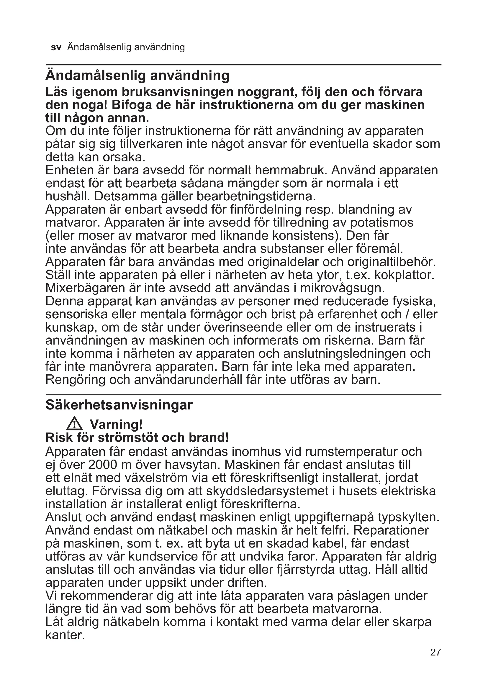 - Vennligst kast innpakningsmaterialet på en miljø- og forskriftsmessig måte. Dette apparatet er klassifisert i henhold til det europeiske direk- tivet 2012/19/EU om avhending av elektrisk- og elektronisk utstyr (waste electrical and electronic equipment – WEEE). Direktivet angir rammene for innlevering og gjenvinning av innbytteprodukter. Faghandelen kan gi opplysninger om aktuelle avfallsmottak. Garanti For dette apparatet gjelder de garantibe- tingelser som er oppgitt av vår representant i de respektive land. Detaljer om disse garantibetingelsene får du ved å henvende deg til elektrohandelen der du har kjøpt apparatet. Ved krav i forbindelse med garantiytelser, er det i alle fall nødvendig å legge fram kvittering for kjøpet av apparatet. Det tas forbehold om endringer. En oversikt Vennligst brett ut sidene med bilder. X Bilde A 1 Basisapparat 2 Innkoblingstast Stavmikseren er slått på så lenge innkoblingstasten er trykket. 3 Mikserfot Sett mikserfoten på og la den smekke i. Alt etter modell: 4 Universalkutter (separat bruksanvisning) Med universalkutteren utnytter du apparatets fulle ytelse. Dersom univers- alkutteren ikke er inkludert i leveringen, kan den bestilles via kundeservice (bestillingsnr. 640698 eller 640686). Betjening Apparatet er egnet for miksing av majones, sauser, miksete drikker, barnemat, kokt frukt og kokte grønnsaker. For mosing av supper. Stavmikseren er ikke egnet for tilberedning av potetmos. Ŷ Strømkabelen vikles helt ut. Ŷ Sett mikserfoten på basisapparatet og drei den mot urviseren. Ŷ Sett i støpselet. Ŷ Fyll matvarene på et plastbeger. Ŷ Hold fast stavmikseren og begeret. For å forhindre at det spruter, trykkes innkoblingstasten først når mikserfoten er dyppet ned i materialet som skal mikses. Stavmikseren må alltid slås av før den blir tatt ut av materialet. Etter arbeidet / rengjøring Apparatet må rengjøres grundig etter hver bruk. W Fare for elektrisk støt Basisapparatet må aldri dyppes ned i væske og må heller ikke rengjøres i oppvaskmaskin. Trekk ut støpselet før du starter rengjøringsar- beidene! Ikke bruk damprenser!27 sv Ändamålsenlig användning Ändamålsenlig användning Läs igenom bruksanvisningen noggrant, följ den och förvara den noga! Bifoga de här instruktionerna om du ger maskinen till någon annan. Om du inte följer instruktionerna för rätt användning av apparaten påtar sig sig tillverkaren inte något ansvar för eventuella skador som detta kan orsaka. Enheten är bara avsedd för normalt hemmabruk. Använd apparaten endast för att bearbeta sådana mängder som är normala i ett hushåll. Detsamma gäller bearbetningstiderna. Apparaten är enbart avsedd för finfördelning resp. blandning av matvaror. Apparaten är inte avsedd för tillredning av potatismos (eller moser av matvaror med liknande konsistens). Den får inte användas för att bearbeta andra substanser eller föremål. Apparaten får bara användas med originaldelar och originaltilbehör. Ställ inte apparaten på eller i närheten av heta ytor, t.ex. kokplattor. Mixerbägaren är inte avsedd att användas i mikrovågsugn. Denna apparat kan användas av personer med reducerade fysiska, sensoriska eller mentala förmågor och brist på erfarenhet och / eller kunskap, om de står under överinseende eller om de instruerats i användningen av maskinen och informerats om riskerna. Barn får inte komma i närheten av apparaten och anslutningsledningen och får inte manövrera apparaten. Barn får inte leka med apparaten. Rengöring och användarunderhåll får inte utföras av barn. Säkerhetsanvisningar W Varning! Risk för strömstöt och brand! Apparaten får endast användas inomhus vid rumstemperatur och ej över 2000 m över havsytan. Maskinen får endast anslutas till ett elnät med växelström via ett föreskriftsenligt installerat, jordat eluttag. Förvissa dig om att skyddsledarsystemet i husets elektriska installation är installerat enligt föreskrifterna. Anslut och använd endast maskinen enligt uppgifternapå typskylten. Använd endast om nätkabel och maskin är helt felfri. Reparationer på maskinen, som t. ex. att byta ut en skadad kabel, får endast utföras av vår kundservice för att undvika faror. Apparaten får aldrig anslutas till och användas via tidur eller fjärrstyrda uttag. Håll alltid apparaten under uppsikt under driften. Vi rekommenderar dig att inte låta apparaten vara påslagen under längre tid än vad som behövs för att bearbeta matvarorna. Låt aldrig nätkabeln komma i kontakt med varma delar eller skarpa kanter.28 sv Säkerhetsanvisningar Vi gratulerar dig till ditt köp av en ny apparat från Bosch. Mer information om våra produkter finns på vår Internet-sida. Motordelen får aldrig sänkas ned i vatten eller maskindiskas. Använd inte apparaten med våta händer och låt den inte gå på tomgång. Sänk inte ned apparaten i matvarorna längre än till skarven mellan mixerfot och basapparat. Dra alltid ut nätkabeln ur uttaget efter varje användning, när du inte har apparaten under uppsikt, före hopsättning, isärtagning eller rengöring och om ett fel skulle uppkomma. W Varning! Risk för personskador! Var försiktig när du handskas med vassa knivblad, både när du tömmer skålen och vid rengöring. Omedelbart efter att du har använt apparaten måste du vänta tills mixerkniven står stilla. Innan du byter tillbehör eller tillsatser som rör sig under användningen måste du först stänga av apparaten och dra ut nätkabeln ur uttaget. Tillbehör får bara sättas på och tas bort när apparaten står stilla. Rör aldrig mixerfotskniven. Rengör aldrig mixerfotskniven med bara händer. Använd en borste. W Varning! Risk för brännskador! Var försiktig när du bearbetar varma matvaror! Varma matvaror kan stänka omkring vid bearbetningen. Ställ aldrig mixerfoten på varma ytor och använd den inte till mycket varma matvaror. Låt kokande matvaror svalna till 80°C e