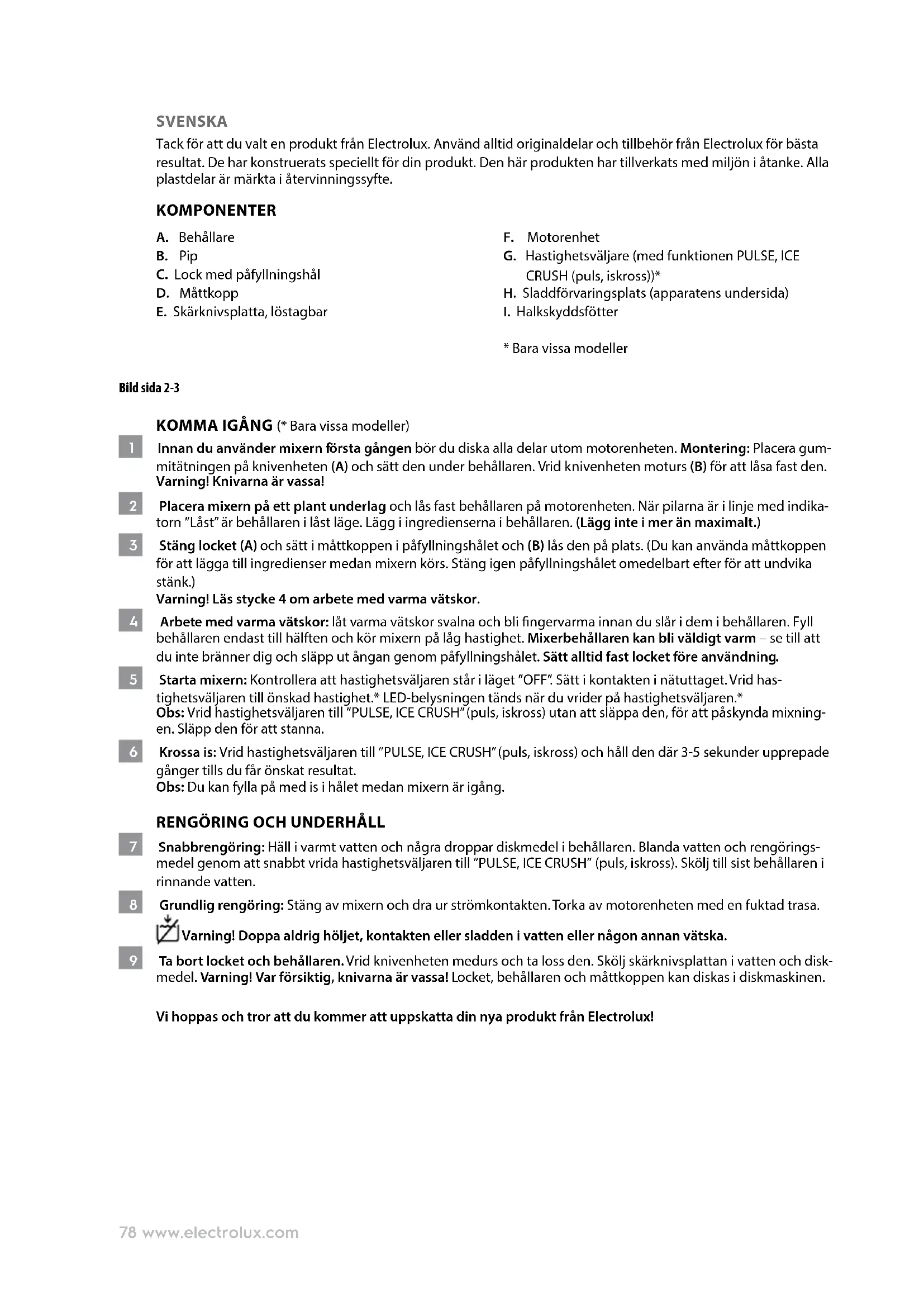 7 Snabbrengöring: Häll i varmt vatten och några droppar diskmedel i behållaren. Blanda vatten och rengörings- medel genom att snabbt vrida hastighetsväljaren till ”PULSE, ICE CRUSH” (puls, iskross). Skölj till sist behållaren i rinnande vatten. 8 Grundlig rengöring: Stäng av mixern och dra ur strömkontakten. Torka av motorenheten med en fuktad trasa. Varning! Doppa aldrig höljet, kontakten eller sladden i vatten eller någon annan vätska. 9 Ta bort locket och behållaren. Vrid knivenheten medurs och ta loss den. Skölj skärknivsplattan i vatten och disk- medel. Varning! Var försiktig, knivarna är vassa! Locket, behållaren och måttkoppen kan diskas i diskmaskinen. Vi hoppas och tror att du kommer att uppskatta din nya produkt från Electrolux!79www.electrolux.com