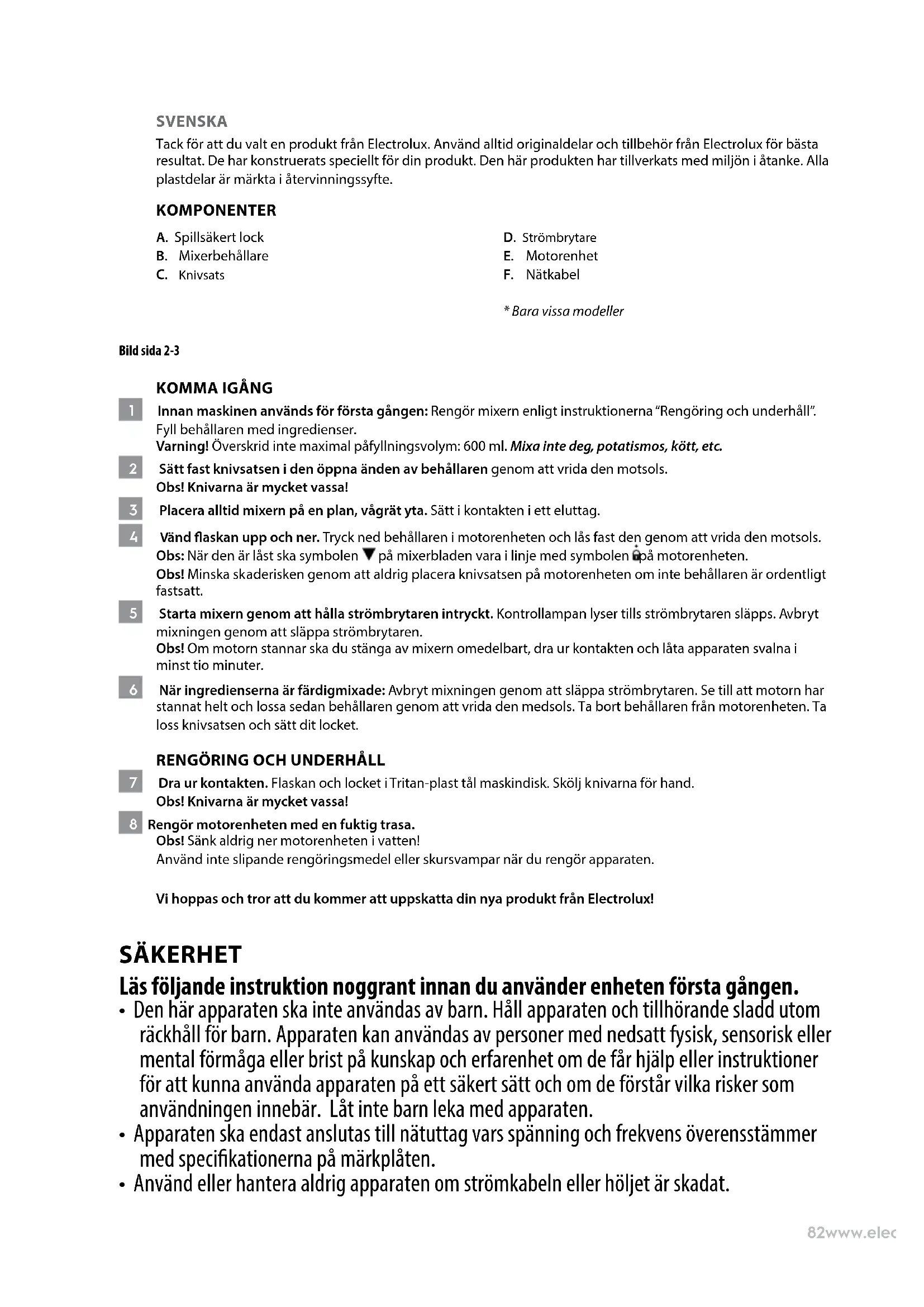 7 Dra ur kontakten. Flaskan och locket i Tritan-plast tål maskindisk. Skölj knivarna för hand. Obs! Knivarna är mycket vassa! 8 Rengör motorenheten med en fuktig trasa. Obs! Sänk aldrig ner motorenheten i vatten! Använd inte slipande rengöringsmedel eller skursvampar när du rengör apparaten. Vi hoppas och tror att du kommer att uppskatta din nya produkt från Electrolux! SÄKERHET Läs följande instruktion noggrant innan du använder enheten första gången.