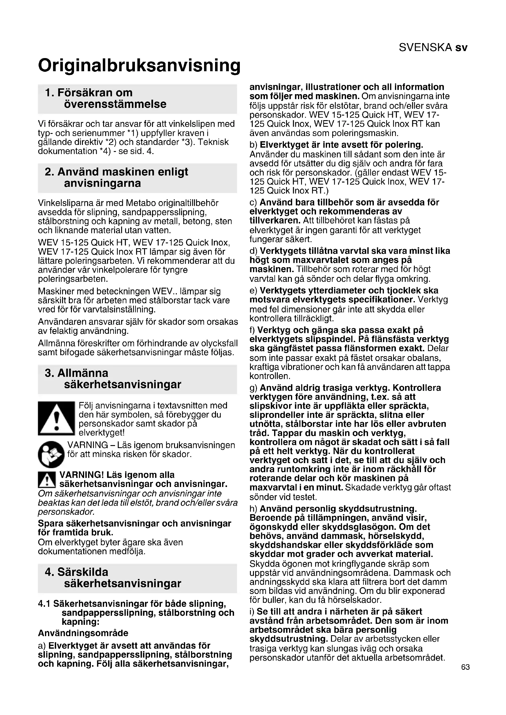 Originalbruksanvisning Vi försäkrar och tar ansvar för att vinkelslipen med typ- och serienummer *1) uppfyller kraven i gällande direktiv *2) och standarder *3). Teknisk dokumentation *4) - se sid. 4. Vinkelsliparna är med Metabo originaltillbehör avsedda för slipning, sandpappersslipning, stålborstning och kapning av metall, betong, sten och liknande material utan vatten. WEV 15-125 Quick HT, WEV 17-125 Quick Inox, WEV 17-125 Quick Inox RT lämpar sig även för lättare poleringsarbeten. Vi rekommenderar att du använder vår vinkelpolerare för tyngre poleringsarbeten. Maskiner med beteckningen WEV.. lämpar sig särskilt bra för arbeten med stålborstar tack vare vred för för varvtalsinställning. Användaren ansvarar själv för skador som orsakas av felaktig användning. Allmänna föreskrifter om förhindrande av olycksfall samt bifogade säkerhetsanvisningar måste följas. Följ anvisningarna i textavsnitten med den här symbolen, så förebygger du personskador samt skador på elverktyget! VARNING – Läs igenom bruksanvisningen för att minska risken för skador. VARNING! Läs igenom alla säkerhetsanvisningar och anvisningar. Om säkerhetsanvisningar och anvisningar inte beaktas kan det leda till elstöt, brand och/eller svåra personskador. Spara säkerhetsanvisningar och anvisningar för framtida bruk. Om elverktyget byter ägare ska även dokumentationen medfölja.