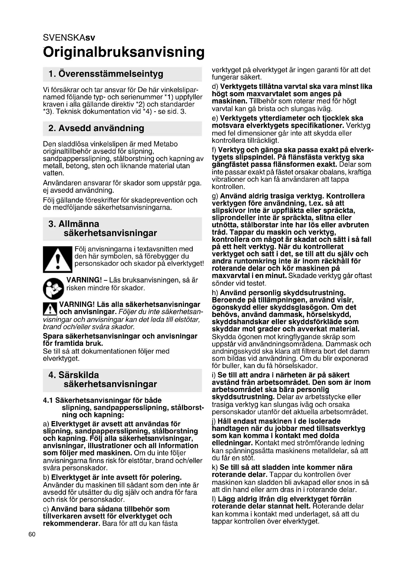 svenska Originalbruksanvisning Vi försäkrar och tar ansvar för De här vinkelslipar- named följande typ- och serienummer *1) uppfyller kraven i alla gällande direktiv *2) och standarder *3). Teknisk dokumentation vid *4) - se sid. 3. Den sladdlösa vinkelslipen är med Metabo originaltillbehör avsedd för slipning, sandpappersslipning, stålborstning och kapning av metall, betong, sten och liknande material utan vatten. Användaren ansvarar för skador som uppstår pga. ej avsedd användning. Följ gällande föreskrifter för skadeprevention och de medföljande säkerhetsanvisningarna. Följ anvisningarna i textavsnitten med den här symbolen, så förebygger du personskador och skador på elverktyget! VARNING! – Läs bruksanvisningen, så är risken mindre för skador. VARNING! Läs alla säkerhetsanvisningar och anvisningar. Följer du inte säkerhetsan- visningar och anvisningar kan det leda till elstötar, brand och/eller svåra skador. Spara säkerhetsanvisningar och anvisningar för framtida bruk. Se till så att dokumentationen följer med elverktyget.