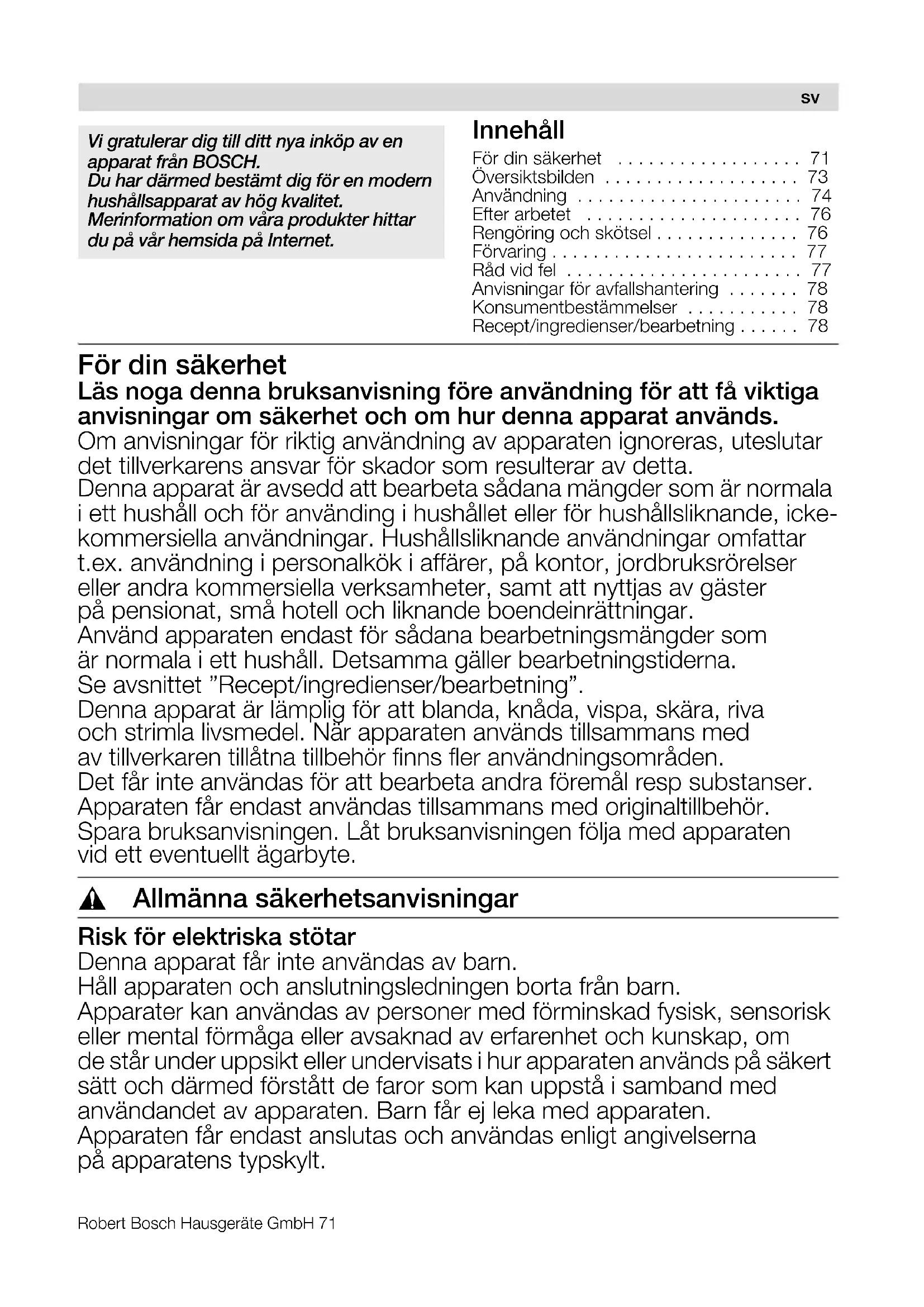 - Recept/ingredienser/bearbetning För din säkerhet Läs noga denna bruksanvisning före användning för att få viktiga anvisningar om säkerhet och om hur denna apparat används. Om anvisningar för riktig användning av apparaten ignoreras, uteslutar det tillverkarens ansvar för skador som resulterar av detta. Denna apparat är avsedd att bearbeta sådana mängder som är normala i ett hushåll och för använding i hushållet eller för hushållsliknande, icke- kommersiella användningar. Hushållsliknande användningar omfattar t.ex. användning i personalkök i affärer, på kontor, jordbruksrörelser eller andra kommersiella verksamheter, samt att nyttjas av gäster på pensionat, små hotell och liknande boendeinrättningar. Använd apparaten endast för sådana bearbetningsmängder som är normala i ett hushåll. Detsamma gäller bearbetningstiderna. Se avsnittet ”Recept/ingredienser/bearbetning”. Denna apparat är lämplig för att blanda, knåda, vispa, skära, riva och strimla livsmedel. När apparaten används tillsammans med av tillverkaren tillåtna tillbehör finns fler användningsområden. Det får inte användas för att bearbeta andra föremål resp substanser. Apparaten får endast användas tillsammans med originaltillbehör. Spara bruksanvisningen. Låt bruksanvisningen följa med apparaten vid ett eventuellt ägarbyte. , Allmänna säkerhetsanvisningar Risk för elektriska stötar Denna apparat får inte användas av barn. Håll apparaten och anslutningsledningen borta från barn. Apparater kan användas av personer med förminskad fysisk, sensorisk eller mental förmåga eller avsaknad av erfarenhet och kunskap, om de står under uppsikt eller undervisats i hur apparaten används på säkert sätt och därmed förstått de faror som kan uppstå i samband med användandet av apparaten. Barn får ej leka med apparaten. Apparaten får endast anslutas och användas enligt angivelserna på apparatens typskylt. p. 78