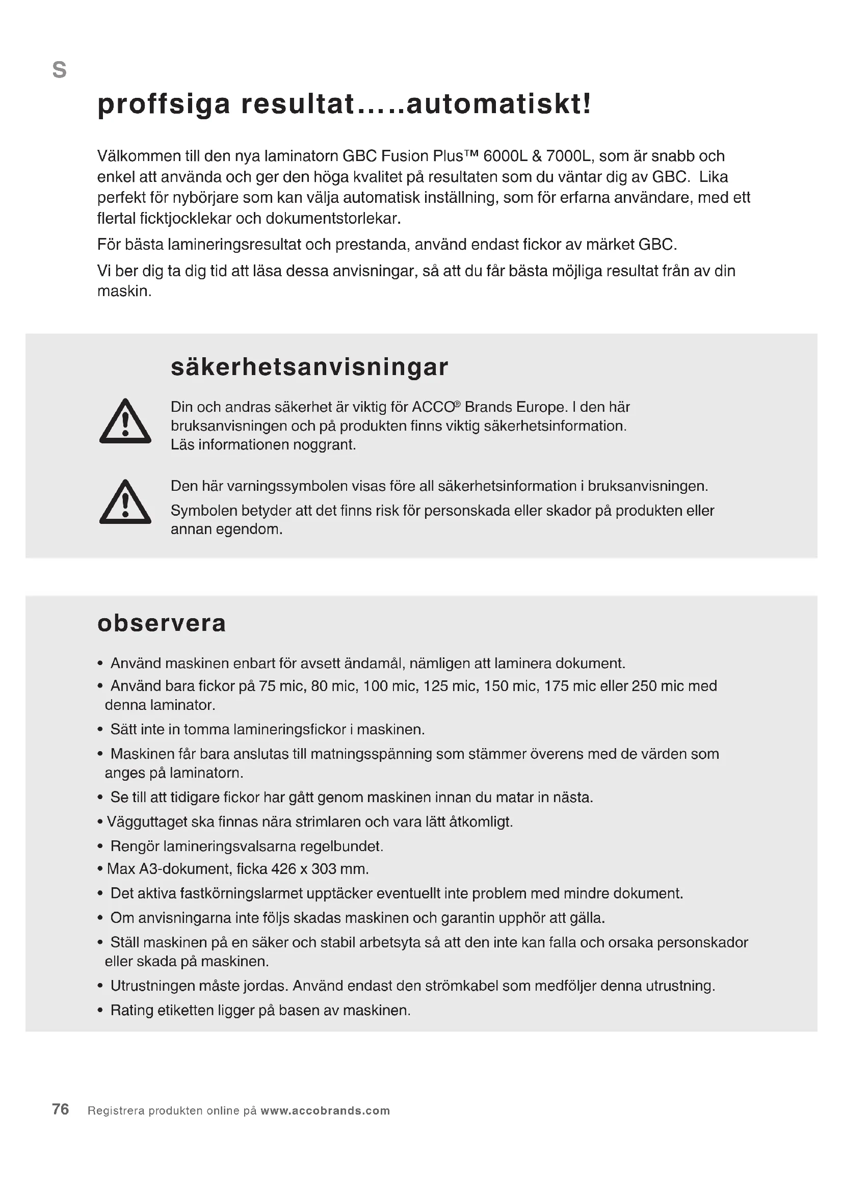 - Använd maskinen enbart för avsett ändamål, nämligen att laminera dokument.• Använd bara ckor på 75 mic, 80 mic, 100 mic, 125 mic, 150 mic, 175 mic eller 250 mic med denna laminator.• Sätt inte in tomma lamineringsckor i maskinen.• Maskinen får bara anslutas till matningsspänning som stämmer överens med de värden som anges på laminatorn.• Se till att tidigare ckor har gått genom maskinen innan du matar in nästa.• Vägguttaget ska nnas nära strimlaren och vara lätt åtkomligt.• Rengör lamineringsvalsarna regelbundet.• Max A3-dokument, cka 426 x 303 mm.• Det aktiva fastkörningslarmet upptäcker eventuellt inte problem med mindre dokument.• Om anvisningarna inte följs skadas maskinen och garantin upphör att gälla.• Ställ maskinen på en säker och stabil arbetsyta så att den inte kan falla och orsaka personskador eller skada på maskinen.• Utrustningen måste jordas. Använd endast den strömkabel som medföljer denna utrustning.• Rating etiketten ligger på basen av maskinen. proffsiga resultat…..automatiskt! Välkommen till den nya laminatorn GBC Fusion Plus™ 6000L & 7000L, som är snabb och enkel att använda och ger den höga kvalitet på resultaten som du väntar dig av GBC. Lika perfekt för nybörjare som kan välja automatisk inställning, som för erfarna användare, med ett ertal cktjocklekar och dokumentstorlekar. För bästa lamineringsresultat och prestanda, använd endast ckor av märket GBC. Vi ber dig ta dig tid att läsa dessa anvisningar, så att du får bästa möjliga resultat från av din maskin.service Försök inte att själv utföra service eller reparationen på laminatorn. Dra ut stickkontakten om maskinen behöver repareras och kontakta en serviceverkstad som godkänts av GBC. FUSION PLUS