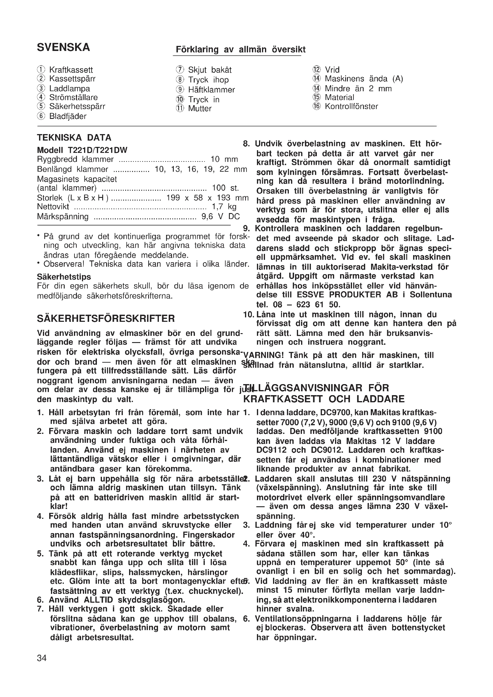 T221D (Sw) (’100. 3. 17)UNDERHÅLL FÖRSIKTIGHET! Tillse alltid att maskinen är frånkopplad och att bat- teriet tagits ur maskinen innan Du utför arbete på denna. För att bibehålla produktens säkerhet och tillförlitlig- het, bör alltid reparationer, underhållsservice och justeringar utföras av auktoriserad Makita service- verkstad. GARANTI Vi ger garantier för MAKITA’s maskiner enligt lag- stadgade föreskrifter i olika länder. Skador och felak- tigheter som kan hänföras till normal förslitning, över- belastning och felaktig hantering omfattas ej av denna garanti. Vid reklamation skall du sända in hela maski- nen, icke isärtagen, tillsammans med det bifogade GARANTIBEVISET (och kvitto/faktura), till din åter- försäljare eller till en auktoriserad MAKITA service- verkstad. T221D (Sw) (’100. 3. 17) 37NORSK Forklaring til generell oversikt 1 Batteri 2 Deksel 3 Ladelampe 4 Startbryter 5 Sikkerhetshendel 6 Platefjær 7 Skyv bakover 8 Trykk 9 Stifter 0 Skyv q Mutter w Drei e Maskinende (A) r Mindre enn 2 mm t Materiale y Kikkevindu TEKNISKE DATA Modell T221D/T221DW Stiftbredde ...................................................... 10 mm Anvendelige stiftlengde .......... 10, 13, 16, 19, 22 mm Stiftmagasinets kapasitet .............................. 100 stk Mål(LxBxH) ........................... 199 x 58 x 193 mm Nettovekt ......................................................... 1,7 kg Merkespenning ......................................... D.C. 9,6 V