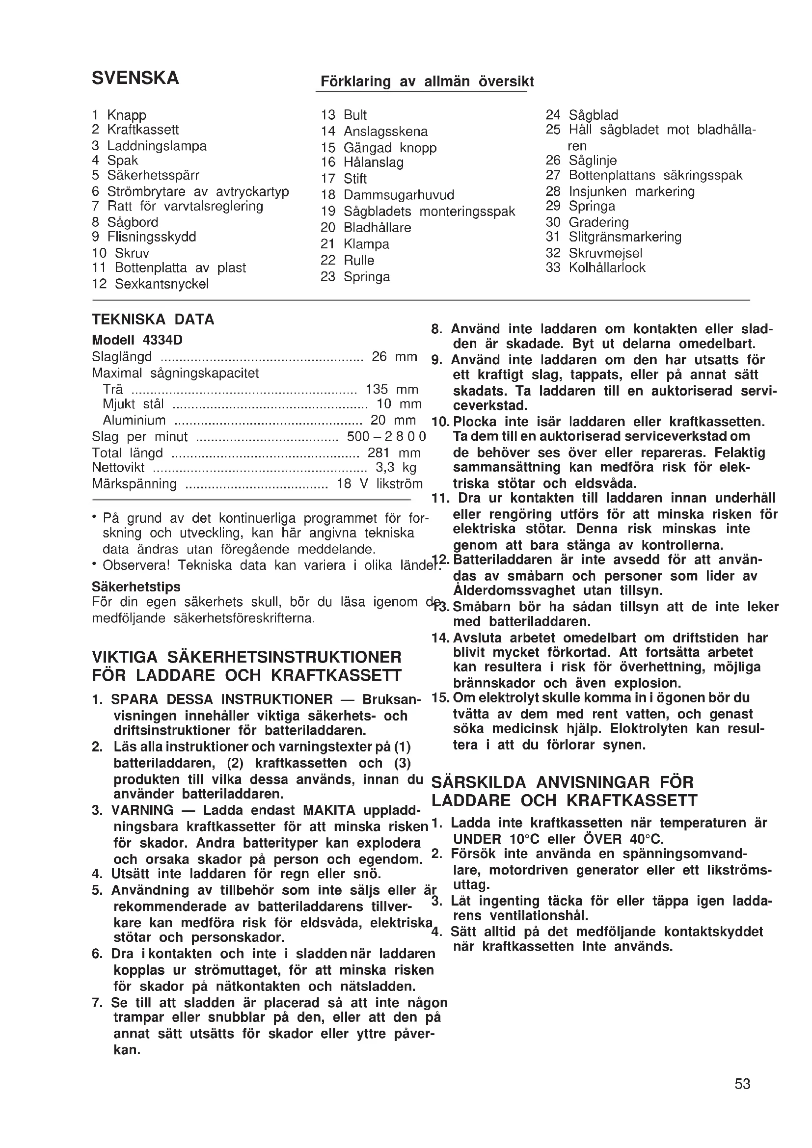 Ladda ner instruktionerna för din Elektrisk såg i PDF-format gratis! Hitta din manual 4334D - MAKITA och ta tillbaka ditt elektroniska enhet i hand. På denna sida publiceras alla dokument som behövs för att använda din enhet. 4334D av märket MAKITA.