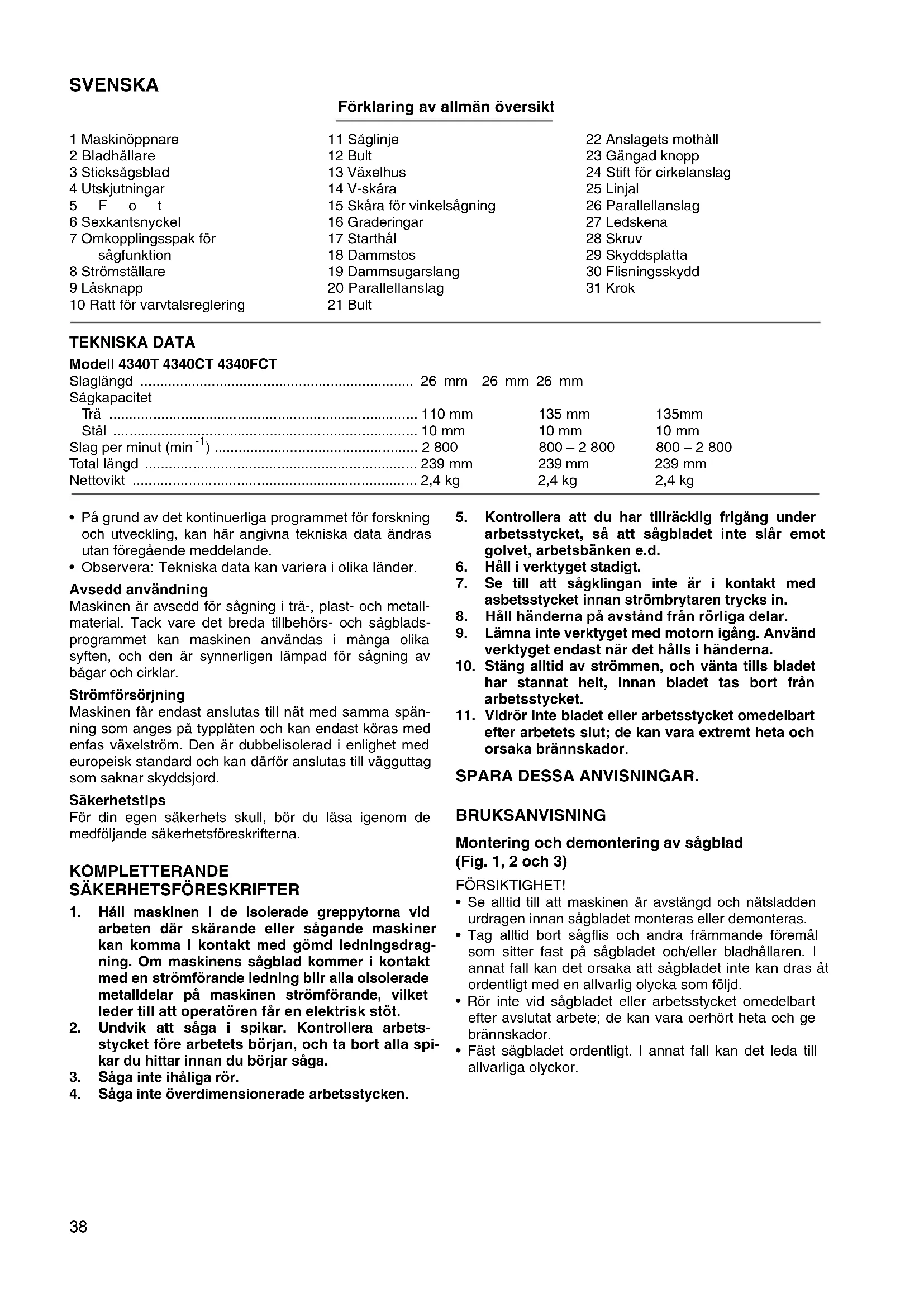 Maskinen ar avsedd for sänging i tra-, plast- och metallmaterial. Tack vare det breda tillbehors- och sāgbladsprogrammet kan maskinen användas i manga olikasyften, och den ar synnerligen lampad for sänging avbagar och cirklar.