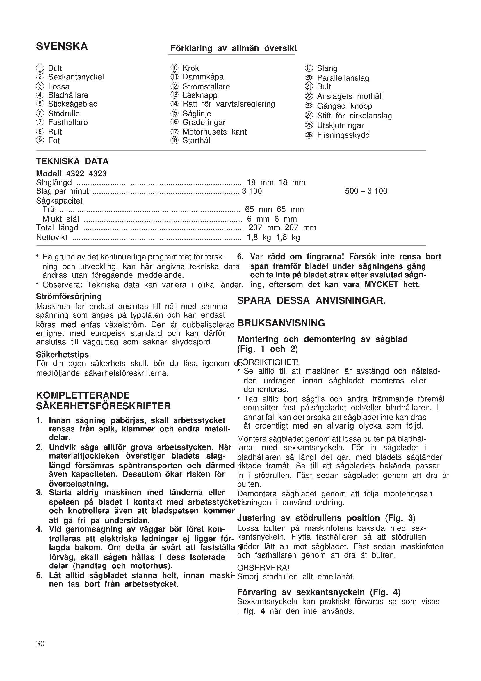 Tag alltid bort sågflis och andra främmande föremål som sitter fast på sågbladet och/eller bladhållaren. I annat fall kan det orsaka att sågbladet inte kan dras åt ordentligt med en allvarlig olycka som följd. Montera sågbladet genom att lossa bulten på bladhål- laren med sexkantsnyckeln. För in sågbladet i bladhållaren så långt det går, med bladets sågtänder riktade framåt. Se till att sågbladets bakända passar in i stödrullen. Fäst sedan sågbladet genom att dra åt bulten. Demontera sågbladet genom att följa monteringsan- visningen i omvänd ordning. Justering av stödrullens position (Fig. 3) Lossa bulten på maskinfotens baksida med sex- kantsnyckeln. Flytta fasthållaren så att stödrullen stöder lätt an mot sågbladet. Fäst sedan maskinfoten och fasthållaren genom att dra åt bulten. OBSERVERA! Smörj stödrullen allt emellanåt. Förvaring av sexkantsnyckeln (Fig. 4) Sexkantsnyckeln kan praktiskt förvaras så som visas i fig. 4 när den inte används.