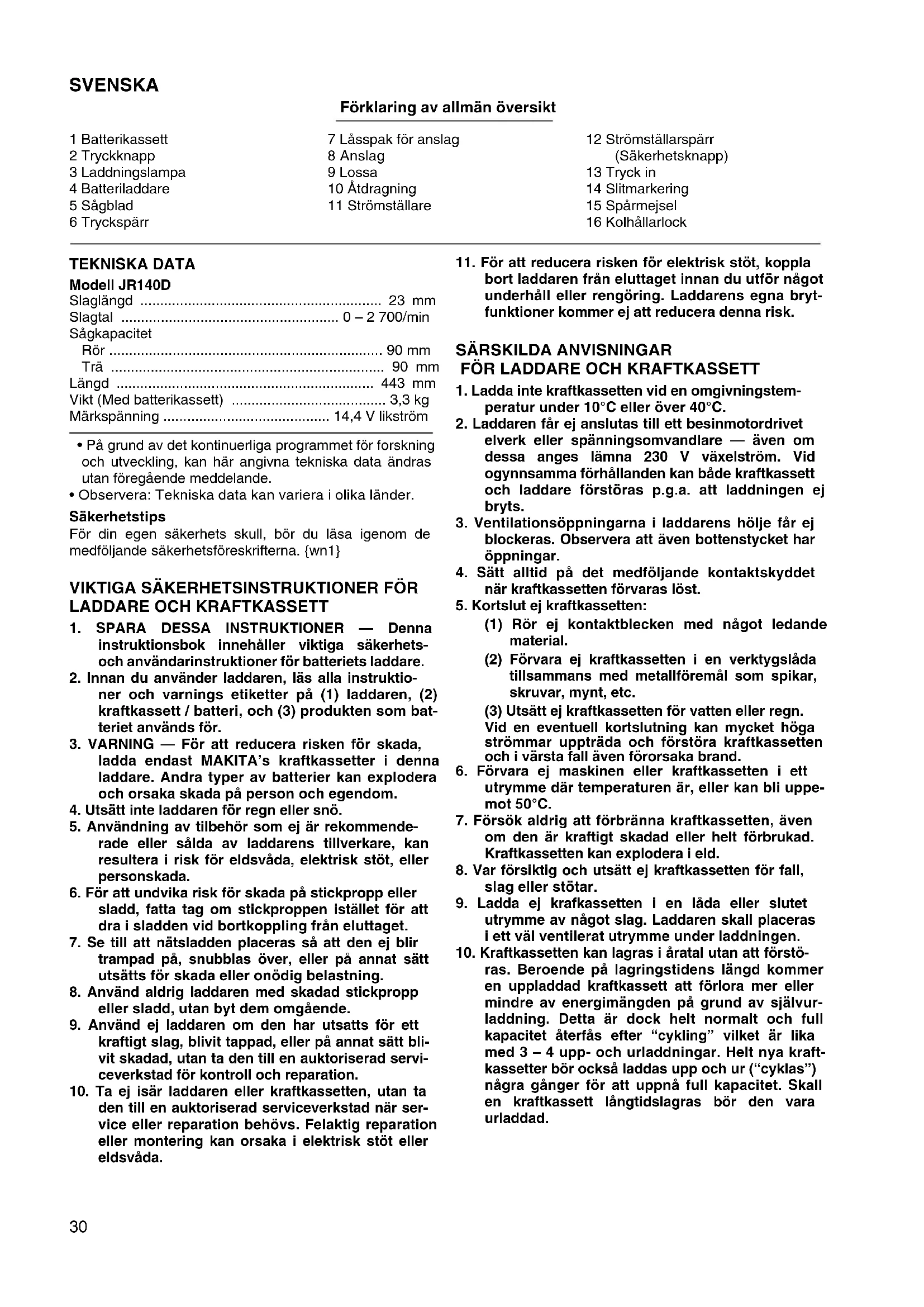 - VARNING — För att reducera risiken für skada, ladda endast MAKITA's kraftkassetter i denna laddare. Andra typer av batterier kan explodera och orsaka skada på person och egendom.