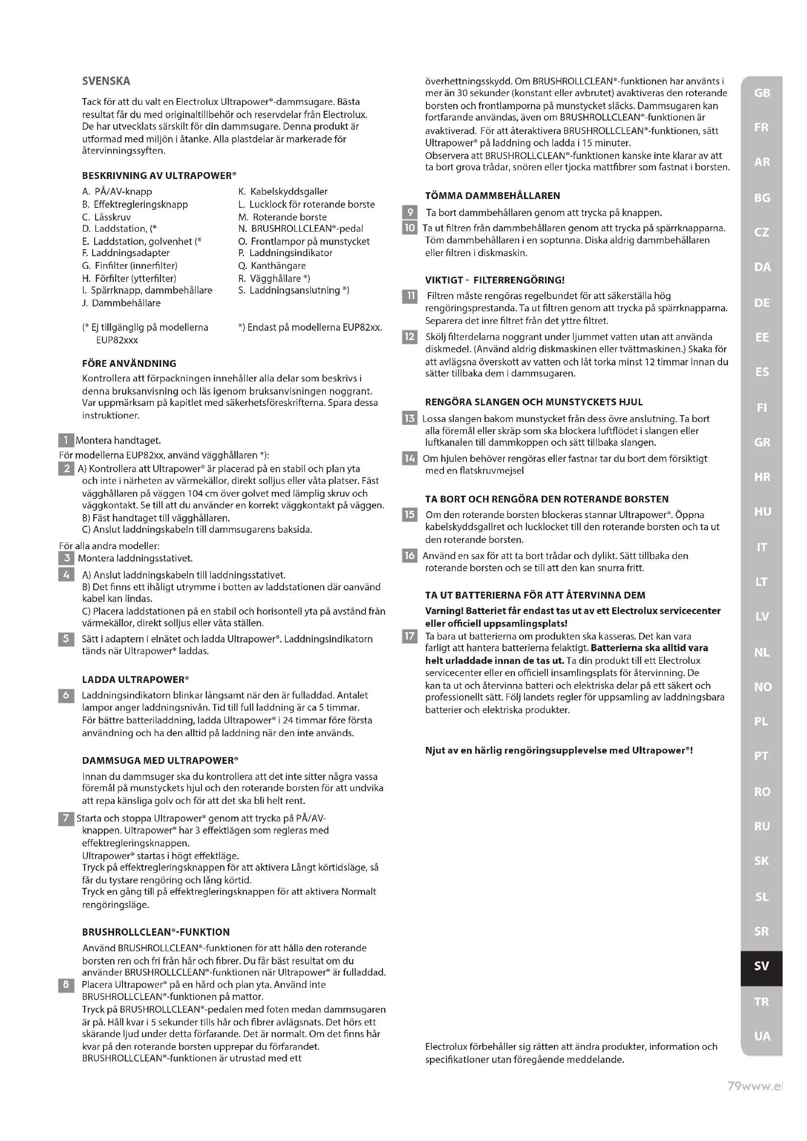 13 Lossa slangen bakom munstycket från dess övre anslutning. Ta bort alla föremål eller skräp som ska blockera luftödet i slangen eller luftkanalen till dammkoppen och sätt tillbaka slangen. 14 Om hjulen behöver rengöras eller fastnar tar du bort dem försiktigt med en atskruvmejsel TA BORT OCH RENGÖRA DEN ROTERANDE BORSTEN 15 Om den roterande borsten blockeras stannar Ultrapower®. Öppna kabelskyddsgallret och lucklocket till den roterande borsten och ta ut den roterande borsten. 16 Använd en sax för att ta bort trådar och dylikt. Sätt tillbaka den roterande borsten och se till att den kan snurra fritt. TA UT BATTERIERNA FÖR ATT ÅTERVINNA DEM Varning! Batteriet får endast tas ut av ett Electrolux servicecenter eller ociell uppsamlingsplats! 17 Ta bara ut batterierna om produkten ska kasseras. Det kan vara farligt att hantera batterierna felaktigt. Batterierna ska alltid vara helt urladdade innan de tas ut. Ta din produkt till ett Electrolux servicecenter eller en ociell insamlingsplats för återvinning. De kan ta ut och återvinna batteri och elektriska delar på ett säkert och professionellt sätt. Följ landets regler för uppsamling av laddningsbara batterier och elektriska produkter. Njut av en härlig rengöringsupplevelse med Ultrapower®!80www.electrolux.com