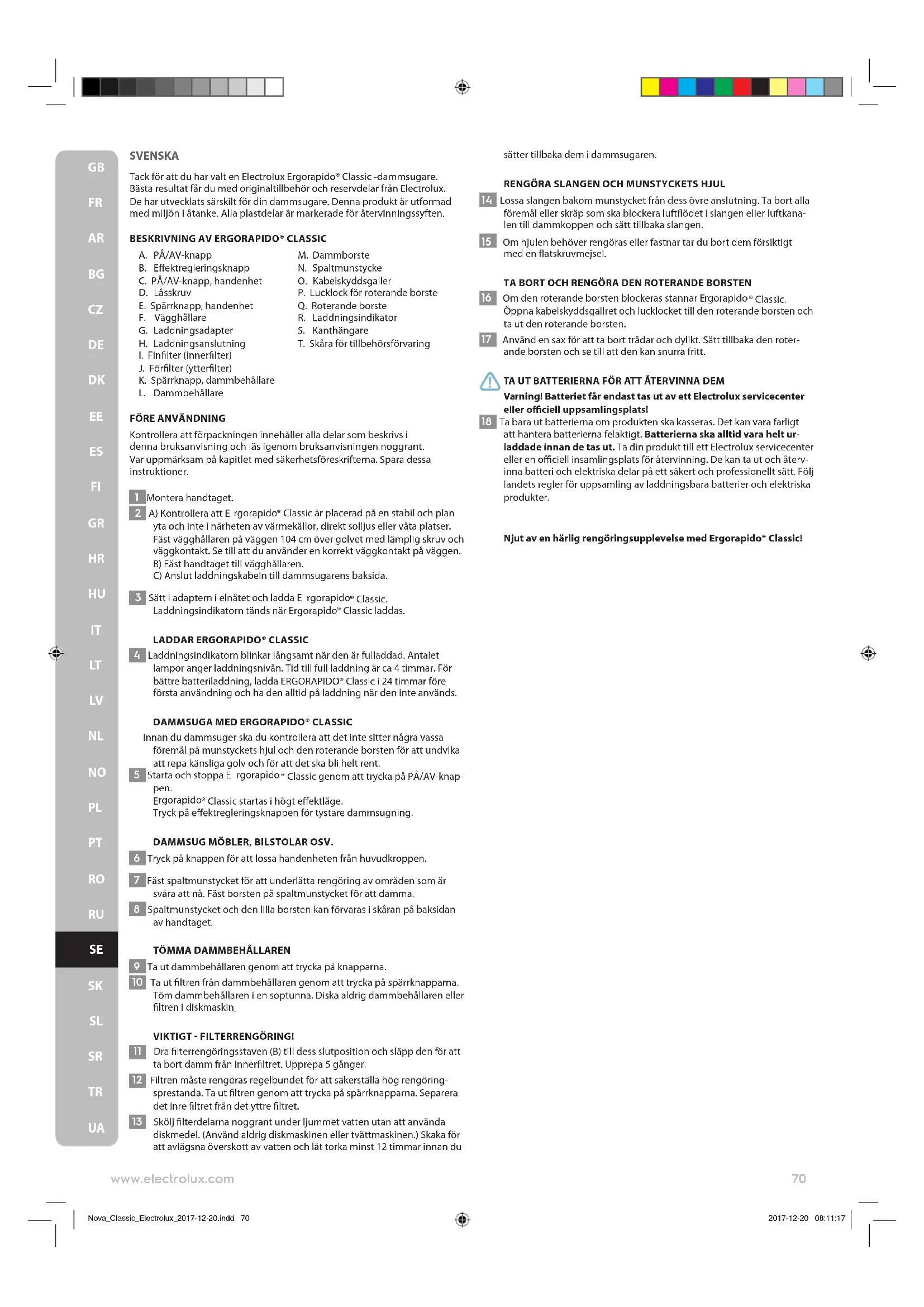 Nova_Classic_Electrolux_2017-12-20.indd 69 2017-12-20 08:11:17SVENSKA Tack för att du har valt en Electrolux Ergorapido® Classic -dammsugare. Bästa resultat får du med originaltillbehör och reservdelar från Electrolux. De har utvecklats särskilt för din dammsugare. Denna produkt är utformad med miljön i åtanke. Alla plastdelar är markerade för återvinningssyften.