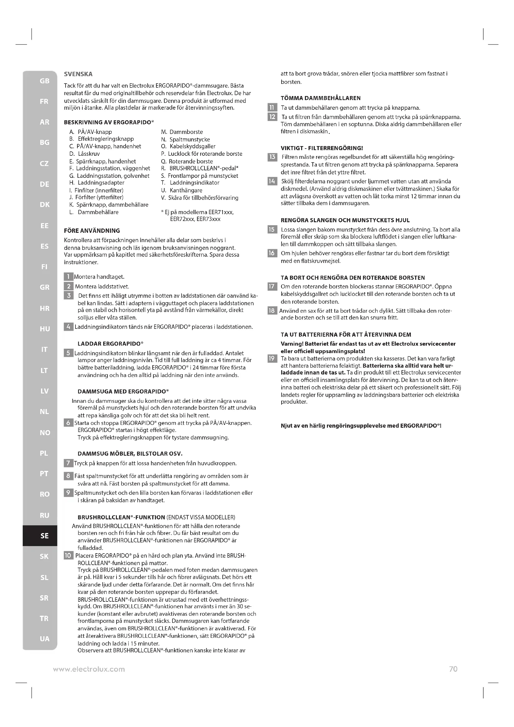UASVENSKA Tack för att du har valt en Electrolux ERGORAPIDO®-dammsugare. Bästa resultat får du med originaltillbehör och reservdelar från Electrolux. De har utvecklats särskilt för din dammsugare. Denna produkt är utformad med miljön i åtanke. Alla plastdelar är markerade för återvinningssyften.