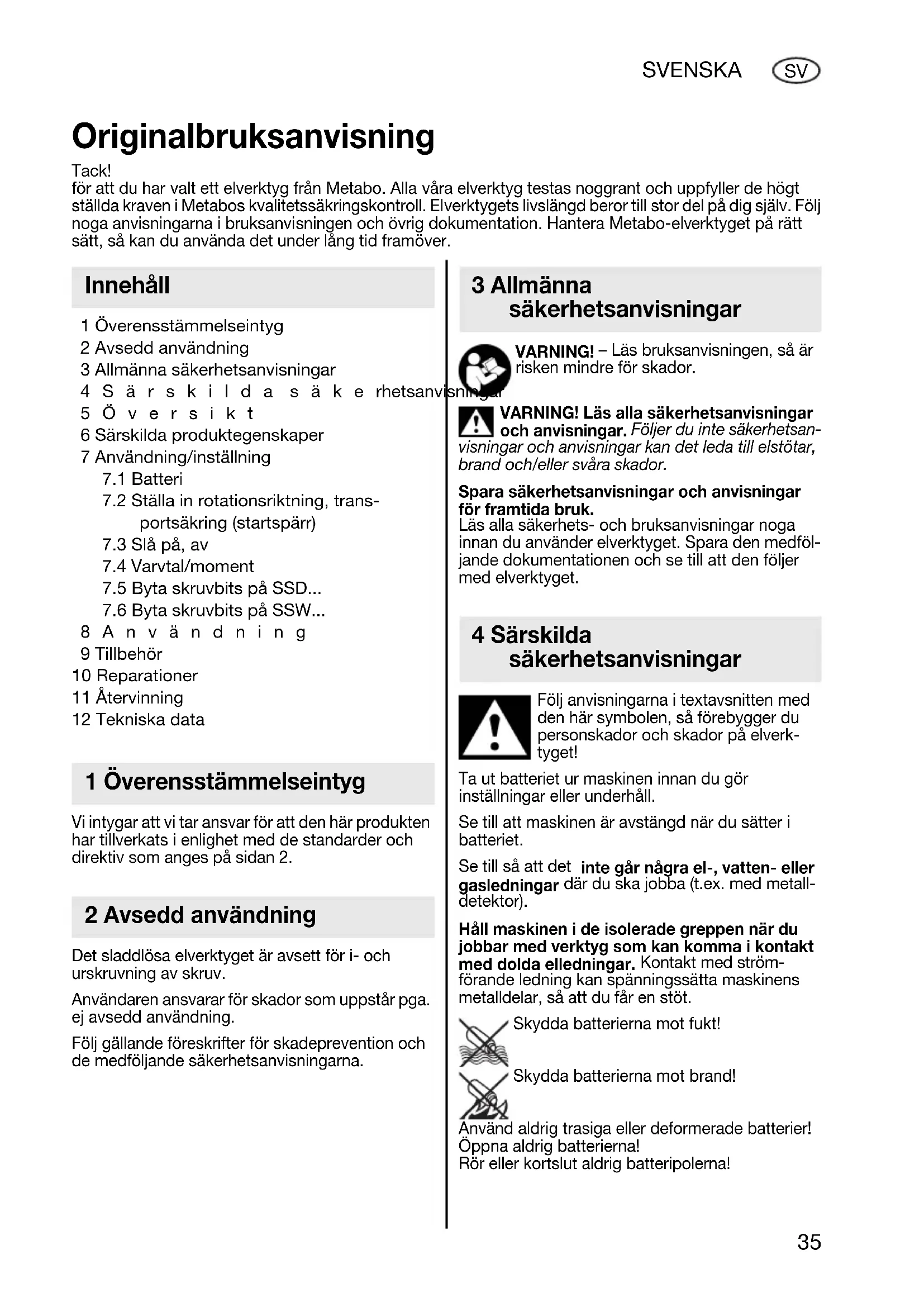 8Användning 9 Tillbehör 10 Reparationer 11 Återvinning 12 Tekniska data Vi intygar att vi tar ansvar för att den här produkten har tillverkats i enlighet med de standarder och direktiv som anges på sidan 2. Det sladdlösa elverktyget är avsett för i- och urskruvning av skruv. Användaren ansvarar för skador som uppstår pga. ej avsedd användning. Följ gällande föreskrifter för skadeprevention och de medföljande säkerhetsanvisningarna. VARNING! – Läs bruksanvisningen, så är risken mindre för skador. VARNING! Läs alla säkerhetsanvisningar och anvisningar. Följer du inte säkerhetsan- visningar och anvisningar kan det leda till elstötar, brand och/eller svåra skador. Spara säkerhetsanvisningar och anvisningar för framtida bruk. Läs alla säkerhets- och bruksanvisningar noga innan du använder elverktyget. Spara den medföl- jande dokumentationen och se till att den följer med elverktyget. Följ anvisningarna i textavsnitten med den här symbolen, så förebygger du personskador och skador på elverk- tyget! Ta ut batteriet ur maskinen innan du gör inställningar eller underhåll. Se till att maskinen är avstängd när du sätter i batteriet. Se till så att det inte går några el-, vatten- eller gasledningar där du ska jobba (t.ex. med metall- detektor). Håll maskinen i de isolerade greppen när du jobbar med verktyg som kan komma i kontakt med dolda elledningar. Kontakt med ström- förande ledning kan spänningssätta maskinens metalldelar, så att du får en stöt. Skydda batterierna mot fukt! Skydda batterierna mot brand! Använd aldrig trasiga eller deformerade batterier! Öppna aldrig batterierna! Rör eller kortslut aldrig batteripolerna! Originalbruksanvisning Tack! för att du har valt ett elverktyg från Metabo. Alla våra elverktyg testas noggrant och uppfyller de högt ställda kraven i Metabos kvalitetssäkringskontroll. Elverktygets livslängd beror till stor del på dig själv. Följ noga anvisningarna i bruksanvisningen och övrig dokumentation. Hantera Metabo-elverktyget på rätt sätt, så kan du använda det under lång tid framöver. Innehåll 1 Överensstämmelseintyg 2 Avsedd användning 3 Allmänna säkerhetsanvisningar 4 Särskilda säkerhetsanvisningar 17026933_0311 SSW SSD 14_4 18.book Seite 35 Mittwoch, 9. März 2011 1:55 1336 SVENSKA