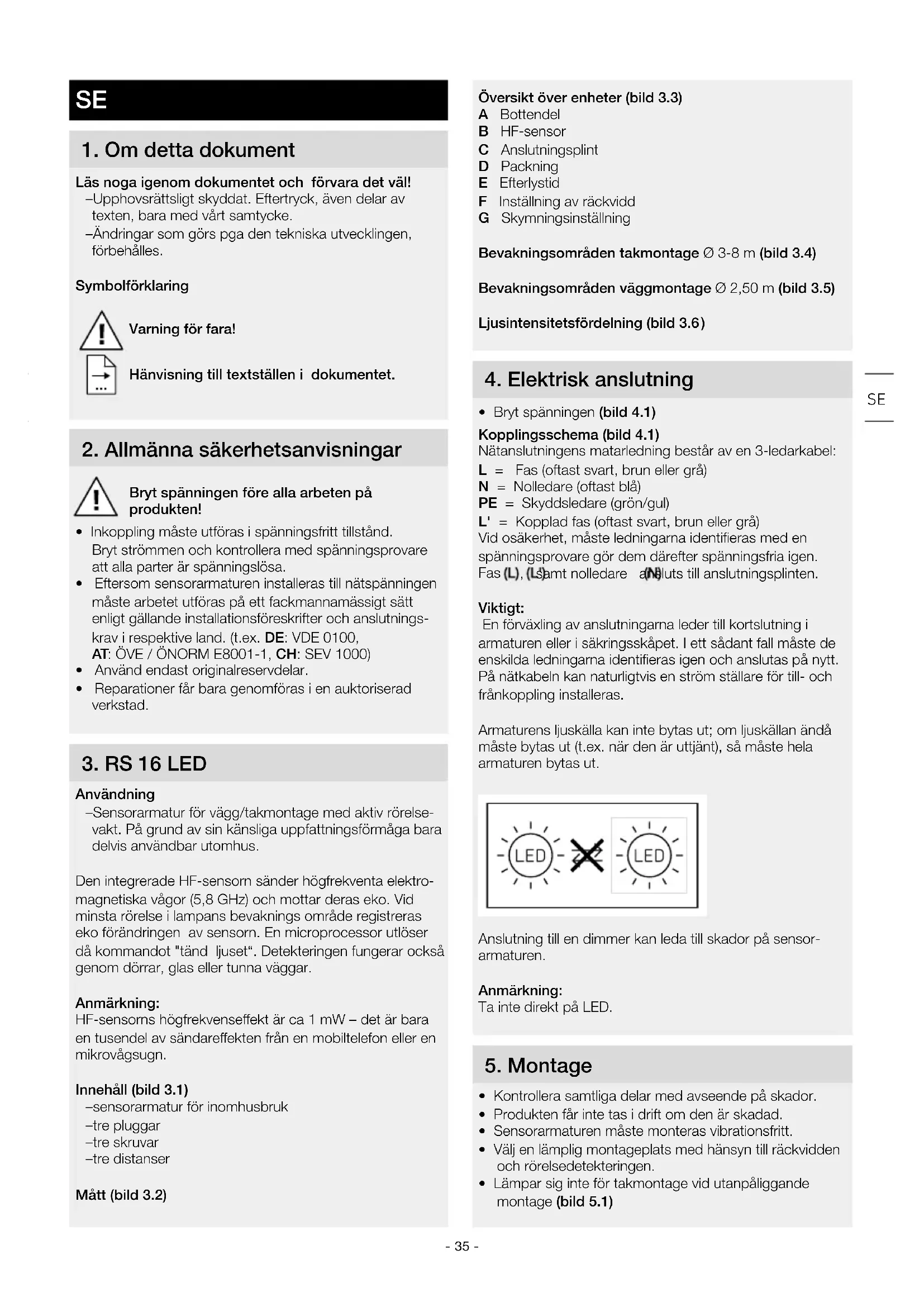 Översikt över enheter (bild 3.3) A Bottendel B HF-sensor C Anslutningsplint D Packning E Efterlystid F Inställning av räckvidd G Skymningsinställning Bevakningsområden takmontage Ø 3-8m (bild 3.4) Bevakningsområden väggmontage Ø 2,50 m (bild 3.5) Ljusintensitetsfördelning (bild3.6 )