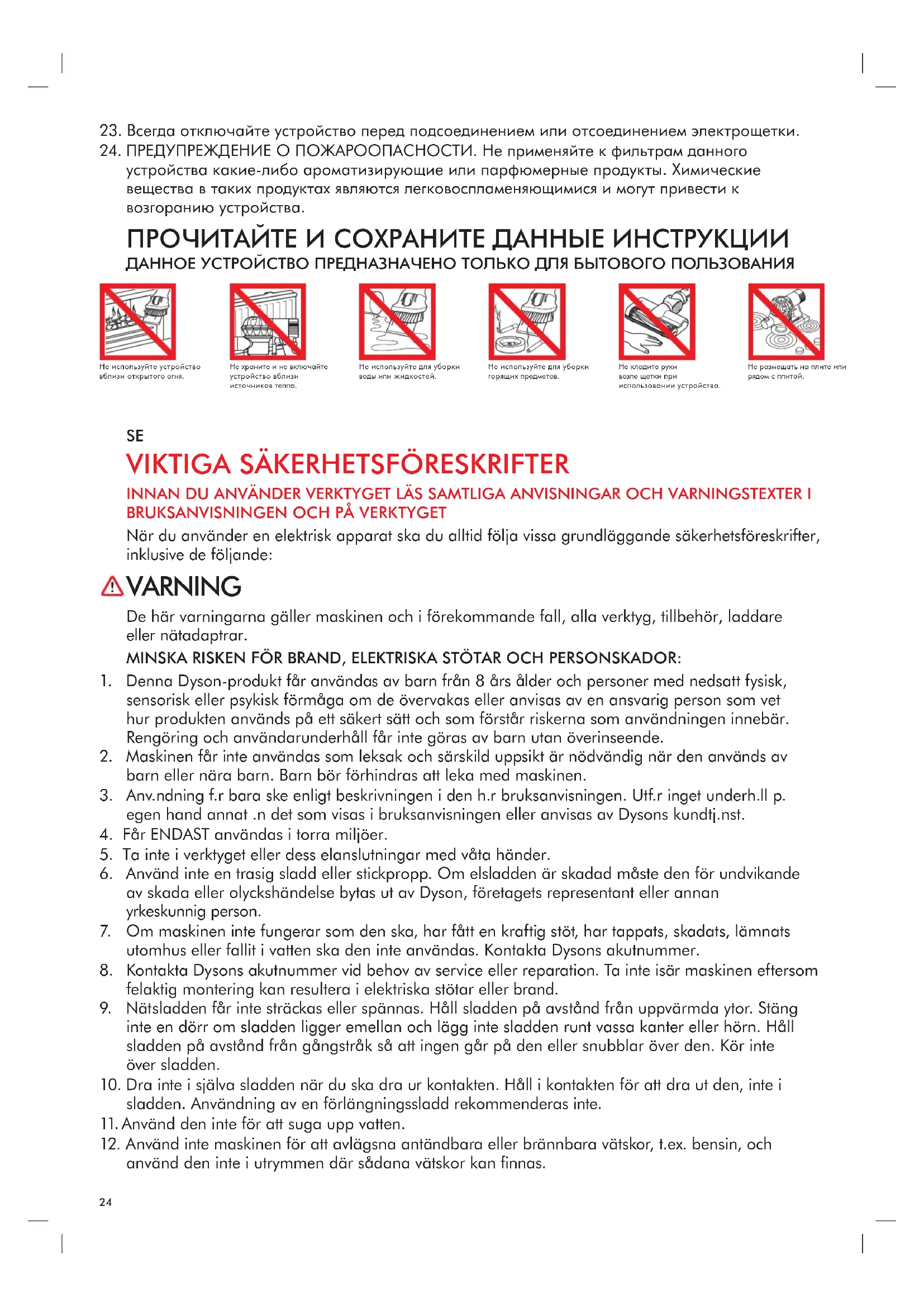 21. Använd bara laddare från Dyson när Dyson-maskinen laddas upp. Använd bara batterier från