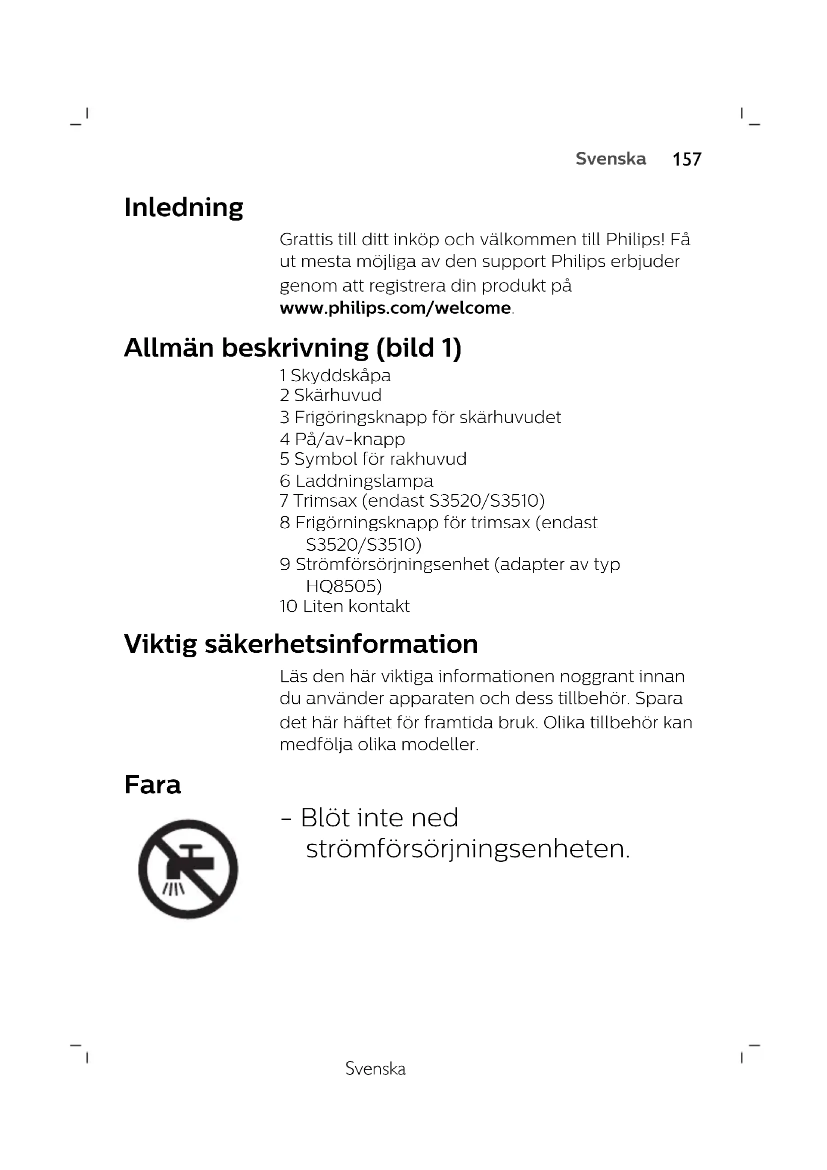 SuomiSvenska Inledning Grattis till ditt inköp och välkommen till Philips! Få ut mesta möjliga av den support Philips erbjuder genom att registrera din produkt på www.philips.com/welcome. Allmän beskrivning (bild 1) 1 Skyddskåpa 2 Skärhuvud 3 Frigöringsknapp för skärhuvudet 4 På/av-knapp 5 Symbol för rakhuvud 6 Laddningslampa 7 Trimsax (endast S3520/S3510) 8 Frigörningsknapp för trimsax (endast S3520/S3510) 9 Strömförsörjningsenhet (adapter av typ HQ8505) 10 Liten kontakt Viktig säkerhetsinformation Läs den här viktiga informationen noggrant innan du använder apparaten och dess tillbehör. Spara det här häftet för framtida bruk. Olika tillbehör kan medfölja olika modeller. Fara - Blöt inte ned strömförsörjningsenheten.