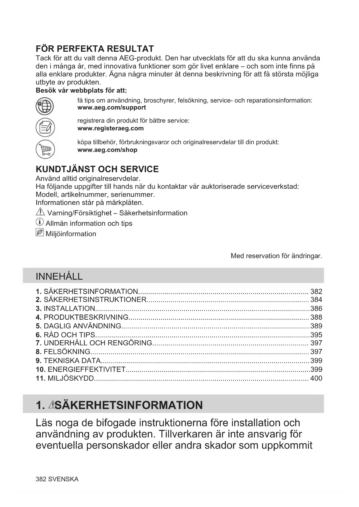 Tack för att du valt denna AEG-produkt. Den har utvecklats för att du ska kunna använda den i många år, med innovativa funktioner som gör livet enklare – och som inte finns på alla enklare produkter. Ägna några minuter åt denna beskrivning för att få största möjliga utbyte av produkten. Besök vår webbplats för att:få tips om användning, broschyrer, felsökning, service- och reparationsinformation:www.aeg.com/supportregistrera din produkt för bättre service:www.registeraeg.comköpa tillbehör, förbrukningsvaror och originalreservdelar till din produkt:www.aeg.com/shop