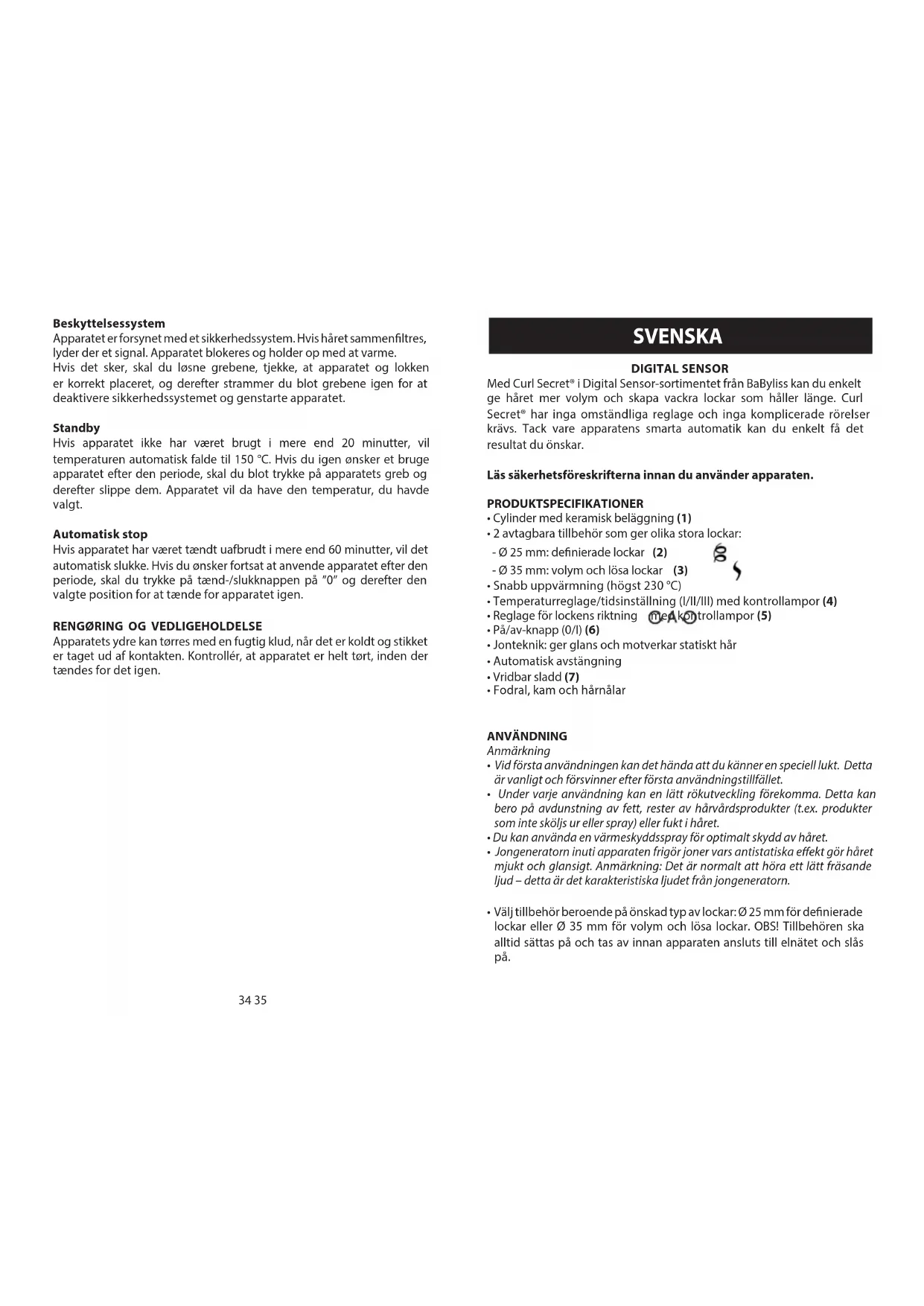 Apparatets ydre kan tørres med en fugtig klud, når det er koldt og stikket er taget ud af kontakten. Kontrollér, at apparatet er helt tørt, inden der tændes for det igen. SVENSKA DIGITAL SENSOR Med Curl Secret® i Digital Sensor-sortimentet från BaByliss kan du enkelt ge håret mer volym och skapa vackra lockar som håller länge. Curl Secret® har inga omständliga reglage och inga komplicerade rörelser krävs. Tack vare apparatens smarta automatik kan du enkelt få det resultat du önskar. Läs säkerhetsföreskrifterna innan du använder apparaten. PRODUKTSPECIFIKATIONER