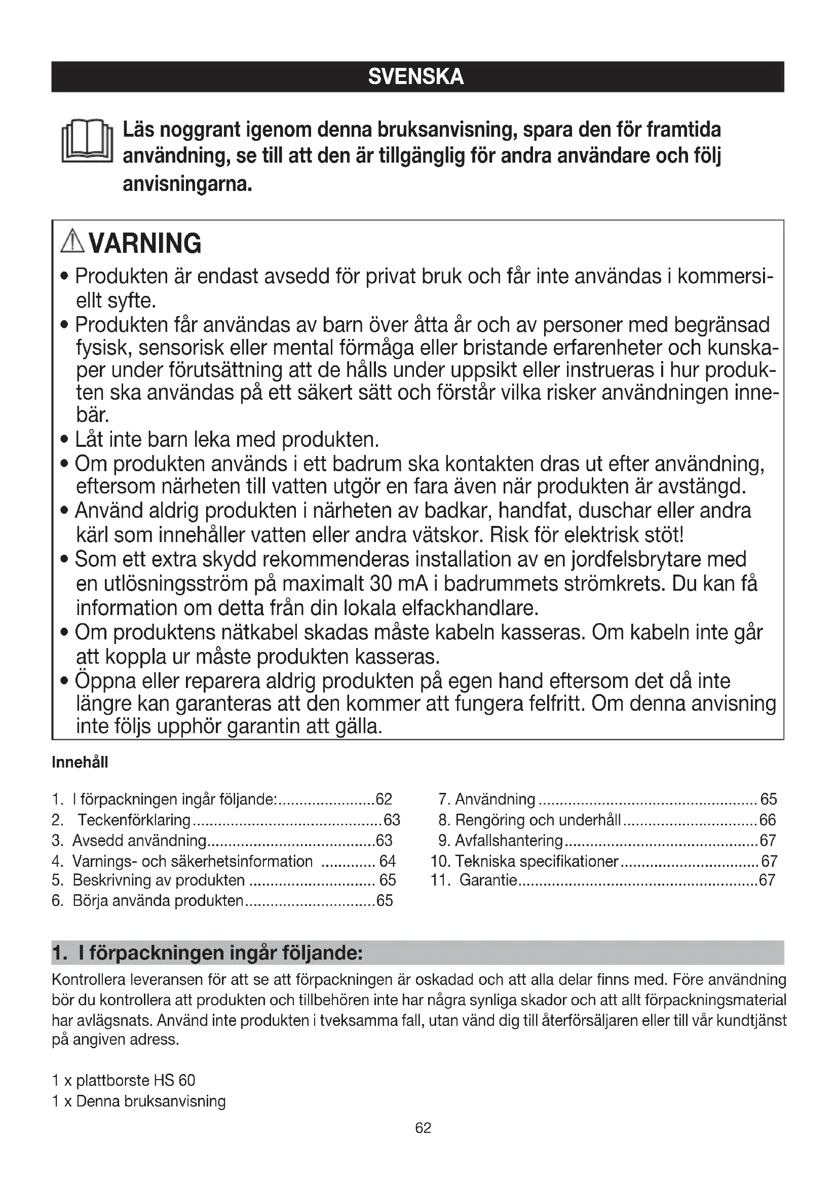 Kontrollera leveransen för att se att förpackningen är oskadad och att alla delar finns med. Före användning bör du kontrollera att produkten och tillbehören inte har några synliga skador och att allt förpackningsmaterial har avlägsnats. Använd inte produkten i tveksamma fall, utan vänd dig till återförsäljaren eller till vår kundtjänst på angiven adress. 1 x plattborste HS 60 1 x Denna bruksanvisning63