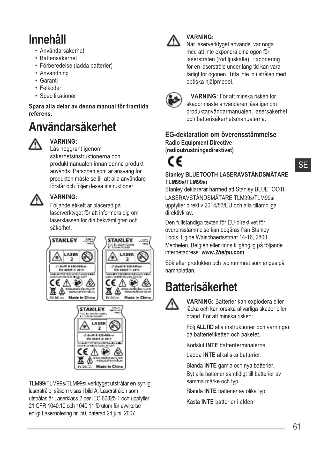 TLM99si TLM99/TLM99s/TLM99si verktyget utstrålar en synlig laserstråle, såsom visas i bild A. Laserstrålen som utstrålas är Laserklass 2 per IEC 60825-1 och uppfyller 21 CFR 1040.10 och 1040.11 förutom för avvikelse enligt Lasernotering nr. 50, daterad 24 juni, 2007.VARNING:När laserverktyget används, var noga med att inte exponera dina ögon för laserstrålen (röd ljuskälla). Exponering för en laserstråle under lång tid kan vara farligt för ögonen. Titta inte in i strålen med optiska hjälpmedel. VARNING: För att minska risken för skador måste användaren läsa igenom produktanvändarmanualen, lasersäkerhet och batterisäkerhetsmanualerna. EG-deklaration om överensstämmelse Radio Equipment Directive (radioutrustningsdirektivet)Stanley BLUETOOTH LASERAVSTÅNDSMÄTARE TLM99s/TLM99siStanley deklarerar härmed att Stanley BLUETOOTH LASERAVSTÅNDSMÄTARE TLM99s/TLM99si uppfyller direktiv 2014/53/EU och alla tillämpliga direktivkrav.Den fullständiga texten för EU-direktivet för överensstämmelse kan begäras från Stanley Tools, Egide Walschaertsstraat 14-16, 2800 Mechelen, Belgien eller nns tillgänglig på följande internetadress: www.2helpu.com.Sök efter produkten och typnummret som anges på namnplattan. Batterisäkerhet VARNING: Batterier kan explodera eller läcka och kan orsaka allvarliga skador eller brand. För att minska risken:Följ ALLTID alla instruktioner och varningar på batterietiketten och paketet. Kortslut INTE batteriterminalerna. Ladda INTE alkaliska batterier.Blanda INTE gamla och nya batterier. Byt alla batterier samtidigt till batterier av samma märke och typ.Blanda INTE batterier av olika typ.Kasta INTE batterier i elden.SE