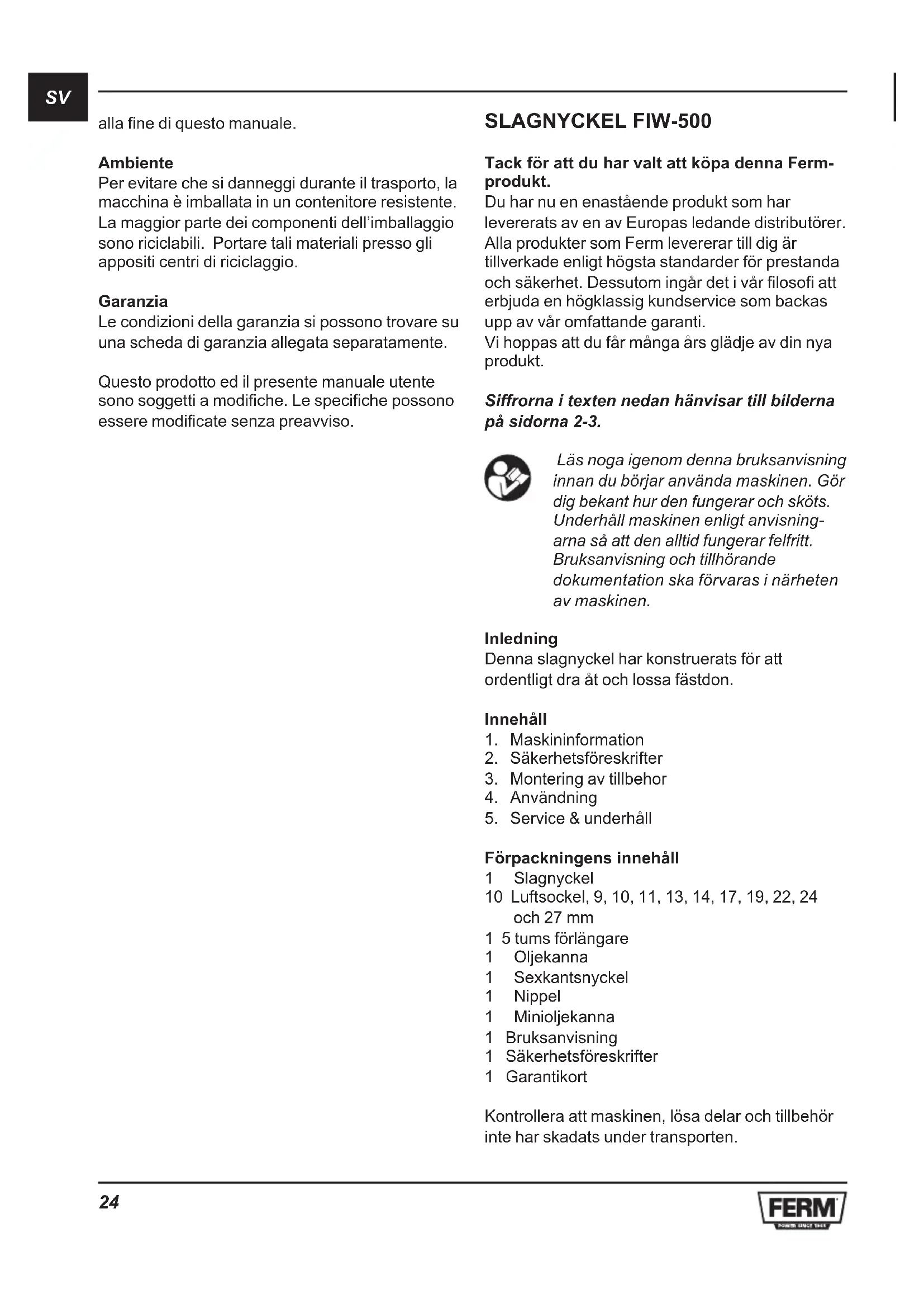 alla fine di questo manuale. Ambiente Per evitare che si danneggi durante il trasporto, la macchina è imballata in un contenitore resistente. La maggior parte dei componenti dell’imballaggio sono riciclabili. Portare tali materiali presso gli appositi centri di riciclaggio. Garanzia Le condizioni della garanzia si possono trovare su una scheda di garanzia allegata separatamente. Questo prodotto ed il presente manuale utente sono soggetti a modifiche. Le specifiche possono essere modificate senza preavviso. SLAGNYCKEL FIW-500 Tack för att du har valt att köpa denna Ferm- produkt. Du har nu en enastående produkt som har levererats av en av Europas ledande distributörer. Alla produkter som Ferm levererar till dig är tillverkade enligt högsta standarder för prestanda och säkerhet. Dessutom ingår det i vår filosofi att erbjuda en högklassig kundservice som backas upp av vår omfattande garanti. Vi hoppas att du får många års glädje av din nya produkt. Siffrorna i texten nedan hänvisar till bilderna på sidorna 2-3. Läs noga igenom denna bruksanvisning innan du börjar använda maskinen. Gör dig bekant hur den fungerar och sköts. Underhåll maskinen enligt anvisning- arna så att den alltid fungerar felfritt. Bruksanvisning och tillhörande dokumentation ska förvaras i närheten av maskinen. Inledning Denna slagnyckel har konstruerats för att ordentligt dra åt och lossa fästdon. Innehåll