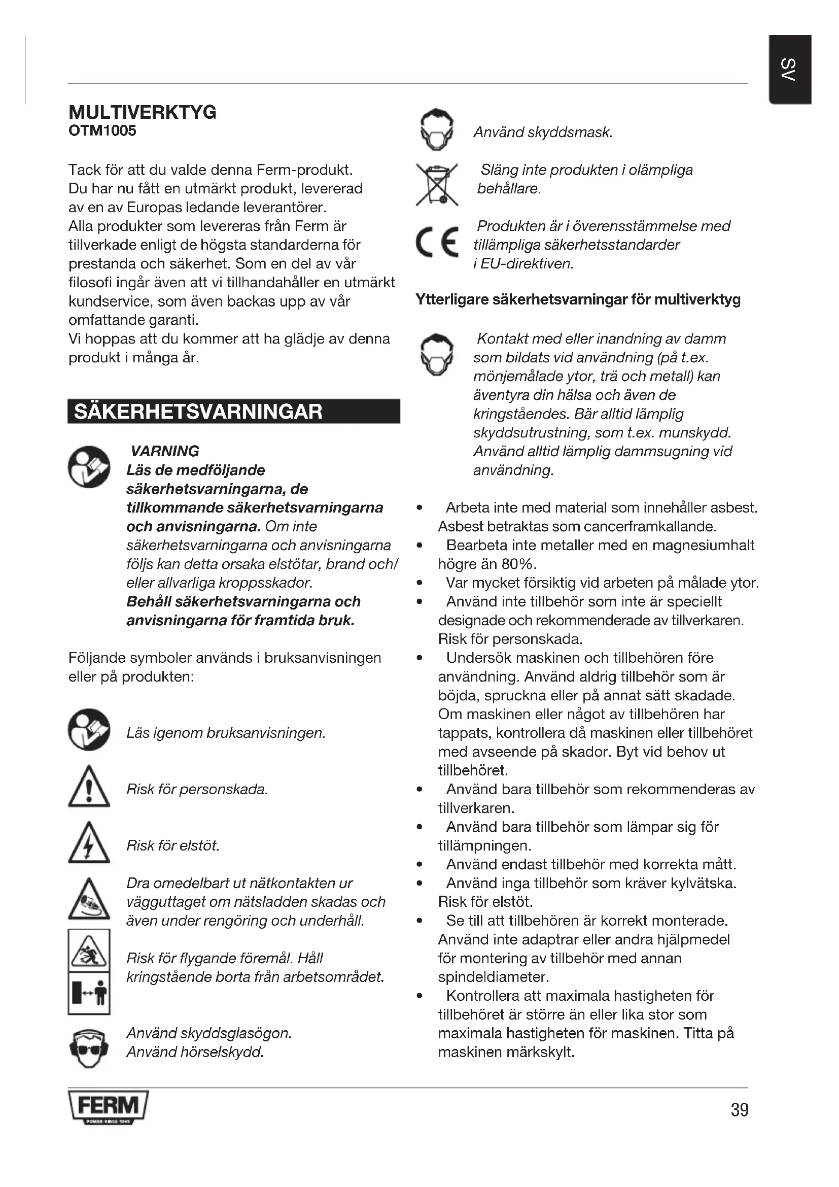 MULTIVERKTYG OTM1005 TackförattduvaldedennaFerm-produkt. Duharnufåttenutmärktprodukt,levererad av en av Europas ledande leverantörer. AllaproduktersomlevererasfrånFermär tillverkade enligt de högsta standarderna för prestandaochsäkerhet.Somendelavvår filosofiingårävenattvitillhandahållerenutmärkt kundservice,somävenbackasuppavvår omfattande garanti. Vihoppasattdukommeratthaglädjeavdenna produktimångaår. SÄKERHETSVARNINGAR VARNING Läs de medföljande säkerhetsvarningarna, de tillkommande säkerhetsvarningarna och anvisningarna. Om inte säkerhetsvarningarna och anvisningarna följs kan detta orsaka elstötar, brand och/ eller allvarliga kroppsskador. Behåll säkerhetsvarningarna och anvisningarna för framtida bruk. Följandesymboleranvändsibruksanvisningen ellerpåprodukten: Läs igenom bruksanvisningen. Risk för personskada. Risk för elstöt. Dra omedelbart ut nätkontakten ur vägguttaget om nätsladden skadas och även under rengöring och underhåll. Risk för flygande föremål. Håll kringstående borta från arbetsområdet. Använd skyddsglasögon. Använd hörselskydd. Använd skyddsmask. Släng inte produkten i olämpliga behållare. Produkten är i överensstämmelse med tillämpliga säkerhetsstandarder i EU-direktiven. Ytterligare säkerhetsvarningar för multiverktyg Kontakt med eller inandning av damm som bildats vid användning (på t.ex. mönjemålade ytor, trä och metall) kan äventyra din hälsa och även de kringståendes. Bär alltid lämplig skyddsutrustning, som t.ex. munskydd. Använd alltid lämplig dammsugning vid användning.