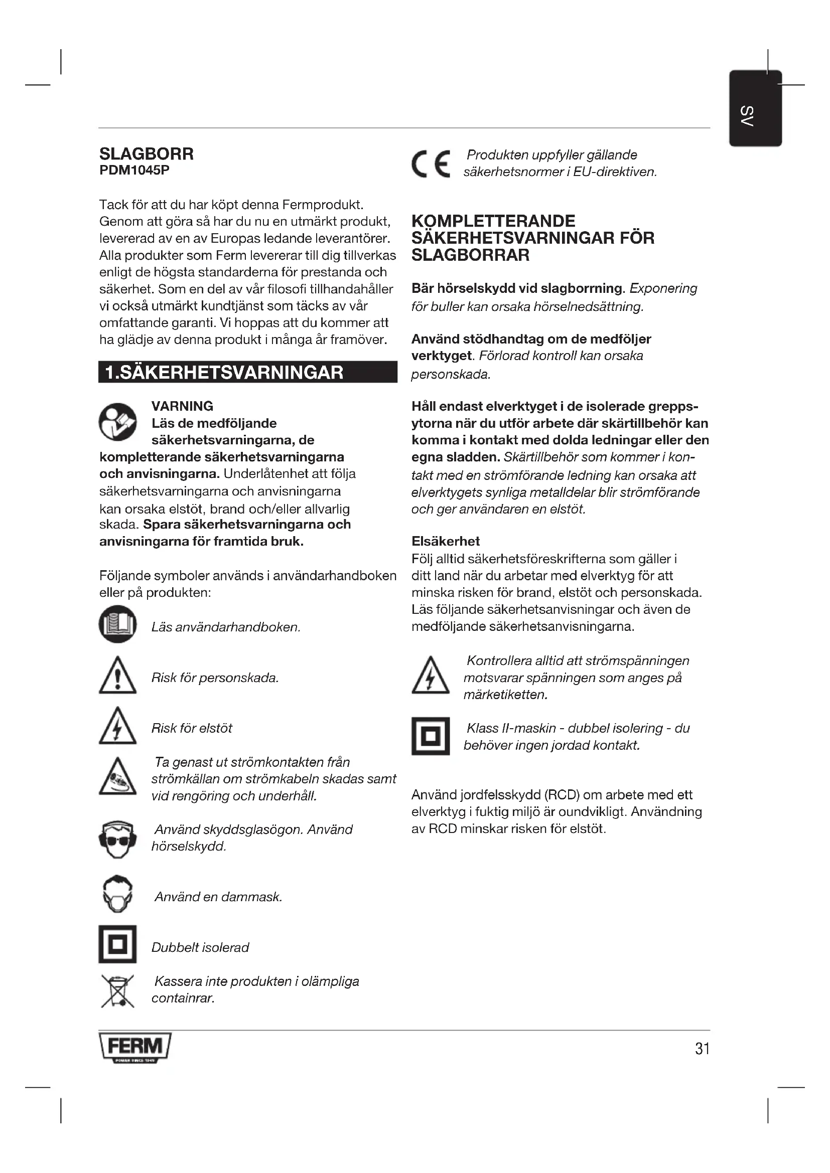SLAGBORR PDM1045P Tack för att du har köpt denna Fermprodukt. Genom att göra så har du nu en utmärkt produkt, levererad av en av Europas ledande leverantörer. Alla produkter som Ferm levererar till dig tillverkas enligt de högsta standarderna för prestanda och säkerhet. Som en del av vår filosofi tillhandahåller vi också utmärkt kundtjänst som täcks av vår omfattande garanti. Vi hoppas att du kommer att ha glädje av denna produkt i många år framöver.
