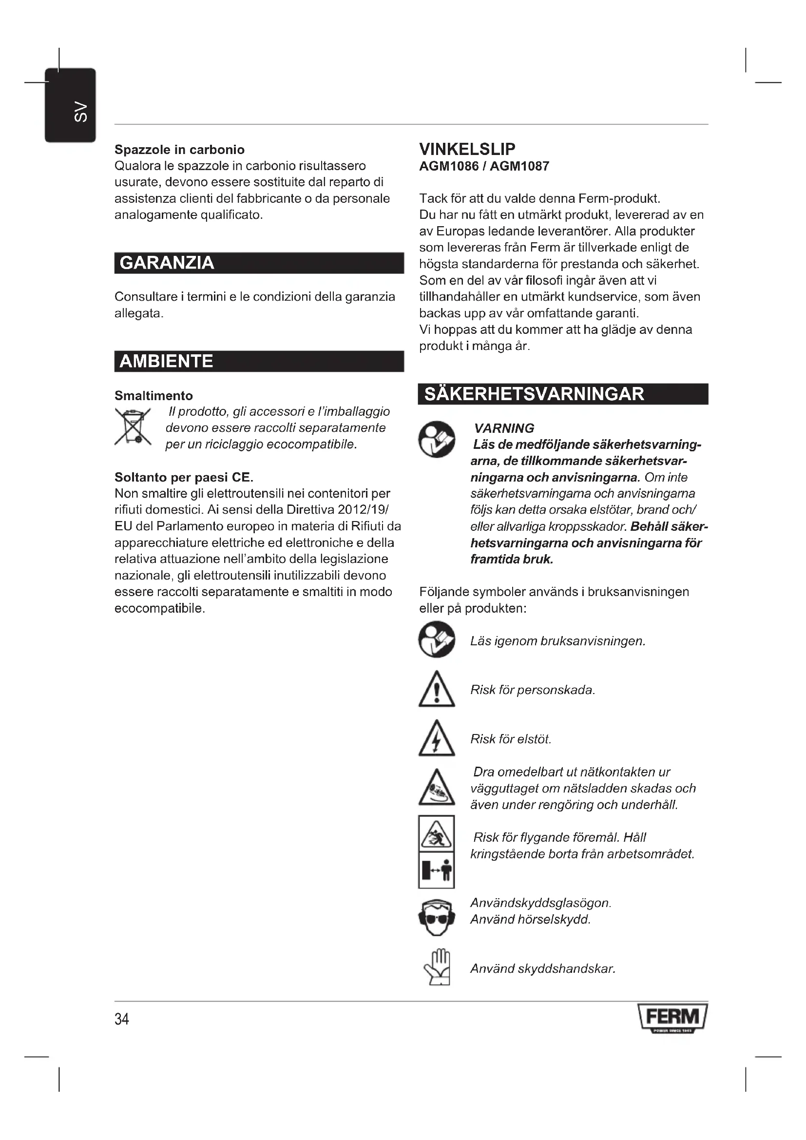 Spazzole in carbonio Qualora le spazzole in carbonio risultassero usurate, devono essere sostituite dal reparto di assistenza clienti del fabbricante o da personale analogamente qualificato. GARANZIA Consultare i termini e le condizioni della garanzia allegata. AMBIENTE Smaltimento Il prodotto, gli accessori e l’imballaggio devono essere raccolti separatamente per un riciclaggio ecocompatibile. Soltanto per paesi CE. Non smaltire gli elettroutensili nei contenitori per rifiuti domestici. Ai sensi della Direttiva 2012/19/ EU del Parlamento europeo in materia di Rifiuti da apparecchiature elettriche ed elettroniche e della relativa attuazione nell’ambito della legislazione nazionale, gli elettroutensili inutilizzabili devono essere raccolti separatamente e smaltiti in modo ecocompatibile. VINKELSLIP AGM1086 / AGM1087 Tack för att du valde denna Ferm-produkt. Du har nu fått en utmärkt produkt, levererad av en av Europas ledande leverantörer. Alla produkter som levereras från Ferm är tillverkade enligt de högsta standarderna för prestanda och säkerhet. Som en del av vår filosofi ingår även att vi tillhandahåller en utmärkt kundservice, som även backas upp av vår omfattande garanti. Vi hoppas att du kommer att ha glädje av denna produkt i många år. SÄKERHETSVARNINGAR VARNING Läs de medföljande säkerhetsvarning- arna, de tillkommande säkerhetsvar- ningarna och anvisningarna. Om inte säkerhetsvarningarna och anvisningarna följs kan detta orsaka elstötar, brand och/ eller allvarliga kroppsskador. Behåll säker- hetsvarningarna och anvisningarna för framtida bruk. Följande symboler används i bruksanvisningen eller på produkten: Läs igenom bruksanvisningen. Risk för personskada. Risk för elstöt. Dra omedelbart ut nätkontakten ur vägguttaget om nätsladden skadas och även under rengöring och underhåll. Risk för flygande föremål. Håll kringstående borta från arbetsområdet. Använd skyddsglasögon. Använd hörselskydd. Använd skyddshandskar.35
