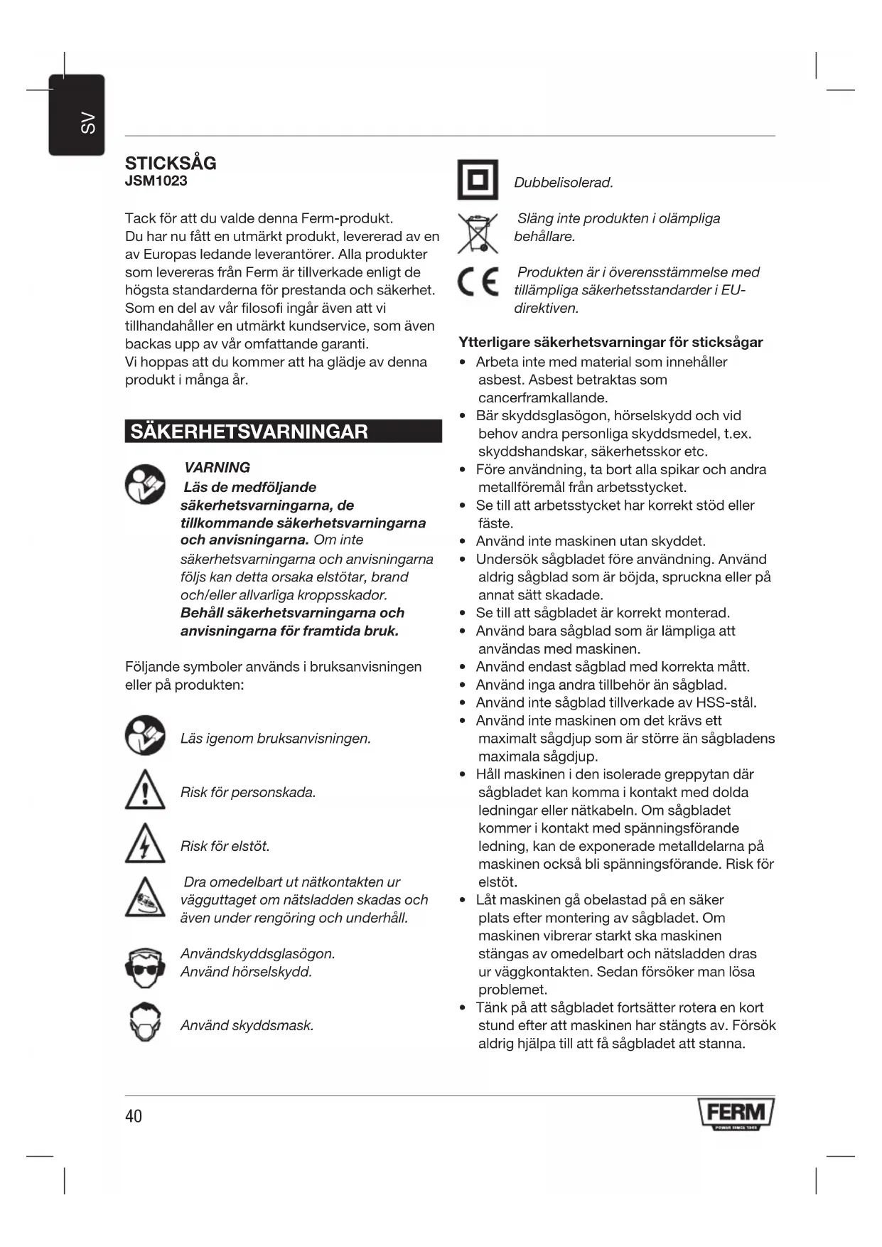 STICKSÅG JSM1023 Tack för att du valde denna Ferm-produkt. Du har nu fått en utmärkt produkt, levererad av en av Europas ledande leverantörer. Alla produkter som levereras från Ferm är tillverkade enligt de högsta standarderna för prestanda och säkerhet. Som en del av vår filosofi ingår även att vi tillhandahåller en utmärkt kundservice, som även backas upp av vår omfattande garanti. Vi hoppas att du kommer att ha glädje av denna produkt i många år. SÄKERHETSVARNINGAR VARNING Läs de medföljande säkerhetsvarningarna, de tillkommande säkerhetsvarningarna och anvisningarna. Om inte säkerhetsvarningarna och anvisningarna följs kan detta orsaka elstötar, brand och/eller allvarliga kroppsskador. Behåll säkerhetsvarningarna och anvisningarna för framtida bruk. Följande symboler används i bruksanvisningen eller på produkten: Läs igenom bruksanvisningen. Risk för personskada. Risk för elstöt. Dra omedelbart ut nätkontakten ur vägguttaget om nätsladden skadas och även under rengöring och underhåll. Använd skyddsglasögon. Använd hörselskydd. Använd skyddsmask. Dubbelisolerad. Släng inte produkten i olämpliga behållare. Produkten är i överensstämmelse med tillämpliga säkerhetsstandarder i EU- direktiven. Ytterligare säkerhetsvarningar för sticksågar