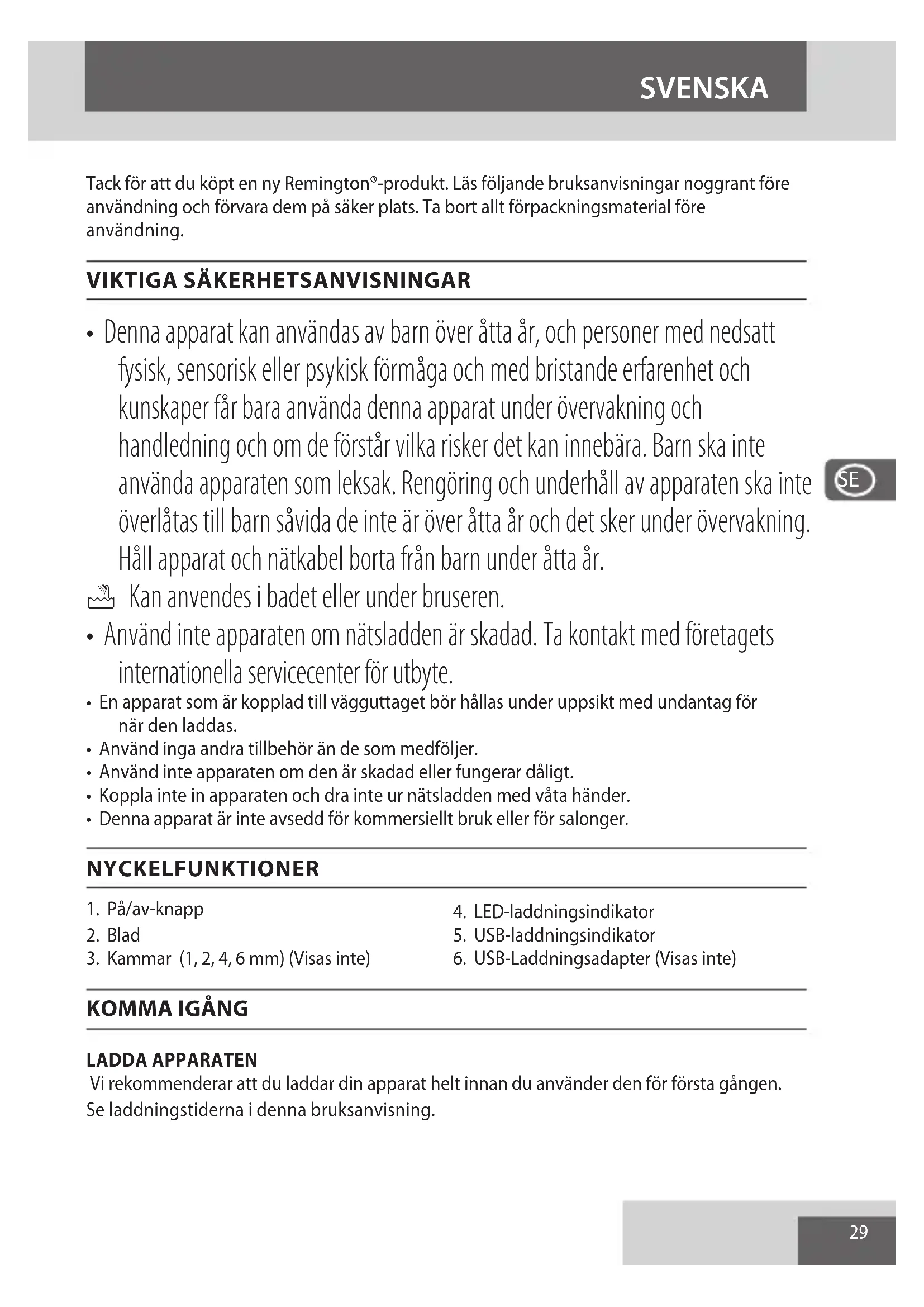 - En apparat som är kopplad till vägguttaget bör hållas under uppsikt med undantag för när den laddas.• Använd inga andra tillbehör än de som medföljer.• Använd inte apparaten om den är skadad eller fungerar dåligt.• Koppla inte in apparaten och dra inte ur nätsladden med våta händer.• Denna apparat är inte avsedd för kommersiellt bruk eller för salonger. NYCKELFUNKTIONER 1. På/av-knapp2. Blad3. Kammar (1, 2, 4, 6 mm) (Visas inte)4. LED-laddningsindikator5. USB-laddningsindikator6. USB-Laddningsadapter (Visas inte)
