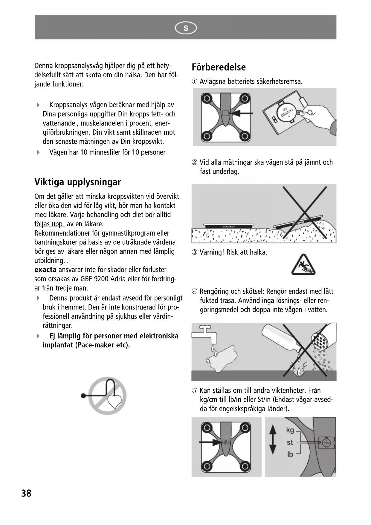 ④ Rengoring och skötsel: Rengör endast med lätt fuktad trasa. Använd inga losnings-ller ren-goringsmedel och doppa inte vagen i vatten.