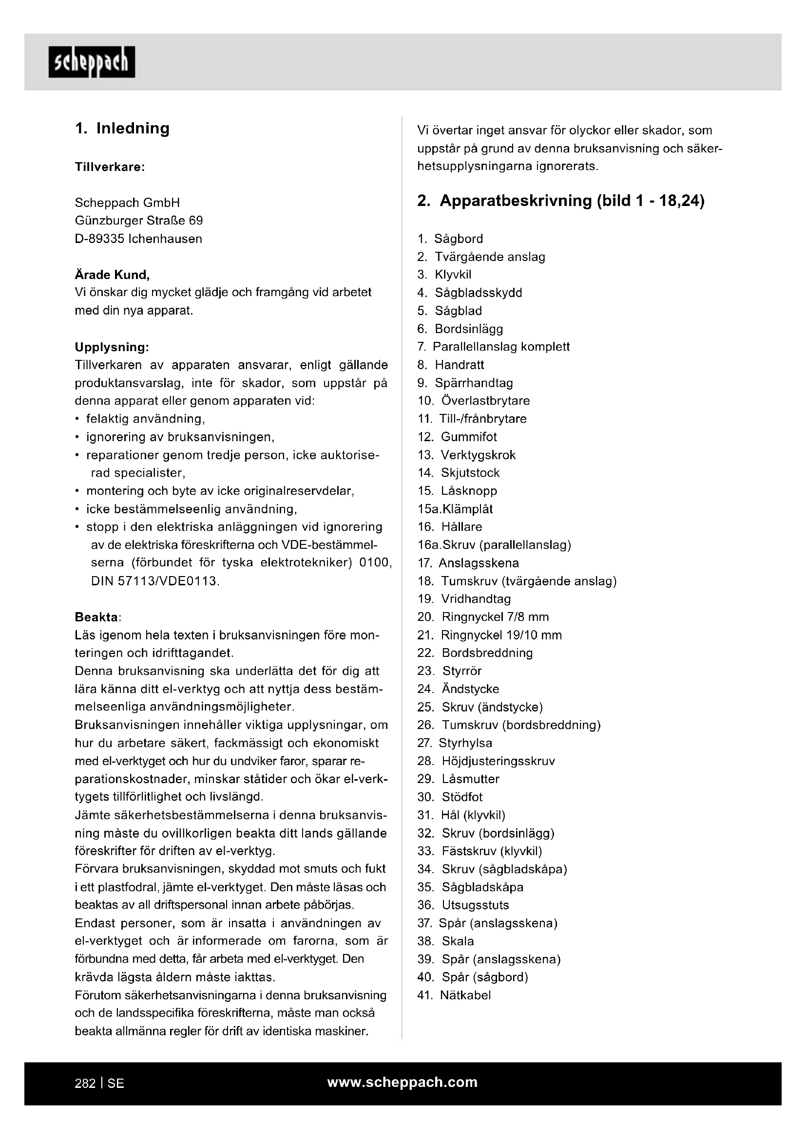 Bordscirkelsågen är ägnad för längs-och tvärsnitt (en- dast med transversellt stopp) av alla sorters trä, mot- svarande maskinstorleken. Ingen sorts rundträ får sågas. Maskinen får endast användas för de ändamål den är avsedd för. All ytterligare användning är inte ändamålsenlig. An- vändaren/operatören och inte tillverkaren är ansvarig för alla material- eller personskador som därigenom uppstår. Endast sågblad som är lämpade för maskinen (HM- el- ler CV-sågblad) får användas. All användning av HSS-sågblad och kapskivor är för- bjuden. Till ändamålsenlig användning hör även iakt- tagande av säkerhetsanvisningarna samt monterings- och driftsanvisningen i bruksanvisningen. Personer som manövrerar och underhåller maskinen måste vara förtrodda med denna och informerade om tänkbara faror. Dessutom måste de gällande föreskrif- terna för förebyggande av olycka följas. Övriga allmänna regler inom de arbetsmedicinska och säkerhetstekniska områdena ska beaktas. m Obs! Vid användning av apparater måste åtskilliga säker- hetsåtgärder iakttagas för att förhindra person- och materialskador.Läs därför noga igenom denna bruks- anvisning / dessa säkerhetsföreskrifter. Spara den/ dem så att du när som helst har informationen till hands. Om du överlämnar apparaten till andra perso- ner, lämna även över denna bruksanvisning / dessa säkerhetsanvisningar. Vi övertar inget ansvar för olyckor eller skador som uppstår om denna bruksan- visning och säkerhetsanvisningarna inte följs.www.scheppach.com