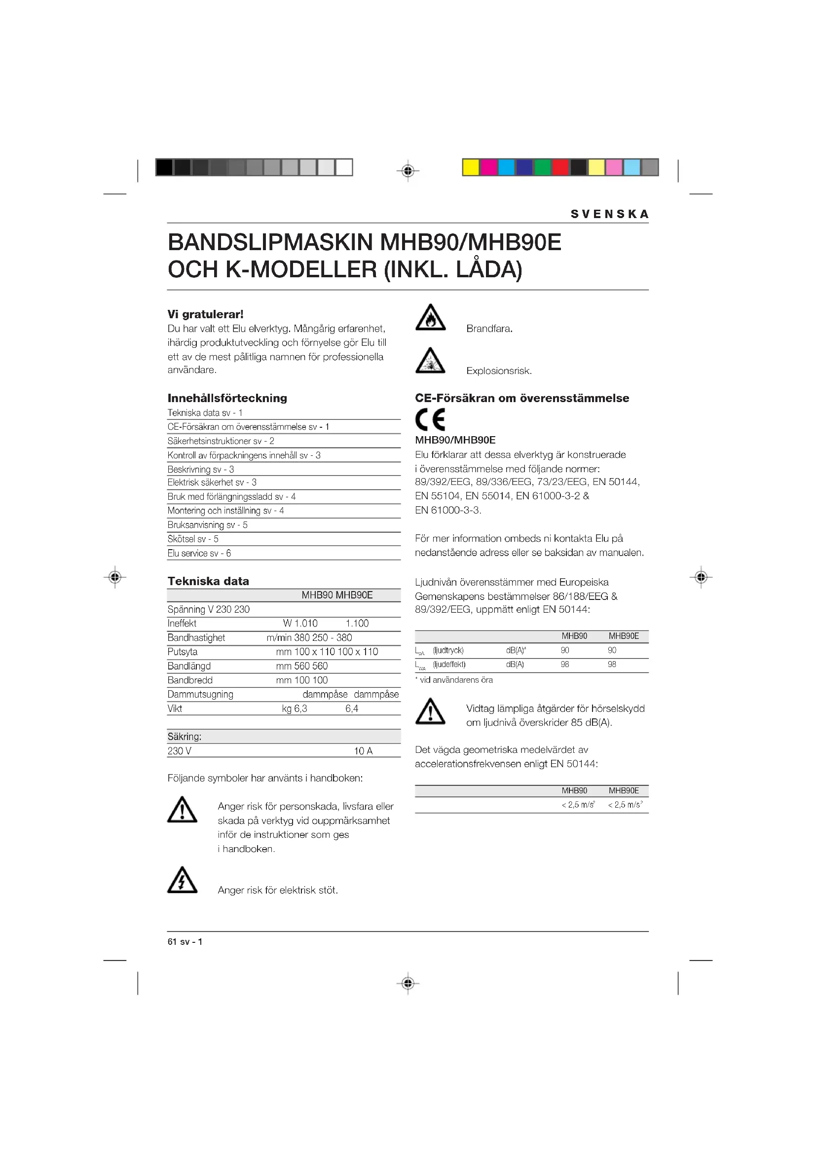 (ljudeffekt) dB(A) 98 98* vid användarens öra Vidtag lämpliga åtgärder för hörselskydd om ljudnivå överskrider 85 dB(A). Det vägda geometriska medelvärdet av accelerationsfrekvensen enligt EN 50144: MHB90 MHB90E< 2,5 m/s < 2,5 m/s 2SVENSKA sv - 2 62 Director Engineering and Product Development Horst Großmann Elu International, Richard-Klinger-Straße 40, D-65510, Idstein, Tyskland Säkerhetsinstruktioner Innan Du börjar använda maskinen, tag några minuter i anspråk för att läsa igenom bruksanvisningen. Spara bruksanvisningen lättillgängligt, så att alla som använder maskinen har tillgång till bruksanvisningen. Förutom nedanstående instruktioner, följ alltid Arbetarskyddsstyrelsens regler. VARNING! När man använder elverktyg skall dessa grundläggande säkerhetsinstruktioner alltid följas för att minska risken för elektriska stötar, personskada och brand. 1 Använd hörselskydd Ljudnivån vid bearbetning av olika material kan variera, ibland överstiger nivån 85 dB(A). För att skydda Dig själv, använd alltid hörselskydd. 2 Håll arbetsområdet i ordning Nedskräpade ytor och arbetsbänkar inbjuder till skador. 3 Tänk på arbetsmiljöns inverkan Utsätt inte elverktyg för regn. Använd inte elverktyg på fuktiga eller våta platser. Ha bra belysning över arbetsytan. Använd inte elverktyg i närheten av lättantändliga vätskor eller gaser. 4 Skydda Dig mot elektriska stötar Undvik kroppskontakt med jordade delar (t.ex. rör, radiatorer, spisar, kylskåp). Vid extrema arbetsförhållanden (t.ex. hög fuktighet, uppkomst av metalldamm osv.) kan den elektriska säkerheten ökas med koppling av en skiljetransformator eller en jordfelsbrytare. 5 Utom räckhåll för barn Se till att verktyget och sladden förvaras utom räckhåll för barn. Personer under 16 år får inte arbeta med verktyget på egen hand. 6 Förvara verktyg säkert När elverktyget inte används skall det förvaras på ett torrt, högt placerat ställe, inlåst, utom räckhåll för barn. 7 Överbelasta inte elverktyg Du arbetar bättre och säkrare inom det angivna effektsområdet. 8 Använd rätt elverktyg Tvinga inte elverktyget att göra arbeten som är avsedda för kraftigare verktyg. Använd inte elverktyg för ändamål de inte är avsedda för: använd t.ex. inte handcirkelsåg för att såga av kvistar eller vedträ. 9 Klä Dig rätt Bär inte löst hängande kläder eller smycken. De kan fastna i rörliga delar. Gummihandskar och halkfria skor rekommenderas vid utomhusarbeten. Använd hårnät om Du har långt hår. 10 Använd skyddsglasögon Använd skyddsglasögon för att förhindra att damm blåser in i Dina ögon vilket kan förorsaka skada. Om mycket damm uppstår använd även ansiktsmask. 11 Misshandla inte sladden Bär aldrig verktyget i sladden och använd inte sladden för att ta ut kontakten från uttaget. Utsätt inte sladden för hetta, olja eller skarpa kanter. 12 Sätt fast arbetsstycket Använd skruvtvingar eller ett skruvstycke för att hålla fast arbetsstycket. Det är säkrare än att använda handen och Du får bägge händerna fria för arbetet. 13 Sträck Dig inte för mycket Se till att Du alltid har säkert fotfäste och balans. 14 Sköt tillbehören med omsorg Håll tillbehören skarpa och rena. Följ instruktionerna beträffande skötsel och byte av tillbehör. Kontrollera elverktygets sladd regelmässigt och få den reparerad hos en erkänd fackverkstad om den är skadad. Kontrollera förlängningssladdar regelmässigt och byt ut dem om de är skadade. Håll handtagen torra, rena och fria från olja och fett. 15 Ta ut kontakten från uttaget när elverktyg inte är i bruk, innan service och vid byte av verktyg såsom sågklinga, borr och fräs. 16 Tag bort nycklar Kontrollera att nycklar och justerverktyg har tagits bort från elverktyget innan det startas.63 sv - 3 SVENSKA 17 Undvik oavsiktlig inkoppling Bär inte anslutna elverktyg med fingret på ström- brytaren. Se till att strömbrytaren är frånslagen när Du ansluter stickkontakten till uttaget. 18 Förlängningssladdar utomhus Utomhus skall förlängningssladdar endast användas som är tillåtna för utomhusbruk och märkta för detta. 19 Var uppmärksam Titta på det Du gör. Använd sunt förnuft. Använd inte elverktyget när Du är trött. 20 Kontrollera elverktyget för skador innan Du ansluter sladden till vägguttaget Innan fortsatt användning av elverktyget skall eventuellt skadade skyddsanordningar och andra defekta delar kontrolleras noggrant för att fastställa om det kommer att fungera riktigt och utföra den avsedda funktionen. Kontrollera att de rörliga delarna fungerar oklanderligt och inte klämmer, att inga delar är brutna, att alla delar är riktigt monterade och att andra förhållanden som kan påverka driften stämmer. En skyddsanordning eller annan del, som är skadad, skall repareras eller bytas ut av en erkänd fackverkstad, om ej annat anges i bruksanvisningen. Felaktiga strömbrytare måste bytas hos en fackverkstad. Använd inte elverktyget om strömbrytaren inte kan kopplas till eller från. 21 För Din personliga säkerhet Använd endast tillbehör och tillsatser som är rekommenderade i bruksanvisningen och katalogerna. Användning av annat verktyg eller tillbehör än vad som rekommenderas i bruksanvisningen eller katalogerna kan innebära risk för personskada. 22 Reparation av verktyg får endast utföras av godkänd Elu serviceverkstad Det här verktyget motsvarar gällande säkerhetsbestämmelser. För att undvika olycksfall ska reparationer och elanordningar endast utföras av behörig elektromontör. Slipning av färg Iaktta gällande bestämmelser för slipning av färg. Tänk särskilt på följande: 1 Använd så mycket som möjligt en dammsugare för uppsugning av dammet. 2 Var extra försiktig när du slipar färg som möjligtvis kan innehålla bly: