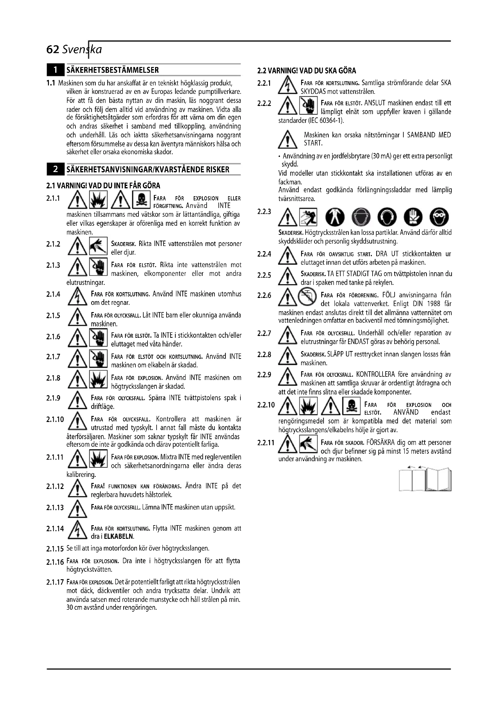 fara för kortslutning. Flytta INTE maskinen genom att dra i ELKABELN. Se till att inga motorfordon kör över högtrycksslangen.
