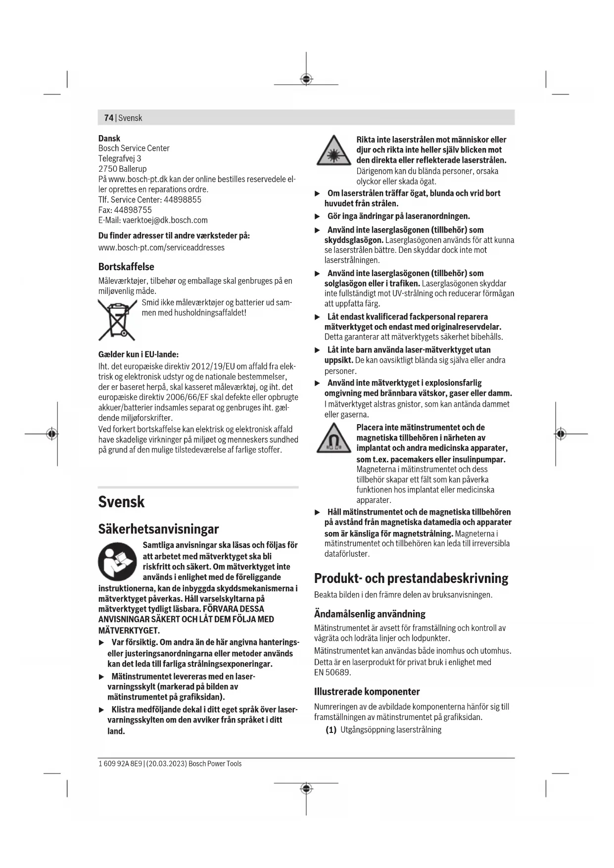 180° – Vrid mätverktyget i 180°. Positionera det så att mitten av den undre laserpunkten ligger på den redan markerade punktenII. Låt mätverktyget nivellera. Markera mitten på den övre laserpunkten (punktIII). – Differensen d mellan de båda markerade punkterna Ⅰ och Ⅲ utgör den faktiska avvikelsen från lodrät nivå. Den maximala tillåtna avvikelsen beräknar du på följande sätt: dubbelt avstånd mellan golv och tak×0,7mm/m. Exempel: Vid ett avstånd mellan golv och tak på 5m får den maximala avvikelsen uppgå till 2×5m×±0,7mm/m=±7mm. Punkterna Ⅰ och Ⅲ får därmed vara max 7 mm från varandra. Arbetsanvisningar u Använd alltid endast mitten av laserpunkten resp. laserlinjen för markering. Storleken på laserpunkten resp. bredden på laserlinjen ändras med avståndet. 1 609 92A 8E9 | (20.03.2023) Bosch Power ToolsNorsk | 81 Arbeta med stativet (tillbehör) Ett stativ ger ett stabilt, höjdjusterbart mätunderlag. Sätt mätverktyget med 1/4"-stativhållaren (10) på stativets gänga (23) eller på ett vanligt kamerastativ. För fäste på ett vanligt kamerasystiv använder du 5/8"-fästet (11). Skruva fast mätinstrumentet med fästskruven. Rikta in stativet grovt innan du startar mätinstrumentet. Fäste med universalhållaren (tillbehör) (se bild G) Med hjälp av den universella hållaren(19) kan du fästa mätinstrumentet t.ex. på lodräta ytor eller magnetiska material. Universalhållaren är också lämplig som golvstativ och underlättar höjdinriktning för mätverktyget. u Håll fingrarna borta från baksidan av det magnetiska tillbehöret när du fäster tillbehöret på ytor. Genom magneternas starka dragkraft kan dina fingrar fastna. Rikta in universalhållaren (19) grovt innan du startar mätinstrumentet. Arbeta med laser-måltavla (se bild G) Laser-måltavlan (20) förbättrar synligheten hos laserstrålen vid ogynnsamma villkor och stora avstånd. Den reflekterande ytan på lasermåltavlan(20) förbättrar laserlinjens synlighet, tack vare den transparenta ytan är laserlinjen synlig även från baksidan av lasermåltavlan. Laser-glasögon (tillbehör) Laser-glasögonen filtrerar omgivningsljuset. Därigenom verkar laserljuset ljusare för ögat. u Använd inte laserglasögonen (tillbehör) som skyddsglasögon. Laserglasögonen används för att kunna se laserstrålen bättre. Den skyddar dock inte mot laserstrålningen. u Använd inte laserglasögonen (tillbehör) som solglasögon eller i trafiken. Laserglasögonen skyddar inte fullständigt mot UV‑strålning och reducerar förmågan att uppfatta färg. Arbetsexempel (se bild B2–F2, G och H) Exempel på användningsmöjligheter för mätinstrumentet finns på grafiksidorna. Underhåll och service Underhåll och rengöring Håll alltid mätinstrumentet rent. Sänk inte ner mätinstrumentet i vatten eller andra vätskor. Torka av smuts med en fuktig, mjuk trasa. Använd inga rengörings- eller lösningsmedel. Rengör särskilt ytorna vid laserns utgångsöppning regelbundet och ta bort eventuellt damm. Kundtjänst och applikationsrådgivning Kundservicen ger svar på frågor beträffande reparation och underhåll av produkter och reservdelar. Explosionsritningar och informationer om reservdelar hittar du också under: www.bosch-pt.com Boschs applikationsrådgivnings-team hjälper dig gärna med frågor om våra produkter och tillbehören till dem. Ange alltid vid förfrågningar och reservdelsbeställningar det 10‑siffriga produktnumret som finns på produktens typskylt. Svenska Bosch Service Center Telegrafvej 3 2750 Ballerup Danmark Tel.: (08) 7501820 (inom Sverige) Fax: (011) 187691 Du hittar fler kontaktuppgifter till service här: www.bosch-pt.com/serviceaddresses Avfallshantering Mätverktyg, tillbehör och förpackning ska omhändertas på miljövänligt sätt för återvinning. Släng inte mätverktyg och batterier i hushållsavfallet! Endast för EU‑länder: Enligt det europeiska direktivet 2012/19/EU om avfall som utgörs av eller innehåller elektrisk och elektronisk utrustning och dess tillämpning i nationell rätt ska förbrukade mätinstrument, och enligt det europeiska direktivet 2006/66/EG felaktiga eller förbrukade batterier, samlas in separat och tillföras en miljöanpassad avfallshantering. Vid felaktig avfallshantering kan elektriska och elektroniska apparater orsaka skador på hälsa och miljö på grund av potentiellt farliga ämnen. Norsk Sikkerhetsanvisninger Alle anvisningene må leses og følges for at måleverktøyet skal kunne brukes uten fare og på en sikker måte. Hvis måleverktøyet ikke brukes i samsvar med de foreliggende anvisningene, kan de integrerte beskyttelsesinnretningene bli skadet. Varselskilt på måleverktøyet må alltid være synlige og lesbare. OPPBEVAR DISSE ANVISNINGENE PÅ ET TRYGT STED, OG LA DEM FØLGE MED HVIS MÅLEVERKTØYET SKAL BRUKES AV ANDRE. u Forsiktig! Ved bruk av andre betjenings- eller justeringsinnretninger enn de som er oppgitt her, eller andre prosedyrer, kan det oppstå farlig strålingseksponering. Bosch Power Tools 1 609 92A 8E9 | (20.03.2023)82 | Norsk u Måleverktøyet leveres med et laser-varselskilt (markert på bildet av måleverktøyet på illustrasjonssiden). u Hvis teksten på laser-advarselsskiltet ikke er på ditt språk, må du lime en etikett på ditt språk over dette skiltet før du tar produktet i bruk. Rett aldri laserstrålen mot personer eller dyr, og se ikke selv rett inn i den direkte eller reflekterte laserstrålen. Det kan føre til blending, uhell og øyeskader. u Ved øyekontakt med laserstrålen må øyet lukkes bevisst og hodet straks beveges bort fra strålen. u Det må ikke gjøres endringer på laserutstyret.u Bruk ikke lasersiktebrillene (tilbehør) som beskyttelsesbriller. Laserbrillene gjør det lettere å se laserstrålen, men de beskytter ikke mot laserstråling. u Bruk ikke lasersiktebrillene (tilbehør) som solbriller eller i veitrafikk. Laserbrillene gir ingen fullsten
