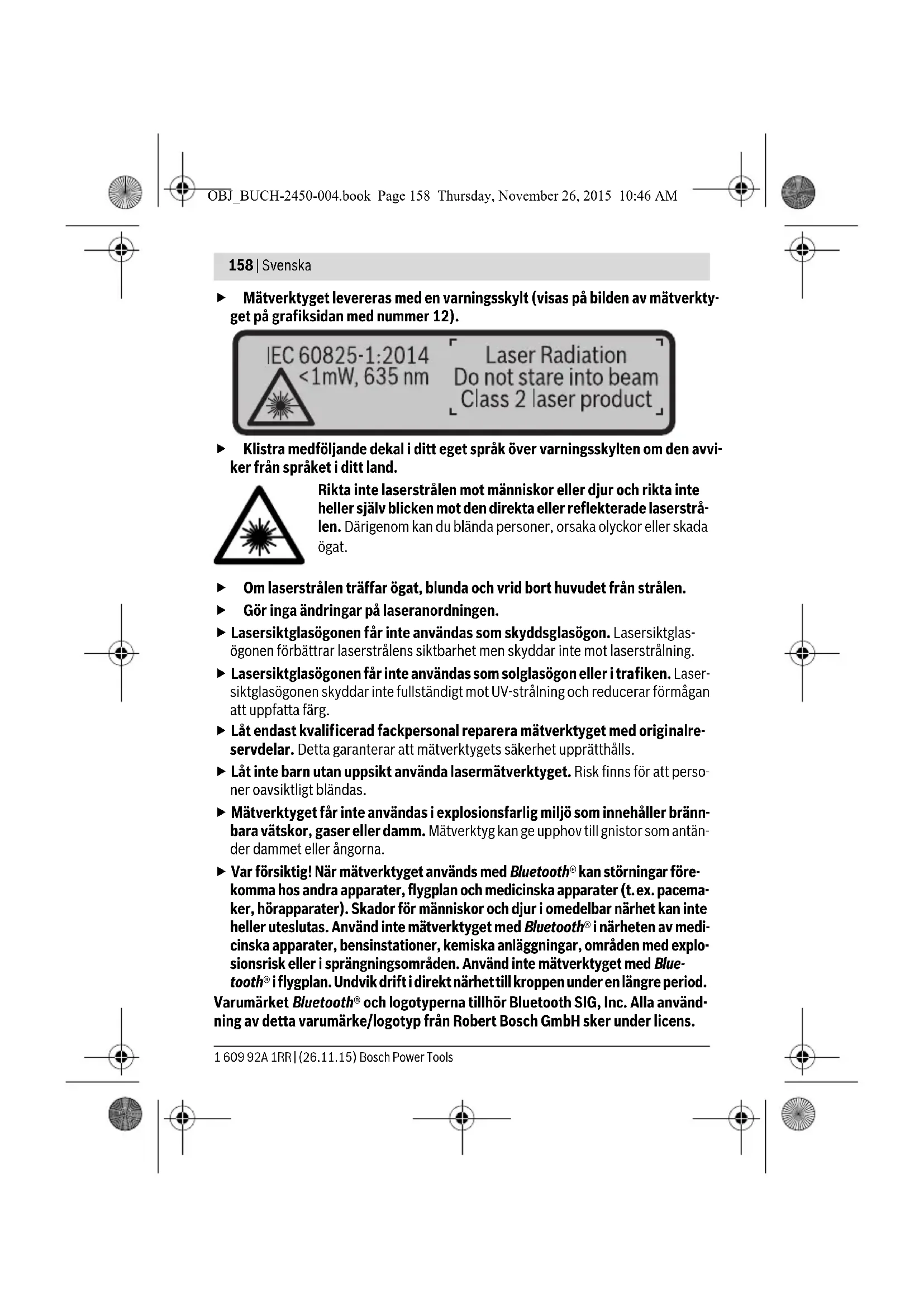 Serienumret 11 på typskylten identifierar mätverktyget entydigt. Digital laseravståndsmätare GLM 50 C OBJ_BUCH-2450-004.book Page 160 Thursday, November 26, 2015 10:46 AMSvenska | 161 Bosch Power Tools 1 609 92A 1RR | (26.11.15) Försäkran om överensstämmelse Vi intygar under ensamt ansvar att den produkt som beskrivs under ”Tekniska data” uppfyller alla gällande bestämmelser i direktiven 1999/5/EG och 2011/65/EU inklu- sive ändringar och stämmer överens med följande standarder: EN 61010-1: 2010-10, EN 60825-1: 2014-08, EN 300 328 V1.8.1: 2012-06, EN 301 489-1 V1.8.1: 2008-04, EN 301 489-1 V1.9.2: 2011-09, EN 301 489-17 V2.2.1: 2012-09, EN 62479: 2010-09, EN 50581: 2012. Teknisk dokumentation: Robert Bosch GmbH, PT/ETM9, 70764 Leinfelden-Echterdingen, GERMANY Robert Bosch GmbH, Power Tools Division 70764 Leinfelden-Echterdingen, GERMANY Leinfelden, 10.11.2015 Illustrerade komponenter Numreringen av komponenterna hänvisar till illustration av mätverktyget på grafik- sidan. 1 Display 2 Mätknapp[ ] 3 Plusknapp[+] 4 Knapp för val av referensplan 5 På-/Av-knapp[ ] 6 Bluetooth®-knappen 7 Funktionsknapp[Func] 8 Minusknapp[–] 9 Batterifackets lock 10 Spärr på batterifackets lock 11 Serienummer 12 Laservarningsskylt 13 1/4"-stativgängning 14 Mottagarlins Henk Becker Executive Vice President Engineering Helmut Heinzelmann Head of Product Certification PT/ETM9 OBJ_BUCH-2450-004.book Page 161 Thursday, November 26, 2015 10:46 AM162 | Svenska 1 609 92A 1RR | (26.11.15) Bosch Power Tools 15 Laserstrålens utgång 16 Skyddsfodral 17 Lasermåltavla* 18 Lasersiktglasögon* 19 Stativ*