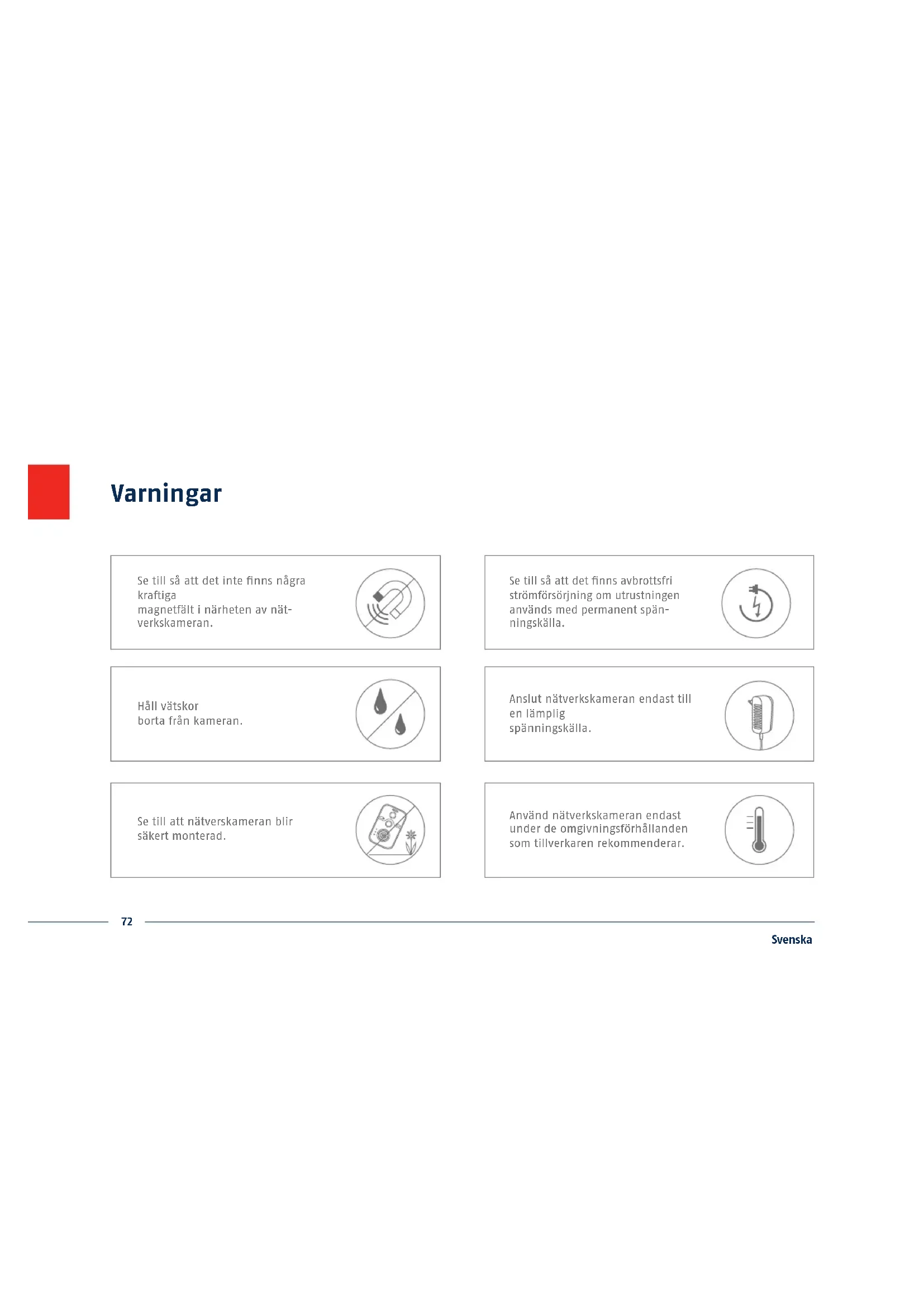 - CD Programvara EU, AU, UK Snabbguide72 Svenska Varningar Anslut nätverkskameran endast till en lämplig spänningskälla. Använd nätverkskameran endast under de omgivningsförhållanden som tillverkaren rekommenderar. Se till så att det nns avbrottsfri strömförsörjning om utrustningen används med permanent spän- ningskälla. Se till så att det inte nns några kraiga magnetfält i närheten av nät- verkskameran. Håll vätskor borta från kameran. Se till att nätverskameran blir säkert monterad.73 Svenska Objektiv microSD-uttag Mikrofon Ljussensor för dag-/ nattomställning Statuslysdioder IR LED PIR - passiv infraröd sensor Översikt74 Svenska Larmingång och -ut- gång Vänster: ingång Mitten: jord Höger: utgång 12 V DC strömanslutning WPS-/återställningsknapp LAN (PoE-kompatibel)75 Svenska Nätverksanslutning Direktanslutning av nätverkskameran till en dator/laptop