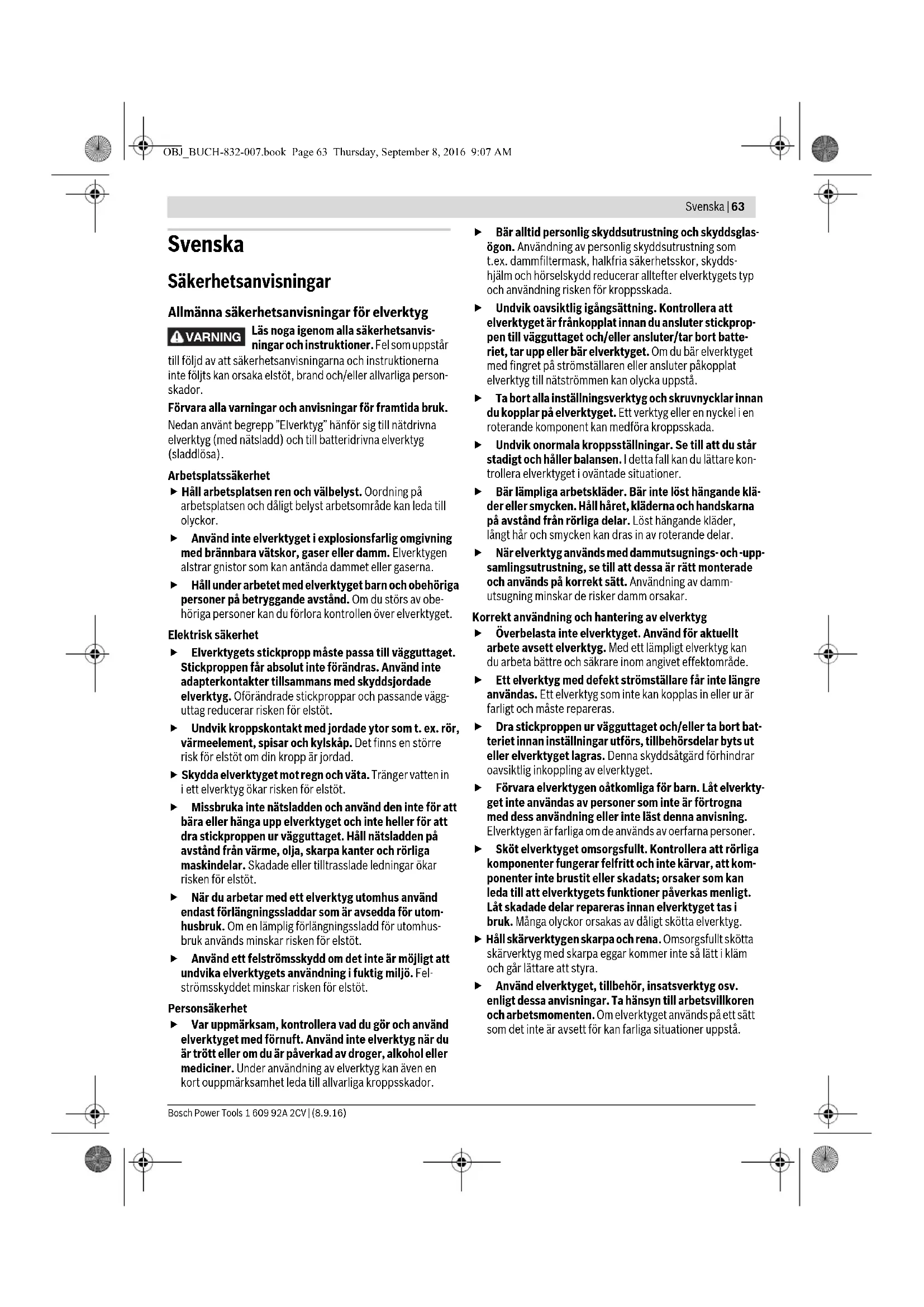 OBJ_BUCH-832-007.book Page 61 Thursday, September 8, 2016 9:07 AM62 | Dansk 1 609 92A 2CV | (8.9.16) Bosch Power Tools Opbevar kun akkuen i et temperaturområde mellem –20 °C og 50 °C. Opbevar ikke akkuen i bilen f.eks. om sommeren. Rengør akkuens ventilationsåbninger en gang imellem med en blød, ren og tør pensel. Når driftstiden pr. opladning forkortes væsentligt, er det tegn på, at akkuerne er slidt op og skal udskiftes. Læs og overhold henvisningerne mhr. bortskaffelse. Vedligeholdelse og service Vedligeholdelse og rengøring Tag akkuen ud af el-værktøjet, før der arbejdes på el-værktøjet (f.eks. vedligeholdelse, værktøjsskift osv.) samt før det transporteres og lægges til opbeva- ring. Utilsigtet aktivering af start-stop-kontakten er for- bundet med kvæstelsesfare. El-værktøj og el-værktøjets ventilationsåbninger skal altid holdes rene for at sikre et godt og sikkert arbejde. Skift kul (se Fig. E) Kontrollér kullenes længde ca. hver 2–3 måned, og skift beg- ge kullene efter behov. Skift aldrig kun en af kullene! Bemærk: Anvend kun kul, der er beregnet til dit produkt og som sælges af Bosch. –Løsne kapperne 16 med en egnet skruetrækker. – Skift de kul, der står under fjedertryk 15, og skru kapperne på igen. Kundeservice og brugerrådgivning Kundeservice besvarer dine spørgsmål vedr. reparation og vedligeholdelse af dit produkt samt reservedele. Eksplosions- tegninger og informationer om reservedele findes også under: www.bosch-pt.com Bosch brugerrådgivningsteamet vil gerne hjælpe dig med at besvare spørgsmål vedr. vores produkter og deres tilbehør. El-værktøjets 10-cifrede typenummer (se typeskilt) skal altid angives ved forespørgsler og bestilling af reservedele. Dansk Bosch Service Center Telegrafvej 3 2750 Ballerup På www.bosch-pt.dk kan der online bestilles reservedele eller oprettes en reparations ordre. Tlf. Service Center: 44898855 Fax: 44898755 E-Mail: vaerktoej@dk.bosch.com Transport De indeholdte Li-Ion-akkuer overholder bestemmelserne om farligt gods. Akkuerne kan transporteres af brugeren på of- fentlig vej uden yderligere pålæg. Ved forsendelse gennem tredjemand (f.eks.: lufttransport el- ler spedition) skal særlige krav vedr. emballage og mærkning overholdes. Her skal man kontakte en faregodsekspert, før forsendelsesstykket forberedes. Send kun akkuer, hvis huset er ubeskadiget. Tilklæb åbne kontakter og indpak akkuen på en sådan måde, at den ikke kan bevæge sig i emballagen. Følg venligst også eventuelle, videreførende, nationale for- skrifter. Bortskaffelse El-værktøj, akku, tilbehør og emballage skal genbru- ges på en miljøvenlig måde. Smid ikke el-værktøj og akkuer/batterier ud sammen med det almindelige husholdningsaffald! Gælder kun i EU-lande: Iht. det europæiske direktiv 2012/19/EU skal kasseret elektroværktøj og iht. det europæiske direktiv 2006/66/EF skal de- fekte eller opbrugte akkuer/batterier ind- samles separat og genbruges iht. gældende miljøforskrifter. Akkuer/batterier: Li-Ion: Læs og overhold henvisningerne i af- snit „Transport“, side 62. Ret til ændringer forbeholdes. OBJ_BUCH-832-007.book Page 62 Thursday, September 8, 2016 9:07 AMSvenska | 63 Bosch Power Tools 1 609 92A 2CV | (8.9.16) Svenska Säkerhetsanvisningar Allmänna säkerhetsanvisningar för elverktyg Läs noga igenom alla säkerhetsanvis- ningar och instruktioner. Fel som uppstår till följd av att säkerhetsanvisningarna och instruktionerna inte följts kan orsaka elstöt, brand och/eller allvarliga person- skador. Förvara alla varningar och anvisningar för framtida bruk. Nedan använt begrepp ”Elverktyg” hänför sig till nätdrivna elverktyg (med nätsladd) och till batteridrivna elverktyg (sladdlösa). Arbetsplatssäkerhet Håll arbetsplatsen ren och välbelyst. Oordning på arbetsplatsen och dåligt belyst arbetsområde kan leda till olyckor. Använd inte elverktyget i explosionsfarlig omgivning med brännbara vätskor, gaser eller damm. Elverktygen alstrar gnistor som kan antända dammet eller gaserna. Håll under arbetet med elverktyget barn och obehöriga personer på betryggande avstånd. Om du störs av obe- höriga personer kan du förlora kontrollen över elverktyget. Elektrisk säkerhet Elverktygets stickpropp måste passa till vägguttaget. Stickproppen får absolut inte förändras. Använd inte adapterkontakter tillsammans med skyddsjordade elverktyg. Oförändrade stickproppar och passande vägg- uttag reducerar risken för elstöt. Undvik kroppskontakt med jordade ytor som t. ex. rör, värmeelement, spisar och kylskåp. Det finns en större risk för elstöt om din kropp är jordad. Skydda elverktyget mot regn och väta. Tränger vatten in i ett elverktyg ökar risken för elstöt. Missbruka inte nätsladden och använd den inte för att bära eller hänga upp elverktyget och inte heller för att dra stickproppen ur vägguttaget. Håll nätsladden på avstånd från värme, olja, skarpa kanter och rörliga maskindelar. Skadade eller tilltrasslade ledningar ökar risken för elstöt. När du arbetar med ett elverktyg utomhus använd endast förlängningssladdar som är avsedda för utom- husbruk. Om en lämplig förlängningssladd för utomhus- bruk används minskar risken för elstöt. Använd ett felströmsskydd om det inte är möjligt att undvika elverktygets användning i fuktig miljö. Fel- strömsskyddet minskar risken för elstöt. Personsäkerhet Var uppmärksam, kontrollera vad du gör och använd elverktyget med förnuft. Använd inte elverktyg när du är trött eller om du är påverkad av droger, alkohol eller mediciner. Under användning av elverktyg kan även en kort ouppmärksamhet leda till allvarliga kroppsskador. Bär alltid personlig skyddsutrustning och skyddsglas- ögon. Användning av personlig skyddsutrustning som t.ex. dammfiltermask, halkfria säkerhetsskor, skydds- hjälm och hörselskydd reducerar alltefter elverktygets typ och användning riske
