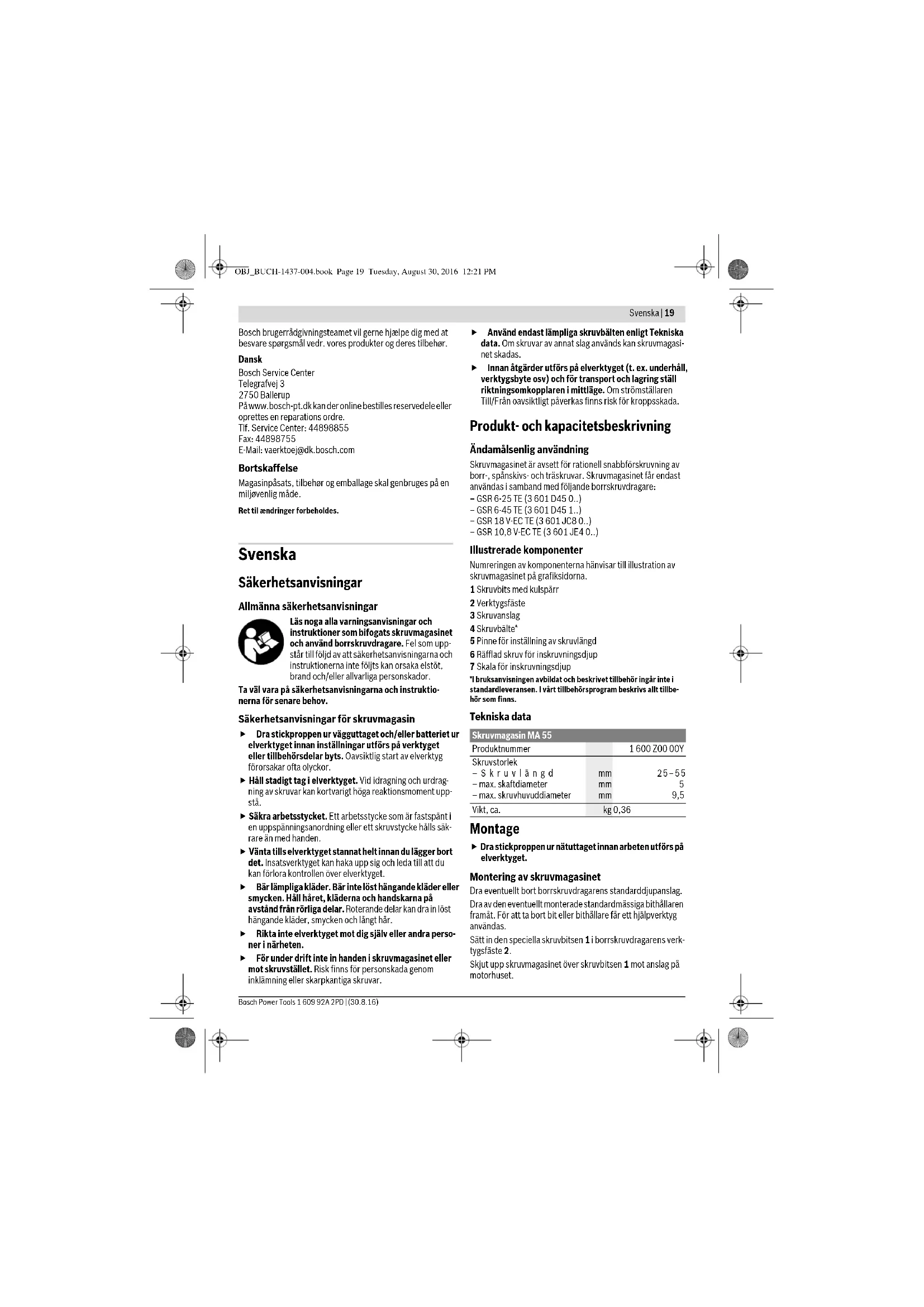 9,5 Vægt, ca. kg 0,36 OBJ_BUCH-1437-004.book Page 18 Tuesday, August 30, 2016 12:21 PMSvenska | 19 Bosch Power Tools 1 609 92A 2PD | (30.8.16) Bosch brugerrådgivningsteamet vil gerne hjælpe dig med at besvare spørgsmål vedr. vores produkter og deres tilbehør. Dansk Bosch Service Center Telegrafvej 3 2750 Ballerup På www.bosch-pt.dk kan der online bestilles reservedele eller oprettes en reparations ordre. Tlf. Service Center: 44898855 Fax: 44898755 E-Mail: vaerktoej@dk.bosch.com Bortskaffelse Magasinpåsats, tilbehør og emballage skal genbruges på en miljøvenlig måde. Ret til ændringer forbeholdes. Svenska Säkerhetsanvisningar Allmänna säkerhetsanvisningar Läs noga alla varningsanvisningar och instruktioner som bifogats skruvmagasinet och använd borrskruvdragare. Fel som upp- står till följd av att säkerhetsanvisningarna och instruktionerna inte följts kan orsaka elstöt, brand och/eller allvarliga personskador. Ta väl vara på säkerhetsanvisningarna och instruktio- nerna för senare behov. Säkerhetsanvisningar för skruvmagasin Dra stickproppen ur vägguttaget och/eller batteriet ur elverktyget innan inställningar utförs på verktyget eller tillbehörsdelar byts. Oavsiktlig start av elverktyg förorsakar ofta olyckor. Håll stadigt tag i elverktyget. Vid idragning och urdrag- ning av skruvar kan kortvarigt höga reaktionsmoment upp- stå. Säkra arbetsstycket. Ett arbetsstycke som är fastspänt i en uppspänningsanordning eller ett skruvstycke hålls säk- rare än med handen. Vänta tills elverktyget stannat helt innan du lägger bort det. Insatsverktyget kan haka upp sig och leda till att du kan förlora kontrollen över elverktyget. Bär lämpliga kläder. Bär inte löst hängande kläder eller smycken. Håll håret, kläderna och handskarna på avstånd från rörliga delar. Roterande delar kan dra in löst hängande kläder, smycken och långt hår. Rikta inte elverktyget mot dig själv eller andra perso- ner i närheten. För under drift inte in handen i skruvmagasinet eller mot skruvstället. Risk finns för personskada genom inklämning eller skarpkantiga skruvar. Använd endast lämpliga skruvbälten enligt Tekniska data. Om skruvar av annat slag används kan skruvmagasi- net skadas. Innan åtgärder utförs på elverktyget (t. ex. underhåll, verktygsbyte osv) och för transport och lagring ställ riktningsomkopplaren i mittläge. Om strömställaren Till/Från oavsiktligt påverkas finns risk för kroppsskada. Produkt- och kapacitetsbeskrivning Ändamålsenlig användning Skruvmagasinet är avsett för rationell snabbförskruvning av borr-, spånskivs- och träskruvar. Skruvmagasinet får endast användas i samband med följande borrskruvdragare: – GSR 6-25 TE (3 601 D45 0..) – GSR 6-45 TE (3 601 D45 1..) – GSR 18 V-EC TE (3 601 JC8 0..) – GSR 10,8 V-EC TE (3 601 JE4 0..) Illustrerade komponenter Numreringen av komponenterna hänvisar till illustration av skruvmagasinet på grafiksidorna. 1 Skruvbits med kulspärr 2 Verktygsfäste 3 Skruvanslag 4 Skruvbälte* 5 Pinne för inställning av skruvlängd 6 Räfflad skruv för inskruvningsdjup 7 Skala för inskruvningsdjup *I bruksanvisningen avbildat och beskrivet tillbehör ingår inte i standardleveransen. I vårt tillbehörsprogram beskrivs allt tillbe-hör som finns. Tekniska data Montage Dra stickproppen ur nätuttaget innan arbeten utförs på elverktyget. Montering av skruvmagasinet Dra eventuellt bort borrskruvdragarens standarddjupanslag. Dra av den eventuellt monterade standardmässiga bithållaren framåt. För att ta bort bit eller bithållare får ett hjälpverktyg användas. Sätt in den speciella skruvbitsen 1 i borrskruvdragarens verk- tygsfäste 2. Skjut upp skruvmagasinet över skruvbitsen 1 mot anslag på motorhuset. Skruvmagasin MA 55 Produktnummer 1 600 Z00 00Y Skruvstorlek –Skruvlängd – max. skaftdiameter – max. skruvhuvuddiameter