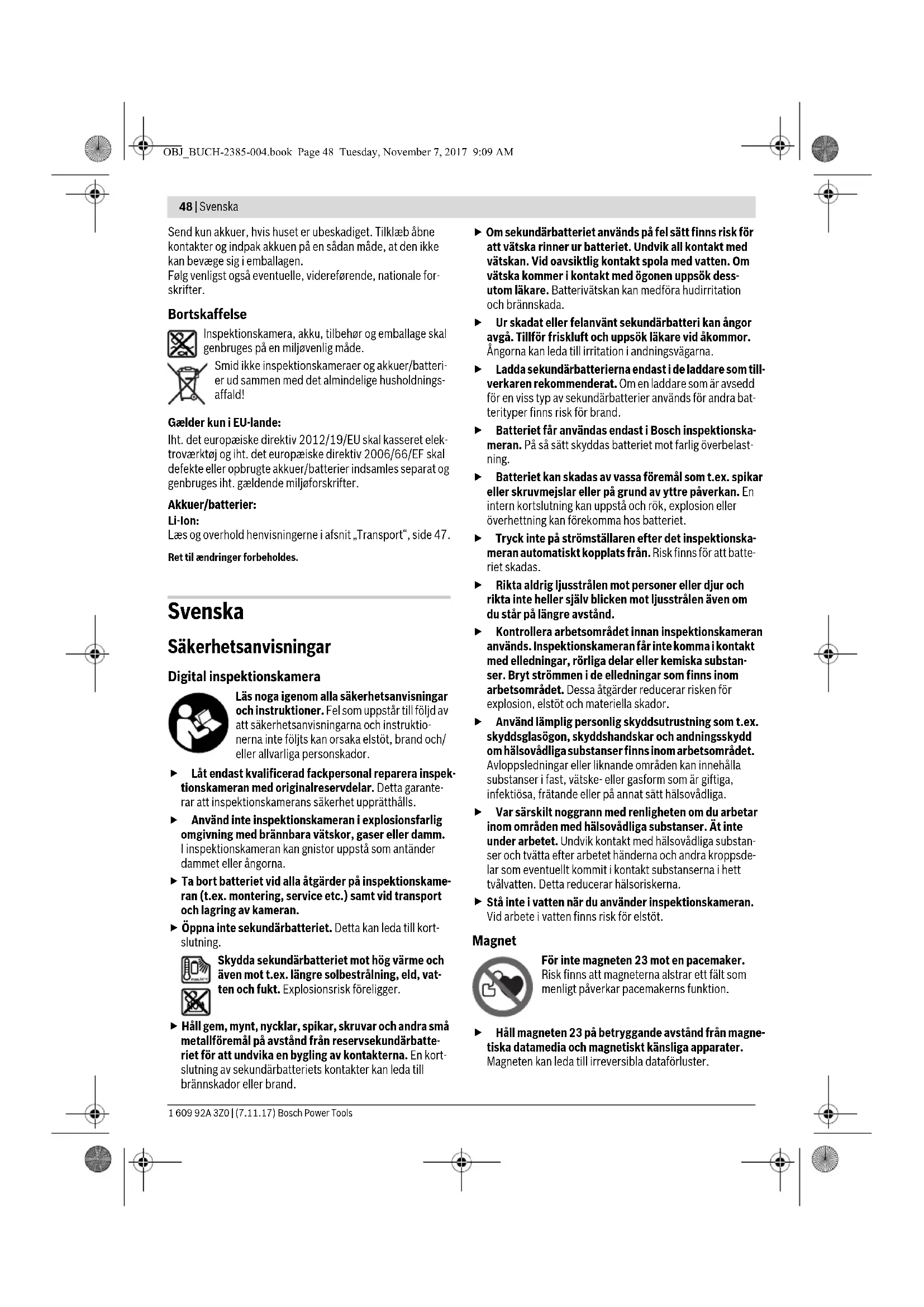 OBJ_BUCH-2385-004.book Page 50 Tuesday, November 7, 2017 9:09 AMSvenska | 51 Bosch Power Tools 1 609 92A 3Z0 | (7.11.17) Laddningsbart batteri/engångsbatteri laddningsstatus När batterierna är lågt laddade visas först symbolen på displayen. När symbolen är tom skall batteriet bytas ut eller det uppladdningsbara batteriet laddas upp, Några inspektio- ner är då inte längre möjliga. Montera kamerakabeln (se bild D) För att kunna använda inspektionskameran måste kameraka- beln 13 vara ansluten till handenheten 1. Stick in kamerakabelns 13 stickkontakt positionsriktigt på kamera-anslutningen 21 tills den hakar fast. Demontera kamerakabeln (se bild E) För att ta av kamerakabeln 13 trycker du ihop arreteringen 22 och drar ut stickkontakten ur handenheten 1. Montera spegel, magnet eller krok (se bild F) Spegeln 25, magneten 23 och kroken 24 kan som hjälpmedel monteras på kamerahuvudet 14. Skjut upp ett don enligt bild mot anslag på kamerahuvudets 14 urtag. Anvisning: Magneten 23 och kroken 24 kan endast användas för förflyttning och borttagning av löst sittande, små och lätta föremål. Vid för kraftigt drag kan inspektionskameran eller hjälpmedlet skadas. Drift Skydda handenheten 1 och det uppladdningsbara batteriet 17 mot väta och direkt solstrålning. Kamera- kabeln och kamerahuvudet är vattentäta vid korrekt montering. Handenheten och batteriet är dock inte vatten- skyddade. Vid kontakt med vatten finns risk för en elek- trisk stöt eller skador. Se till att inspektionskameran inte utsätts för extrema temperaturer eller temperaturväxlingar. Låt inte kame- ran ligga under en längre tid t.ex. i en bil. Låt temperaturen utjämnas innan du använder inspektionskameran om den har utsatts för stora temperaturväxlingar. Använd inte inspektionskameran om imma bildats på kamerahuvudets 14 lins. Koppla på inspektionskame- ran först sedan fukten avdunstat. Inspektionskameran kan i annat fall skadas. Den tända lampan 15 kan bli het under driften. Rör inte lampan för att undvika brännskador. Driftstart Sätt in Micro SD-kortet Öppna den övre övertäckningen 10 och skjut in Micro SD-kor- tet 20 ända till anslaget i öppningen 11. Stäng den övre över- täckningen igen. In- och urkoppling För att starta inspektionskameran, tryck på-/avknappen 3. På displayen 9 visas startbildskärmen under en kort stund. För frånkoppling av inspektionskameran tryck åter På-Av- knappen 3. Om ingen knapp trycks på inspektionskameran stänger den automatiskt av sig efter att den inställda tiden har gått ut (k). Reglering av lampan i kamerahuvudet För att göra kamerabilden ljusare kan lampan 15 kamerahu- vudet tändas och ljusstyrkan regleras. Ljusstyrka kan ställas in i 4 steg (0 %, 25 %, 50 %, 100 %). För att tända kameralampan 15 och för att förstärka ljusstyr- kan trycker du på knappen 7 så ofta tills den önskade ljusstyr- kan har uppnåtts. Rikta inte ögonen direkt mot lampan 15 och rikta inte heller lampan mot andra personer. Lampljuset kan blända ögonen. För att minska ljusstyrkan och för att släcka kameralampan 15 trycker du på knappen 7 så ofta tills den önskade ljusstyrka uppnåtts resp. lampan släckts. Förstora bilden på displayen (Zoom) Genom att kort trycka på knappen 2 kan du förstora bilden på displayen med 1,5 ggr eller fördubbla den. Rotera bilden på displayen (Up is Up™) (se bild G) Med knappen 5 vrider du bilden så att ”uppe” även visas uppe på displayen. Anvisning: Begränsad funktion vid monterad spegel 25 och/ eller vertikal injustering av kamerakabeln 13. Skapa foton/videor Med knappen 8 kopplar du om mellan foto- och videoläge. Det aktuellt inställda inspelningsläget a visas i statuslisten b. Med knappen 6 tar du en bild i respektive läge och startar och avslutar en videoinspelning. Galleriläge/inställningsläge Genom att trycka på knappen 4 tilldelas knapparna 8 , 7, 5 och 4 en annan funktion (i enlighet med visningen på dis- playen ovanför) (2:a nivån). Använd dessa knappar i enlighet med visningen på displayen. Genom att kort trycka på knappen 4 öppnas galleriläget. Genom att trycka på knappen 4 kan du se bilden i full bild- skärmsstorlek och genom att trycka på knappen 6 spela upp en video. Genom att trycka länge på knappen 4 öppnas Inställnings- läget. Följande inställningar är möjliga: – Färgåtergivning (röd punkt)/svartvit återgivning (grön punkt) (h) – Displayens ljusstyrka (i) –Datum/tid (j) – Auto Off-funktion: inaktivitetens varaktighet hos inspek- tionskameran, efter vilken den stänger av sig (k) – Displayens belysningstid (l) – Minnesbeläggning/formatering av Micro SD-kort (m). Statuslist Statuslisten b visas under cirka 2 sekunder på displayen efter varje knapptryckning. Den visar: – det inställda inspelningsläget (a) –datum och tid – den inställda förstoringen (c) – den inställda ljusstyrkan (d) – det uppladdningsbara batteriets/engångsbatteriernas laddningsstatus (e). OBJ_BUCH-2385-004.book Page 51 Tuesday, November 7, 2017 9:09 AM52 | Svenska 1 609 92A 3Z0 | (7.11.17) Bosch Power Tools Överföring av bilder och videor Överföring av bilder och videor kan bara göras med isatt Micro SD-kort 20. Inspektionskameran kan anslutas till den dator med Micro USB-kabel 19 för att överföra bilder och videor. Inspektionskameran visar med en symbol på displayen att den är ansluten till den dator. På datorn visas inspektionskameran som extern enhet. Inspektionskamerans uppladdningsbara batteri kan inte lad- das via anslutningen 12. Ansluta Micro USB-kabeln för dataöverföring Öppna den övre kåpan 10 och stick in Micro USB-kabeln 19 positionsriktigt i anslutningen 12. Efter överför av data tar du bort Micro USB-kabeln och stänger den övre kåpan igen. Arbetsanvisningar Kontrollera omgivningen som ska inspekteras och beakta spe- ciella hinder och riskområden. Böj kamerakabeln 13 så att kamerahuvudet kan föras in i den 