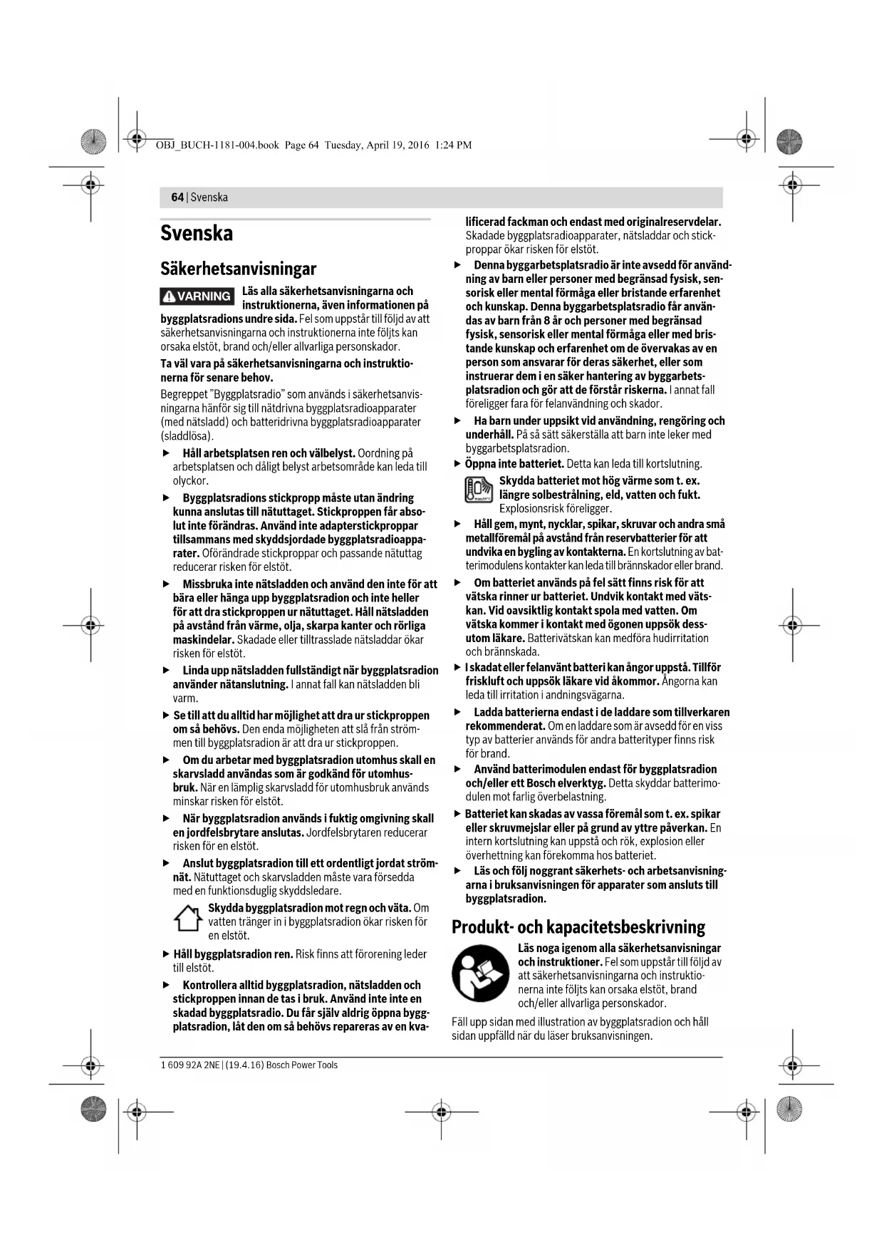 - Begränsad effekt vid temperaturer <0 °C ** (vid ljudkälla SD-/MMC-kort eller USB) Tekniska data baserade på medlevererad batterimodul. OBJ_BUCH-1181-004.book Page 65 Tuesday, April 19, 2016 1:24 PM66 | Svenska 1 609 92A 2NE | (19.4.16) Bosch Power Tools Montage Elförsörjning till byggplatsradio Byggplatsradion kan försörjas med elström via nätanslutning eller via ett i batterischaktet 11 insatt litiumjonbatteri. När batterimodulen används för elförsörjning finns endast funk- tionerna ljud och elförsörjning av externa apparater via inte- grerad USB-anslutning att tillgå. Kontrollera nätspänningen! Strömkällans spänning vid nätanslutning måste överensstämma med data på bygg- platsradions dataskylt. Byggplatsradioapparater märkta med 230 V kan även användas med 220 V. Insättning och uttagning av batterimodulen (se bild A) Anvisning: Om batterier används som inte är lämpliga för byggplatsradion finns risk för att byggplatsradion störs eller skadas. Öppna låsspärren 12 på batterifacket (”Battery Bay”) och fäll upp batterifackets lock 13. Placera ett batteri i batterischaktet 11 på sätt att batteriets anslutningar ligger mot anslutningarna i batterischaktet 11 och se till att batteriet snäpper fast i batterischaktet. Så fort ett batteri har satts in, visas l på displayen. Indike- ringen blinkar om batteriet är svagt. Är batterimodulen för varm eller för kall tänds temperaturvar- ningen k på displayen. Vänta tills batterimodulen uppnått till- låtet temperaturområde innan du tar byggplatsradion i bruk. För borttagning av batterimodulen 14 tryck på batterimodu- lens upplåsningsknapp och dra batterimodulen ur batte- rischaktet 11. Slå igen batterifackets lock 13 när en batterimodul satts in eller tagits bort. Lås batterifackets lock genom att haka fast låsspärren 12 i huset och sedan trycka ned den. Batteriets laddning Använd endast de laddare, som anges i de tekniska data. Endast dessa laddare är anpassade till de uppladd- ningsbara litiumjon-batterier, som finns i byggarbetsplats- radion. Anvisning: Batteriet levereras ofullständigt uppladdat. För full effekt ska batteriet före första användningen laddas upp i laddaren. Litiumjonbatteriet kan när som helst laddas upp eftersom detta inte påverkar livslängden. Batteriet skadas inte om laddning avbryts. Insättning och byte av buffertbatterier (se bild A) För att kunna spara tiden på byggplatsradion måste buffert- batterier användas. Vi rekommenderar att använda alkali- mangan-batterier. Öppna låsspärren 12 på batterifacket (”Battery Bay”) och fäll upp batterifackets lock 13. Ta vid behov bort batterimodulen 14. För att öppna batterifackets lock 7 tryck spärren 6 och ta bort batterifackets lock. Sätt in buffertbatterierna. Kontrollera korrekt polning enligt märkning på batterifackets insida. Sätt åter på buffertbatterifackets lock 7. ”REPLACE AA BATTERY WHEN UNIT NO LONGER KEEPS CORRECT TIME”: Byt ut buffertbatterierna när tiden inte längre visas på byggplatsradion. Alla batterier ska bytas samtidigt. Använd endast batterier av samma fabrikat och med samma kapacitet. Ta bort buffertbatterierna ur byggplatsradion om radion inte används under en längre period. Risk finns att buffertbatterierna vid långtidslagring korroderar och självurladdas. Drift Skydda byggplatsradion mot väta och direkt solsken. Ljud (se bild B och C) In-/urkoppling av ljud För Inkoppling av ljud (radio och externa avspelningsappara- ter) tryck På-/Av-knappen 26. Displayen 27 aktiveras och den ljudkälla återges som vid senaste urkoppling av bygg- platsradion varit inställd. Om byggplatsradion står i energisparläge (se ”Energispar- funktion”, sidan 69), tryck för inkoppling av ljud två gånger på På-/Av-knappen 26. För Frånkoppling av ljud tryck igen på På-/Av-knappen 26. Ljudkällans aktuella inställning sparas. Spara energi genom att koppla på byggplatsradion endast när den används. Inställning av volym För att öka volymen vrid ratten ”Volume” 25 medurs, för att minska volymen vrid ratten moturs. Volyminställningen (värde mellan 0 och 20) visas för några sekunder på displayen d. Före en sändare ställs in eller byts bör volymen ställas in på ett lågt värde, före start av en extern ljudkälla på ett medelhögt värde. Klanginställning För optimal tonåtergivning har en equalizer installerats i bygg- platsradion. Du kan manuellt ändra diskant- och basnivån eller också använda klanginställningar för olika musikdelar. Du kan välja mellan förprogrammerade inställningar ”JAZZ”, ”ROCK”, ”POP” och ”CLASSICAL” samt av dig själv programmerad inställning ”CUSTOM”. För val av en sparad Klangförinställning tryck på knappen för val av klangförinställning ”Equalizer” 15 tills önskad inställning visas på displayen a. Ändring av inställning ”CUSTOM”: – Tryck en gång på knappen för manuell klanginställning ”Custom” 17. På displayen blinkar indikeringen ”BAS” c och indikeringen d för basnivåns sparade värde. – Ställ in önskad basnivå (värde mellan 0 och 10). För höj- ning av basnivån, vrid ratten ”Bass/Treb” 25 medurs, för sänkning vrid ratten moturs. – Spara inställd basnivå genom att en gång till trycka på knappen för manuell klanginställning ”Custom” 17. På displayen blinkar indikeringen ”TRE” b för diskantnivåns fortlöpande inställning samt indikeringen d för diskantni- våns sparade värde. OBJ_BUCH-1181-004.book Page 66 Tuesday, April 19, 2016 1:24 PMSvenska | 67 Bosch Power Tools 1 609 92A 2NE | (19.4.16) – Ställ in önskad diskantnivå (värde mellan 0 och 10). För höjning av diskantnivån vrid ratten ”Bass/Treb” 25 med- urs, för sänkning vrid ratten moturs. – Spara inställd diskantnivå genom att tredje gången trycka på knappen för manuell klanginställning ”Custom” 17. Val av ljudkälla För val en lj