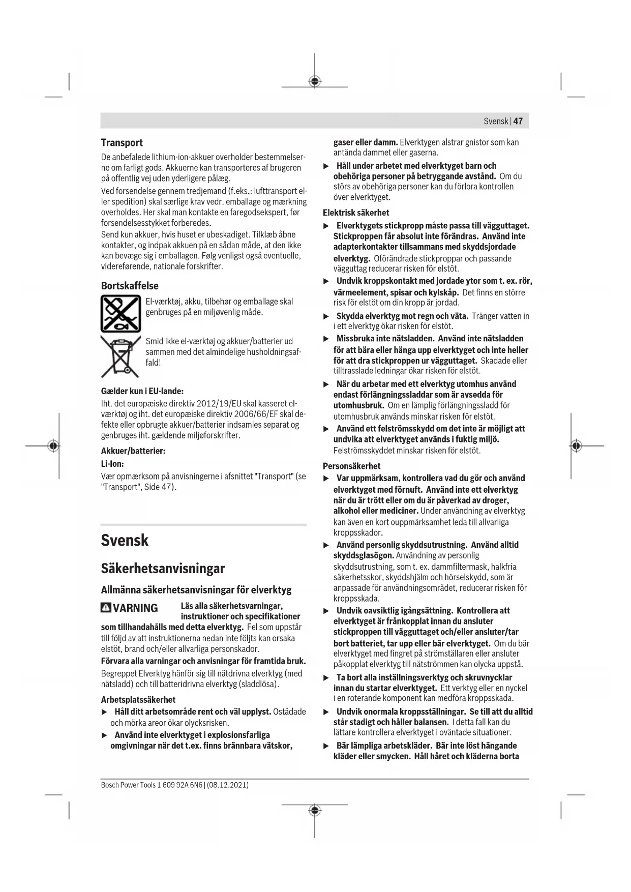 max , der skal bearbejdes. Knivafstanden a bør være 10% af den maksimale pladetyk- kelse (f. eks. 0,1mm knivafstand ved 1mm metalpladetyk- kelse). Til bløde eller seje materialer skal knivafstandena forringes, til hårde eller sprøde materialer skal den øges. Løsn monteringsskruen(10) på underkniven. Indstil med stilleskruen(9) den nødvendige knivafstand a. Overkniv(7) og underkniv(8) må ikke berøre hinanden. Kontrollér afstanden med en gængs indstillingslære. Spænd monteringsskruen(10) på underkniven igen med et tilspæn- dingsmoment på 3–4Nm. Temperaturafhængig overbelastningsbeskyttelse Ved korrekt brug kan el-værktøjet ikke blive overbelastet. Hvis belastningen bliver for stor, eller det tilladte temperatu- rområde overskrides, reduceres slagtallet, eller el-værktøjet slukker. Når slagtallet er reduceret kører el-værktøjet først, når den tilladte batteritemperatur atter er opnået med fuldt slagtal. Ved automatisk frakobling slukker du el-værktøjet, lader akkuen køle af og tænder el-værktøjet igen. Henvisninger til optimal håndtering af akkuen Beskyt akkuen mod fugtighed og vand. Opbevar kun akkuen i et temperaturområde fra −20°C til 50°C. Opbevar ikke akkuen i bilen f.eks. om sommeren. Rengør akkuens ventilationsåbninger en gang imellem med en blød, ren og tør pensel. Når driftstiden pr. opladning forkortes væsentligt, er det tegn på, at akkuerne er slidt op og skal udskiftes. Læs og overhold henvisningerne mht. bortskaffelse. Vedligeholdelse og service Vedligeholdelse og rengøring u Tag altid akkuen ud af el‑værktøjet, før der arbejdes på el‑værktøjet (f.eks. vedligeholdelse, værktøjsskift osv.) samt før det transporteres og lægges til opbeva- ring. Utilsigtet aktivering af start-stop-kontakten er for- bundet med kvæstelsesfare. u El‑værktøj og el‑værktøjets ventilationsåbninger skal altid holdes rene for at sikre et godt og sikkert ar- bejde. Udskiftning af kniv(se billedeA) Overkniv(7) og underkniv(8) er ens, har hver fire snitkanter og kan skiftes indbyrdes. Drej eller skift knivene rettidigt, da kun skarpt indsatsværk- tøj kan sikre et godt skæreresultat og skåne el-værktøjet. Når du skal udskifte overkniven(7), skal du løsne monteringsskruen(6). Når du skal udskifte underkniven(8), skal du løsne monteringsskruen(10). Drej kniven 90°, eller isæt en ny kniv. Når du isætter underkniven(8), skal du sørge for, at den ligger helt an mod stilleskruen (9). Bemærk: Drej kun kniven i den retning, der vises på billedetA, og anbring den nye kniv i den position, der vises på billedet. Det er ikke muligt at skære, hvis kniven vender forkert. Spænd monteringsskruen(6) til overkniven og monteringsskruen(10) til underkniven igen med et tilspæn- dingsmoment på 3–4Nm. Kontrollér knivafstanden a som beskrevet ovenfor. Overkniv(7) og underkniv(8) må ikke efterslibes. Kundeservice og anvendelsesrådgivning Kundeservice besvarer dine spørgsmål vedr. reparation og vedligeholdelse af dit produkt samt reservedele. Eksplo- sionstegninger og oplysninger om reservedele finder du også på: www.bosch-pt.com Bosch-anvendelsesrådgivningsteamet hjælper dig gerne, hvis du har spørgsmål til produkter og tilbehørsdele. Produktets 10‑cifrede typenummer (se typeskilt) skal altid angives ved forespørgsler og bestilling af reservedele. Dansk Bosch Service Center Telegrafvej 3 2750 Ballerup På www.bosch-pt.dk kan der online bestilles reservedele el- ler oprettes en reparations ordre. Tlf. Service Center: 44898855 Fax: 44898755 E-Mail: vaerktoej@dk.bosch.com Du finder adresser til andre værksteder på: www.bosch-pt.com/serviceaddresses 1 609 92A 6N6 | (08.12.2021) Bosch Power ToolsSvensk | 47 Transport De anbefalede lithium-ion-akkuer overholder bestemmelser- ne om farligt gods. Akkuerne kan transporteres af brugeren på offentlig vej uden yderligere pålæg. Ved forsendelse gennem tredjemand (f.eks.: lufttransport el- ler spedition) skal særlige krav vedr. emballage og mærkning overholdes. Her skal man kontakte en faregodsekspert, før forsendelsesstykket forberedes. Send kun akkuer, hvis huset er ubeskadiget. Tilklæb åbne kontakter, og indpak akkuen på en sådan måde, at den ikke kan bevæge sig i emballagen. Følg venligst også eventuelle, videreførende, nationale forskrifter. Bortskaffelse El-værktøj, akku, tilbehør og emballage skal genbruges på en miljøvenlig måde. Smid ikke el-værktøj og akkuer/batterier ud sammen med det almindelige husholdningsaf- fald! Gælder kun i EU‑lande: Iht. det europæiske direktiv 2012/19/EU skal kasseret el- værktøj og iht. det europæiske direktiv 2006/66/EF skal de- fekte eller opbrugte akkuer/batterier indsamles separat og genbruges iht. gældende miljøforskrifter. Akkuer/batterier: Li-Ion: Vær opmærksom på anvisningerne i afsnittet "Transport" (se "Transport", Side47). Svensk Säkerhetsanvisningar Allmänna säkerhetsanvisningar för elverktyg VARNING Läs alla säkerhetsvarningar, instruktioner och specifikationer som tillhandahålls med detta elverktyg. Fel som uppstår till följd av att instruktionerna nedan inte följts kan orsaka elstöt, brand och/eller allvarliga personskador. Förvara alla varningar och anvisningar för framtida bruk. Begreppet Elverktyg hänför sig till nätdrivna elverktyg (med nätsladd) och till batteridrivna elverktyg (sladdlösa). Arbetsplatssäkerhet u Håll ditt arbetsområde rent och väl upplyst. Ostädade och mörka areor ökar olycksrisken. u Använd inte elverktyget i explosionsfarliga omgivningar när det t.ex. finns brännbara vätskor, gaser eller damm. Elverktygen alstrar gnistor som kan antända dammet eller gaserna. u Håll under arbetet med elverktyget barn och obehöriga personer på betryggande avstånd. Om du störs av obehöriga personer kan du förlora kontrollen över elverktyget. Elektrisk säkerhet u Elverktygets stickpropp måste passa till vägguttaget. Stickproppen får absolut inte för
